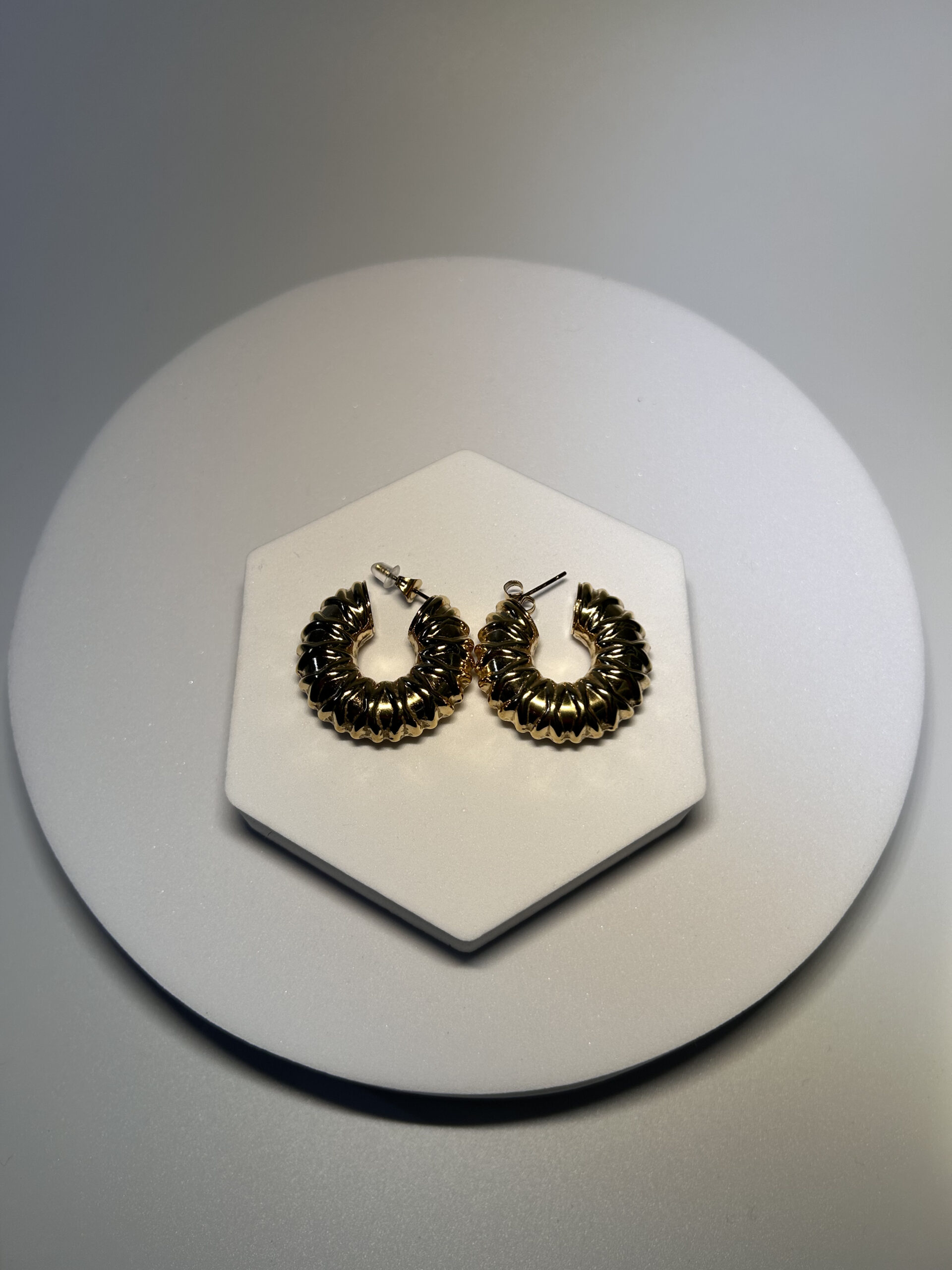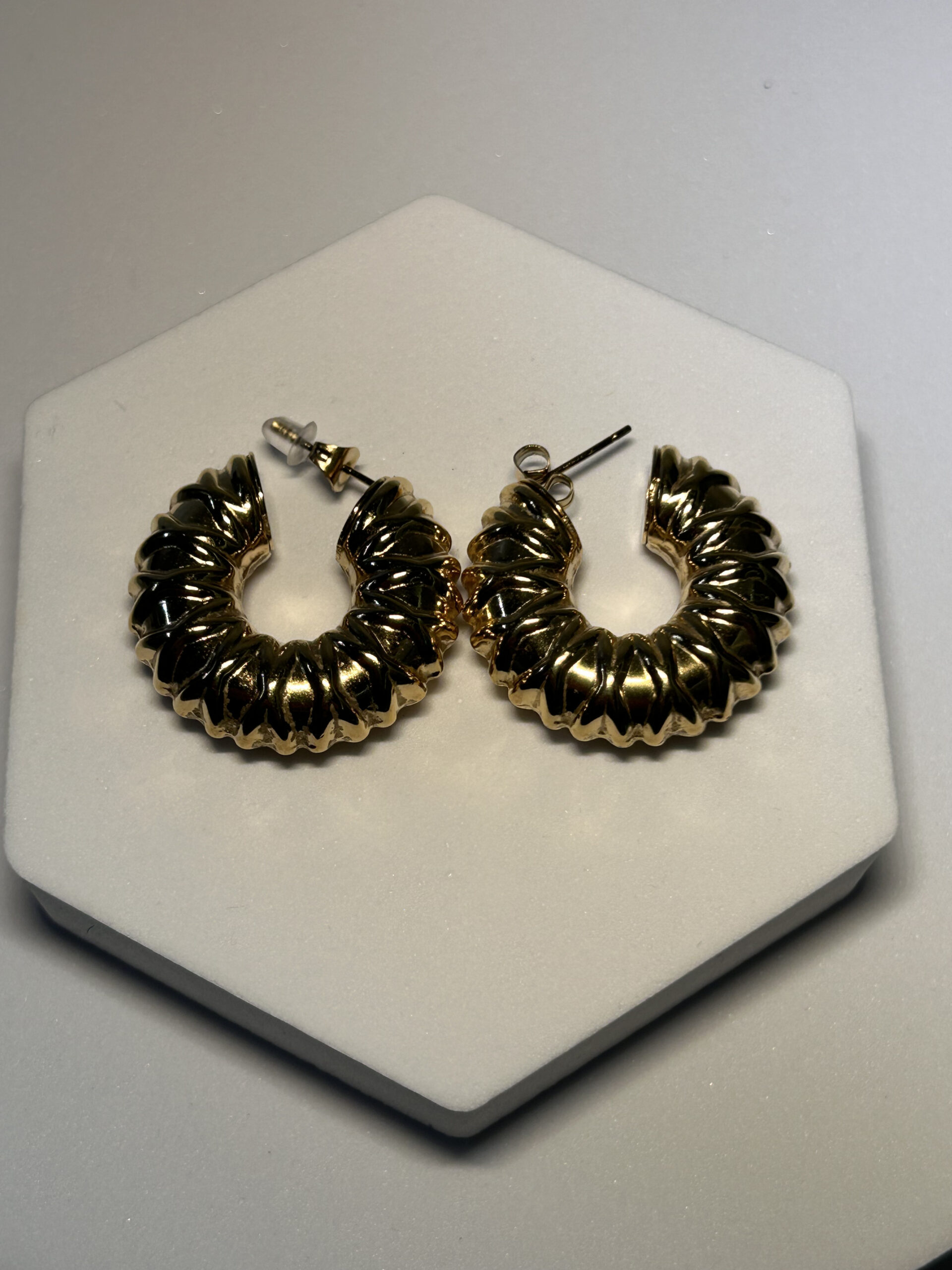 Pendientes de aro abierto, con superficie labrada. Cierre de mariposa. Cómodos de llevar, están huecos, no pesan.