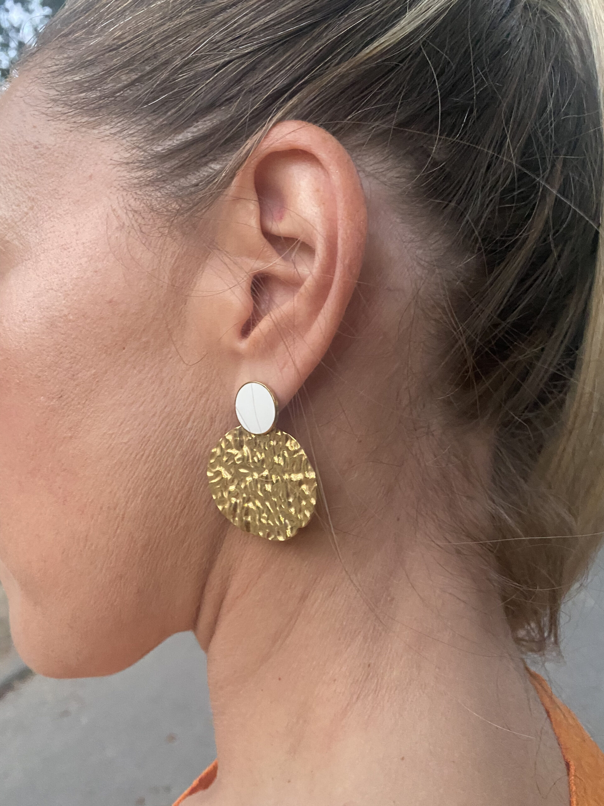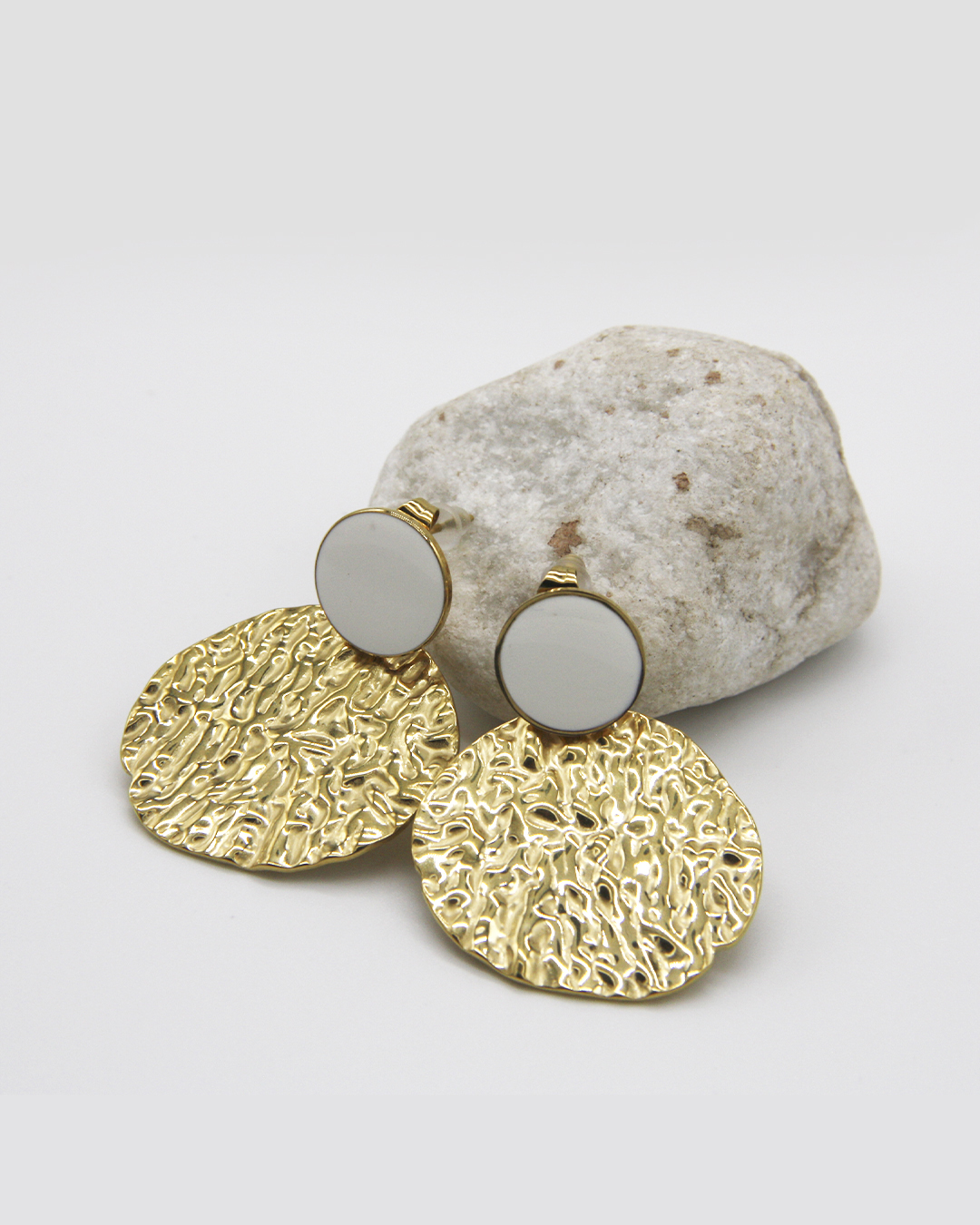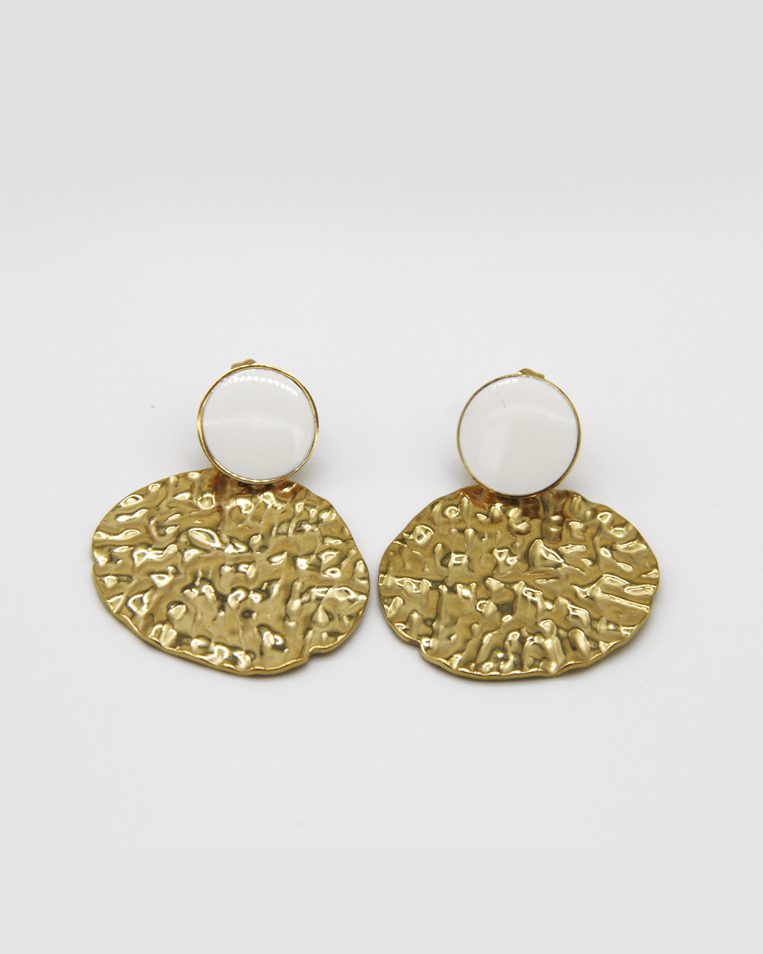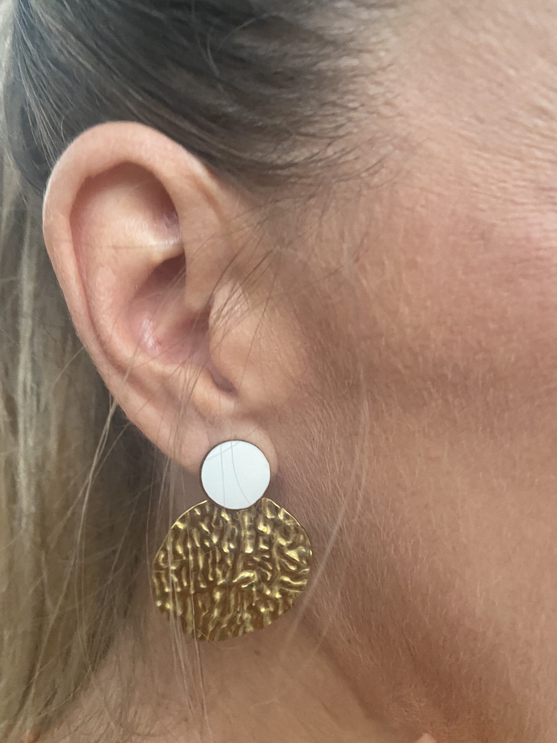 Pendientes de dos piezas, una lacada en blanco que se ajusta a la oreja mediante cierre de mariposa y la colgante, de superficie irregular. Cómodos de llevar, no pesan.