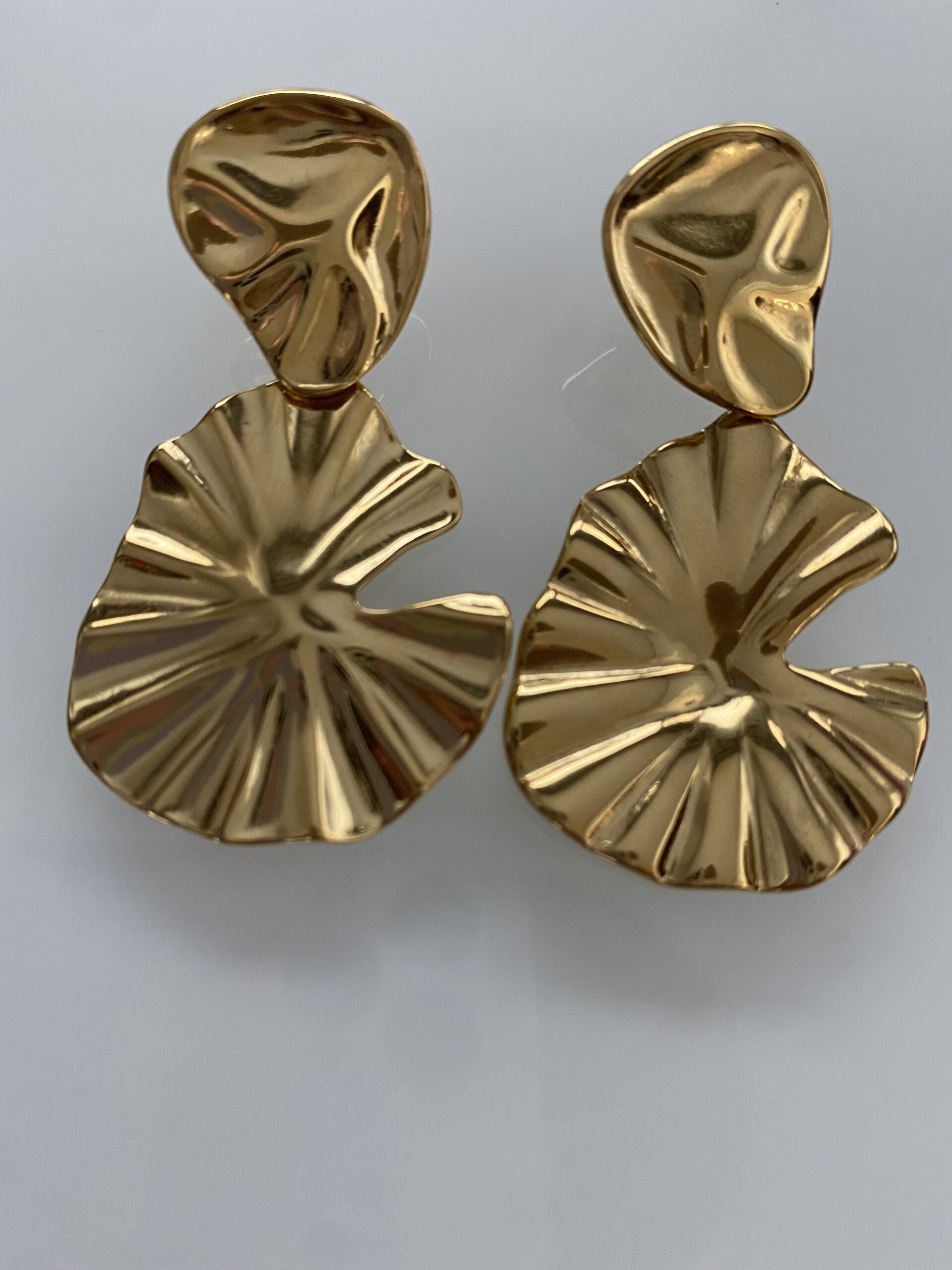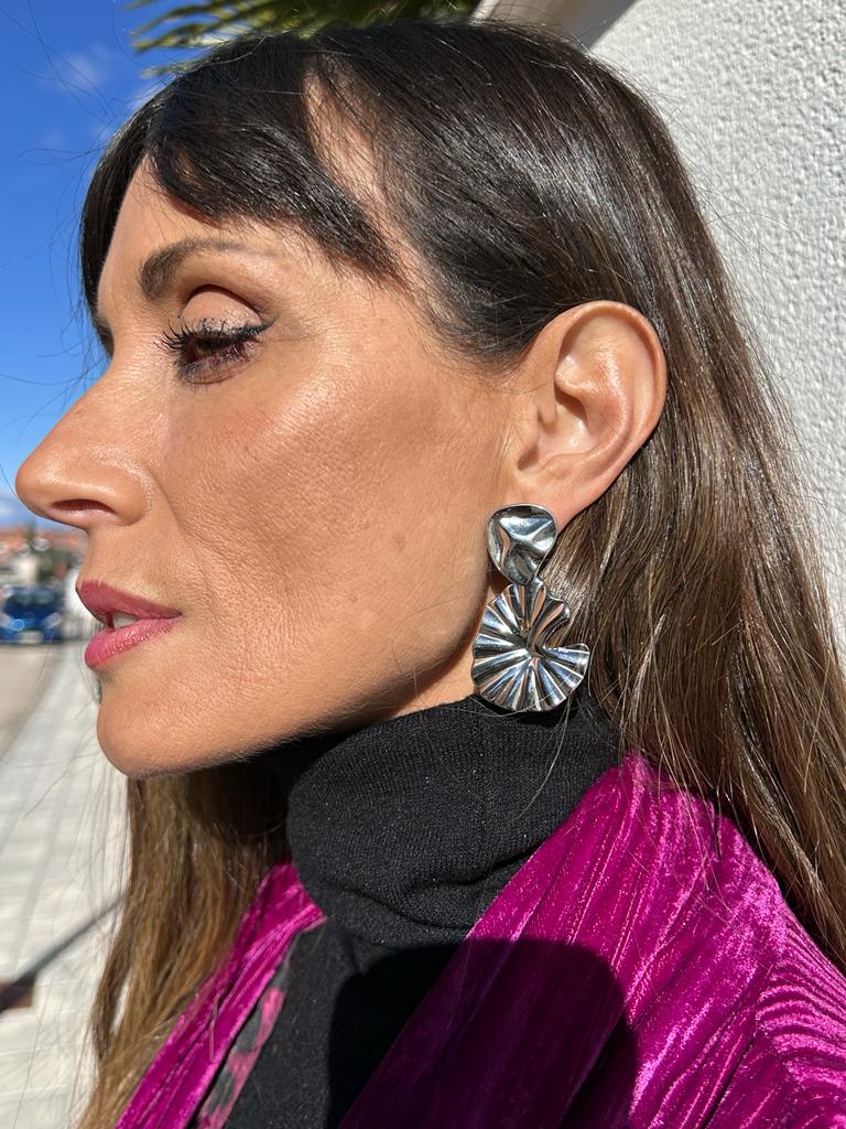 Pendientes de dos piezas, en forma de flor de superficie irregular. Disponibles en chapado en oro y plata. Cierre mariposa. Cómodos, no pesan.