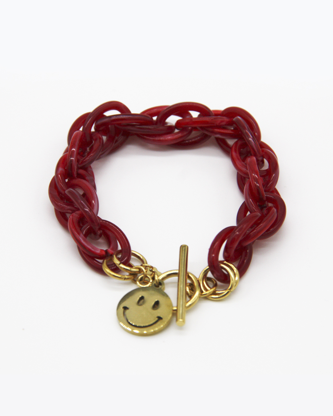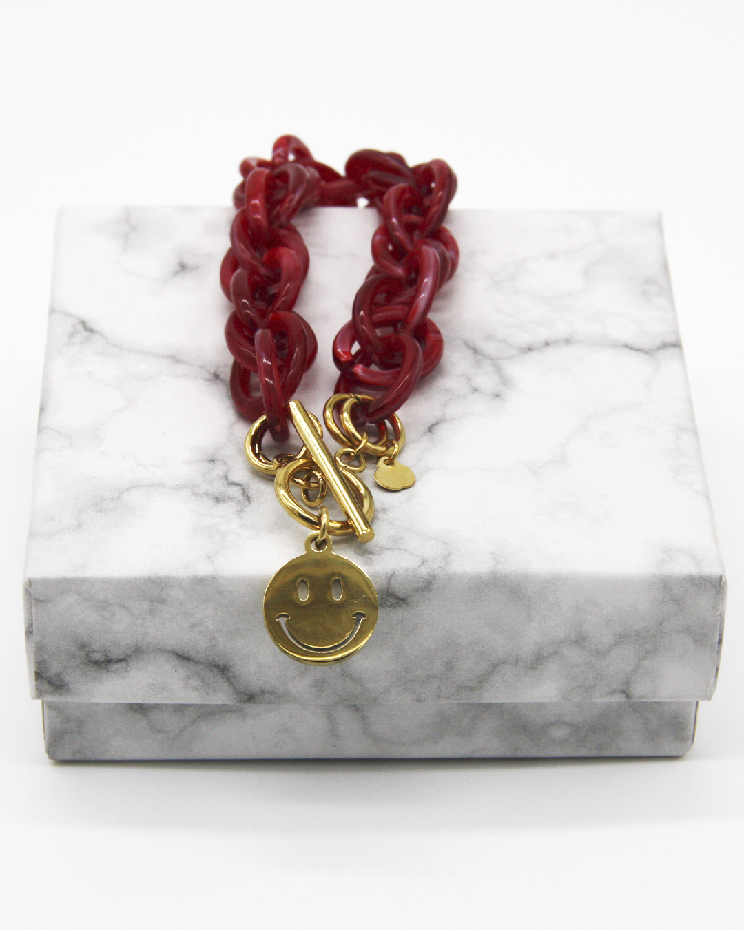 Pulsera de cadena formada por eslabones de resina de color rojo oscuro, con cierre de palanca en acero inoxidable chapado en oro. Detalle de charm smiley colgante en dicho cierre.