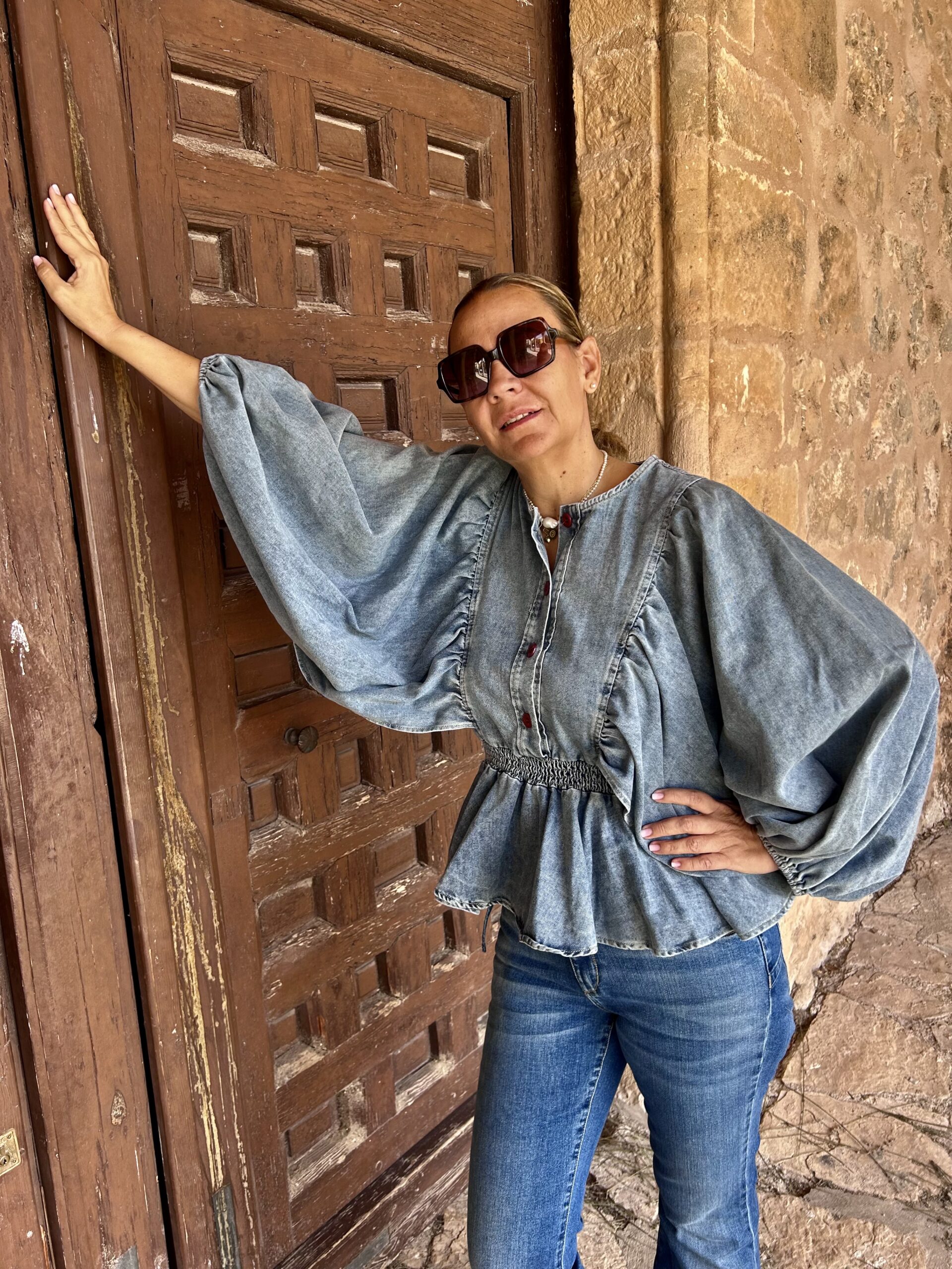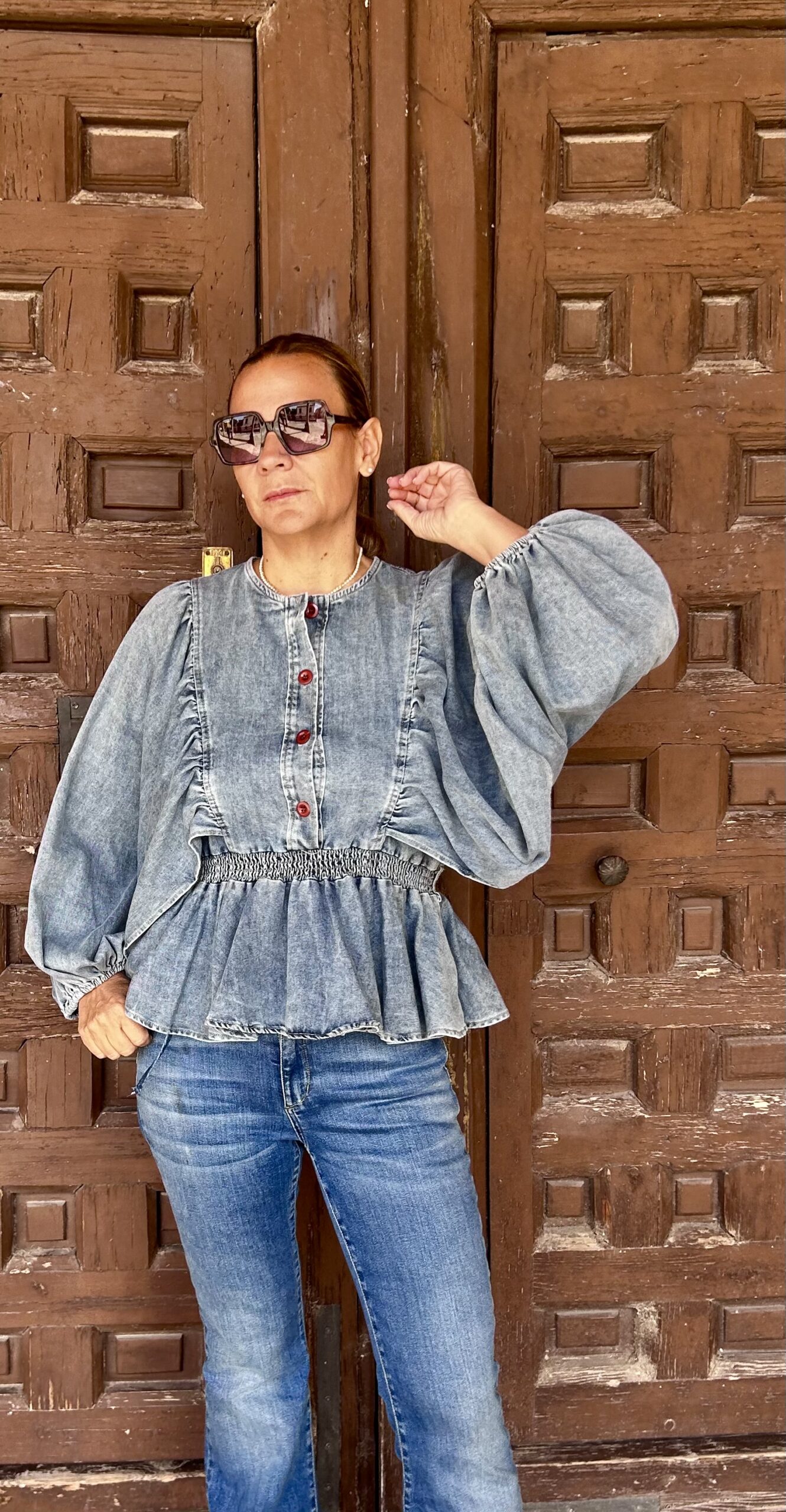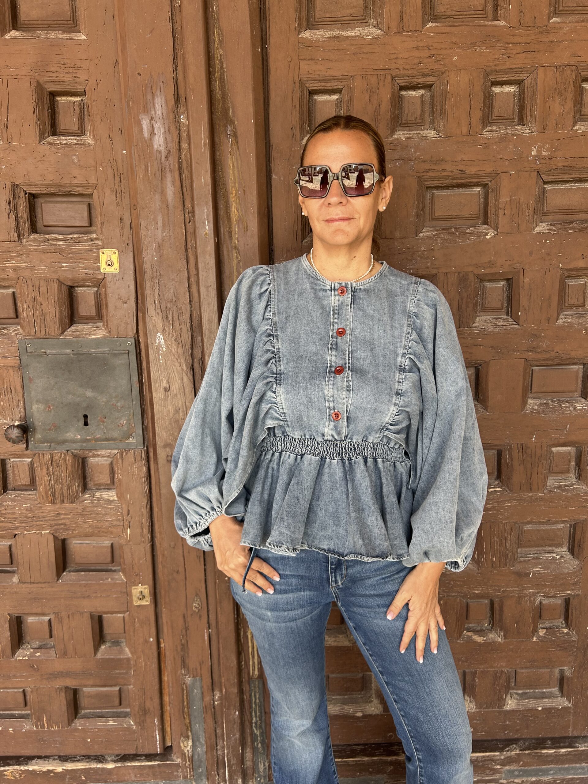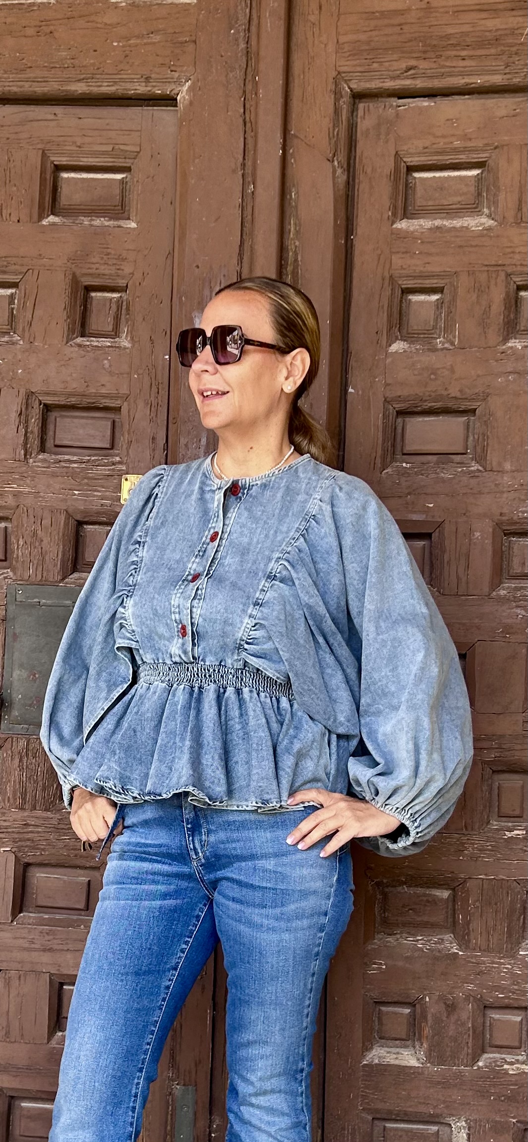 Camisa de tejido vaquero con manga tipo capa muy ancha. Cintura engomada que termina en volante. Puños engomados. Abotonada hasta debajo del pecho.