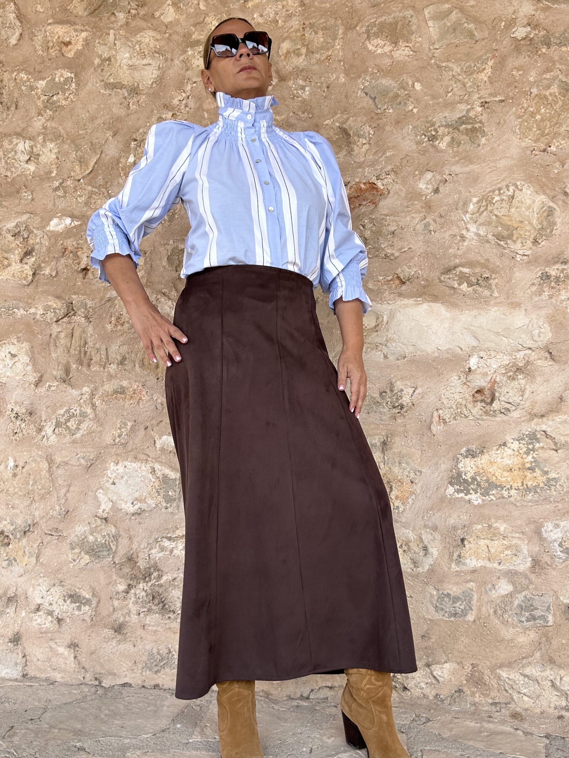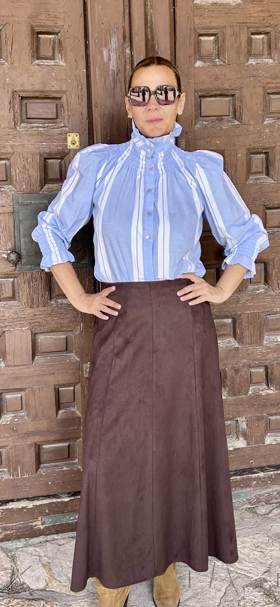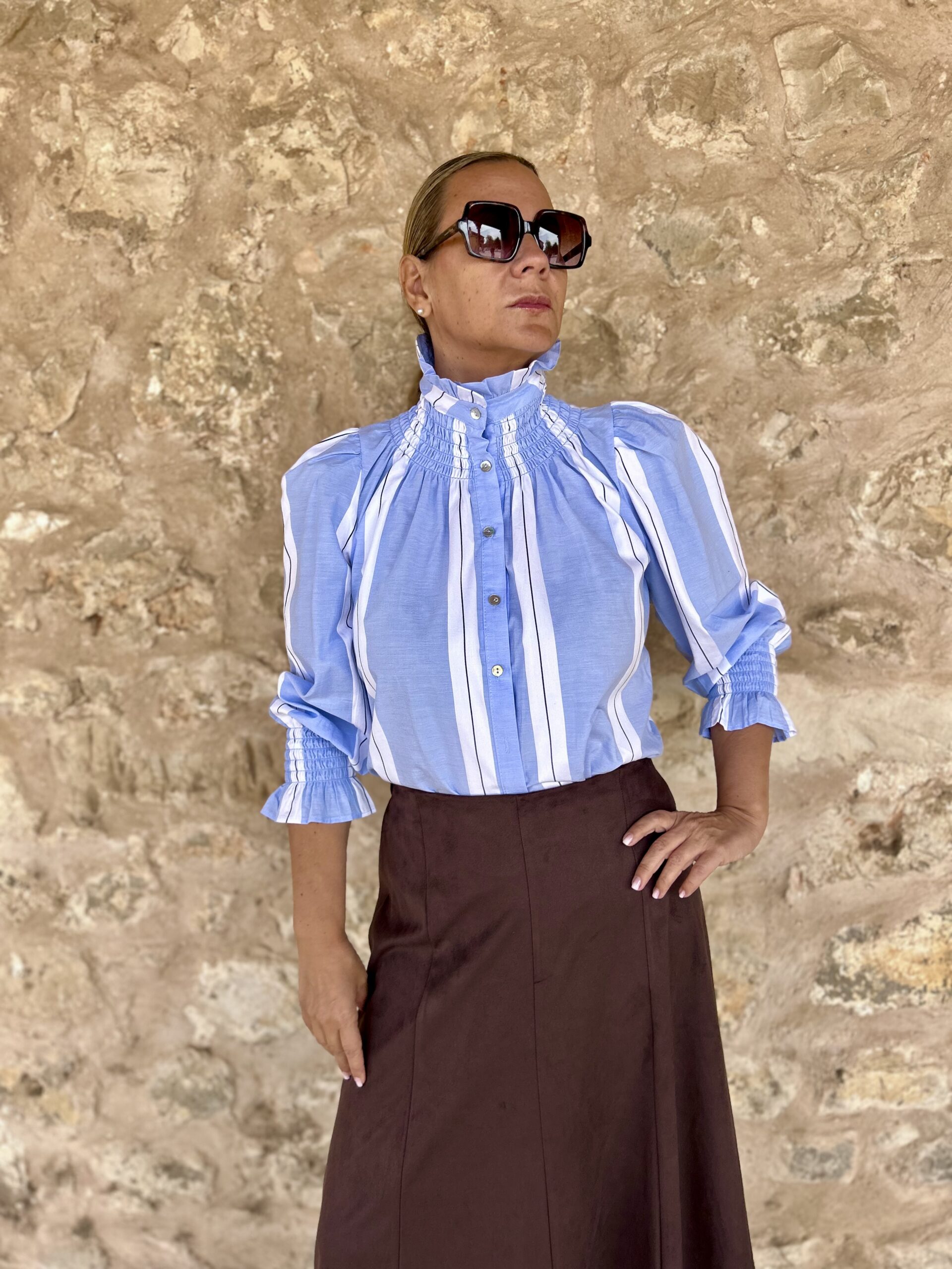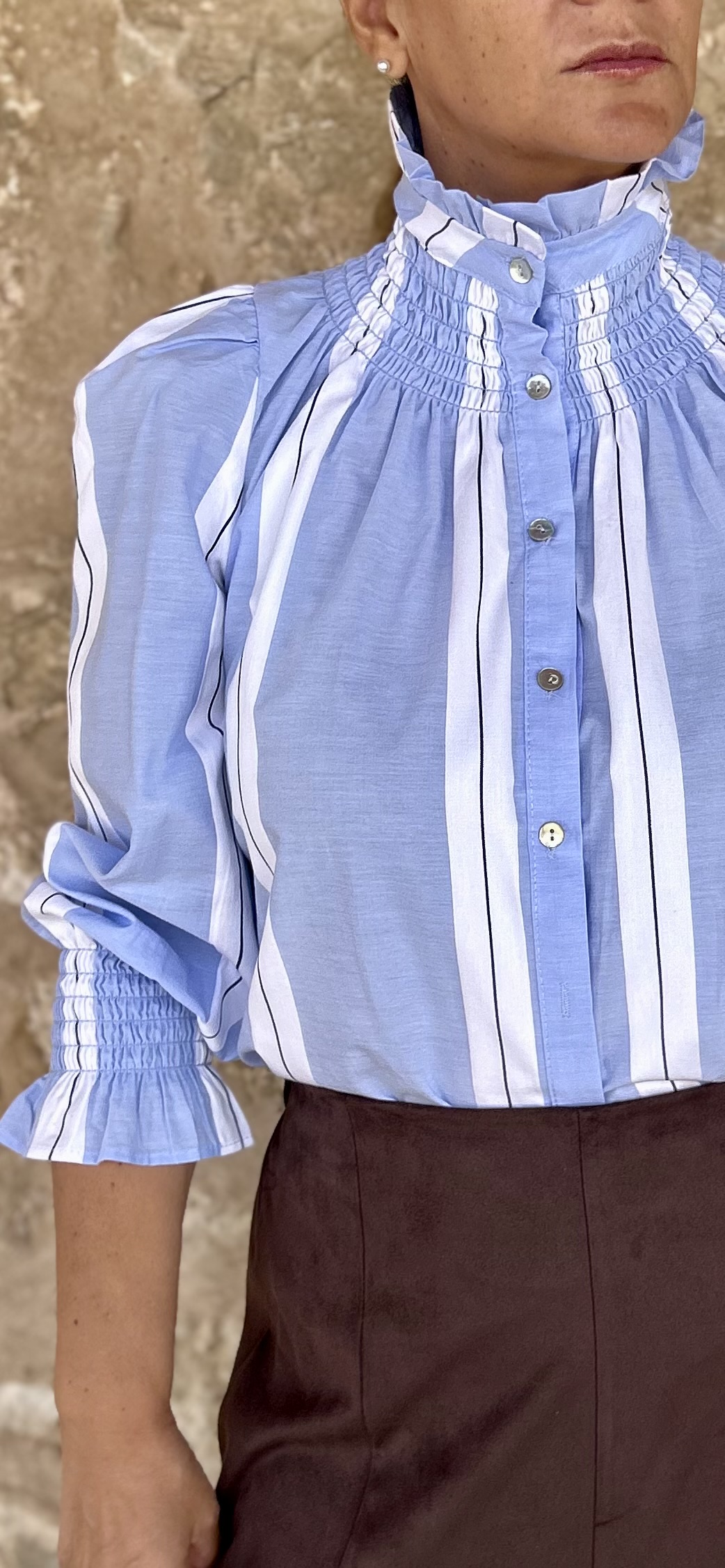 Camisa de rayas en tonos azul y blanco. Cuello muy elegante engomado y levantado. Puños engomados.