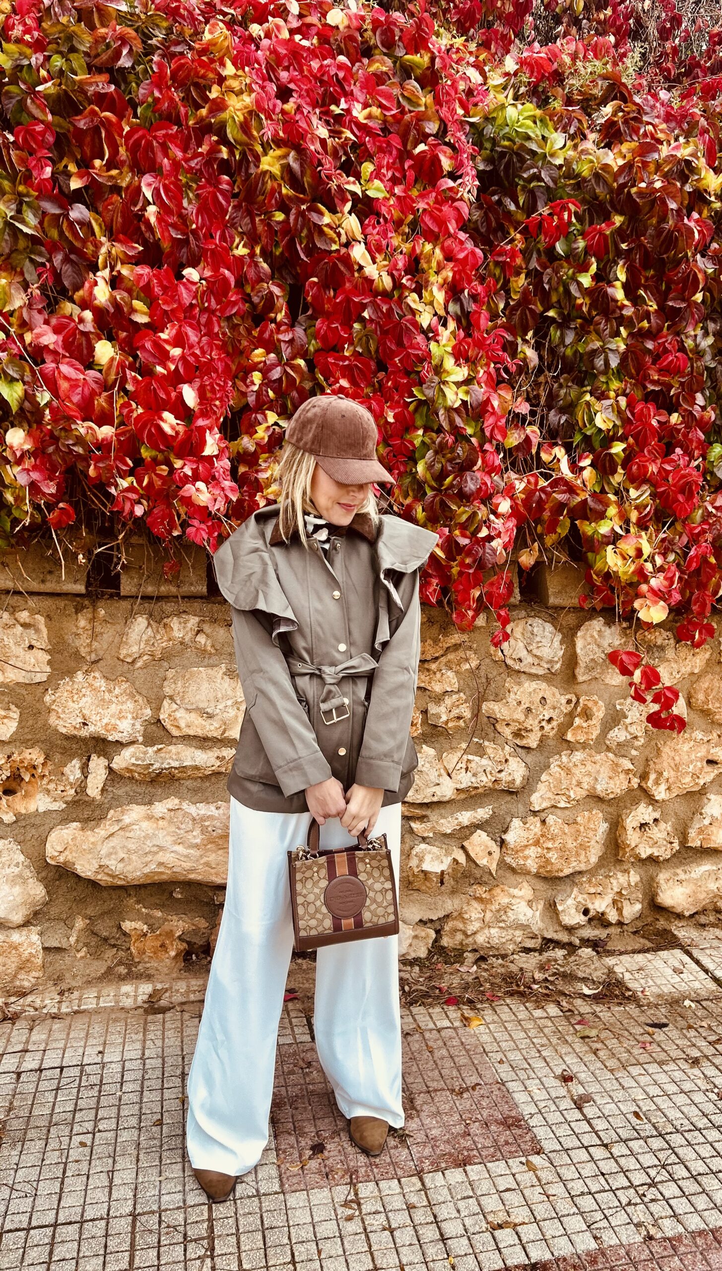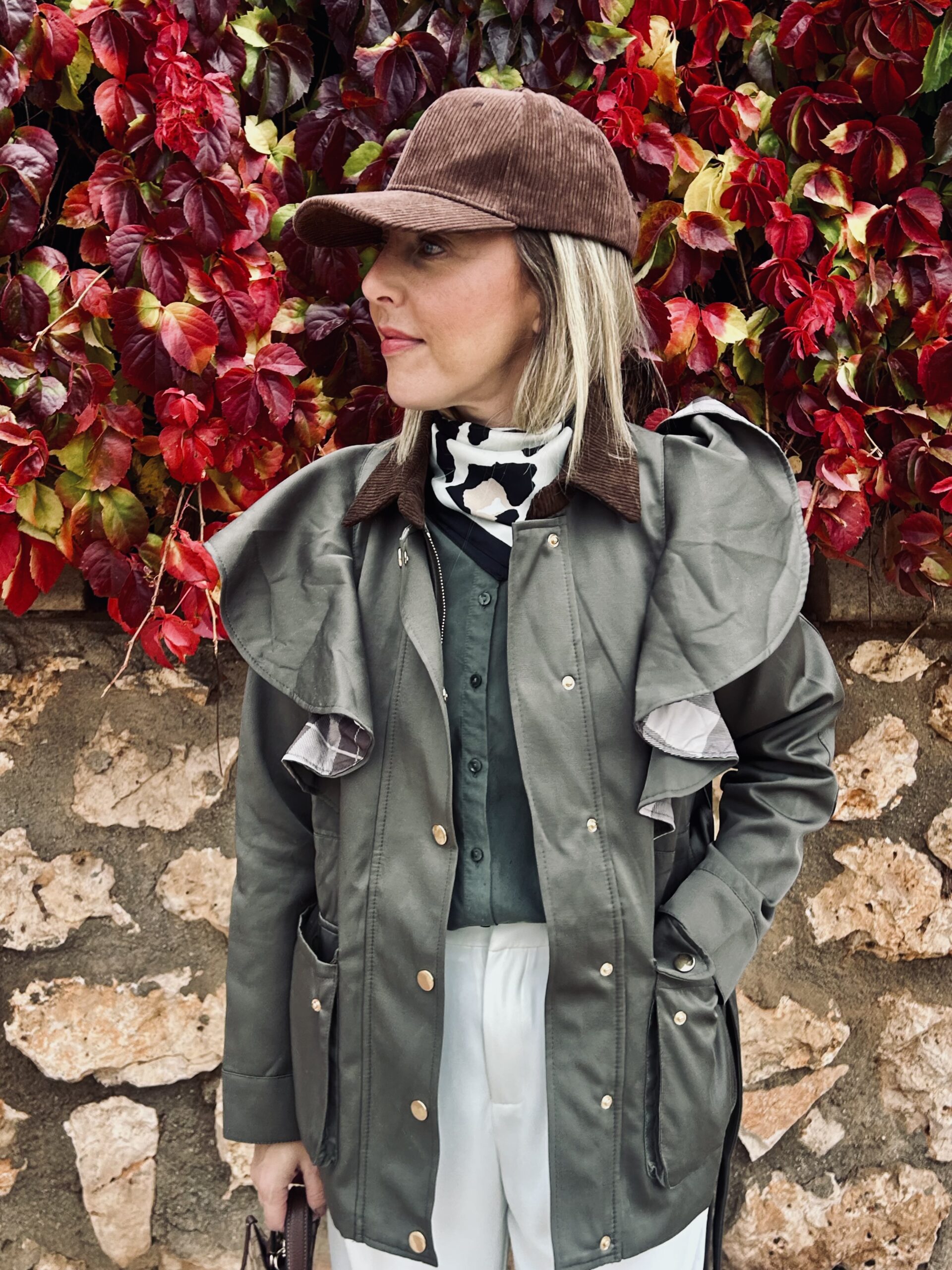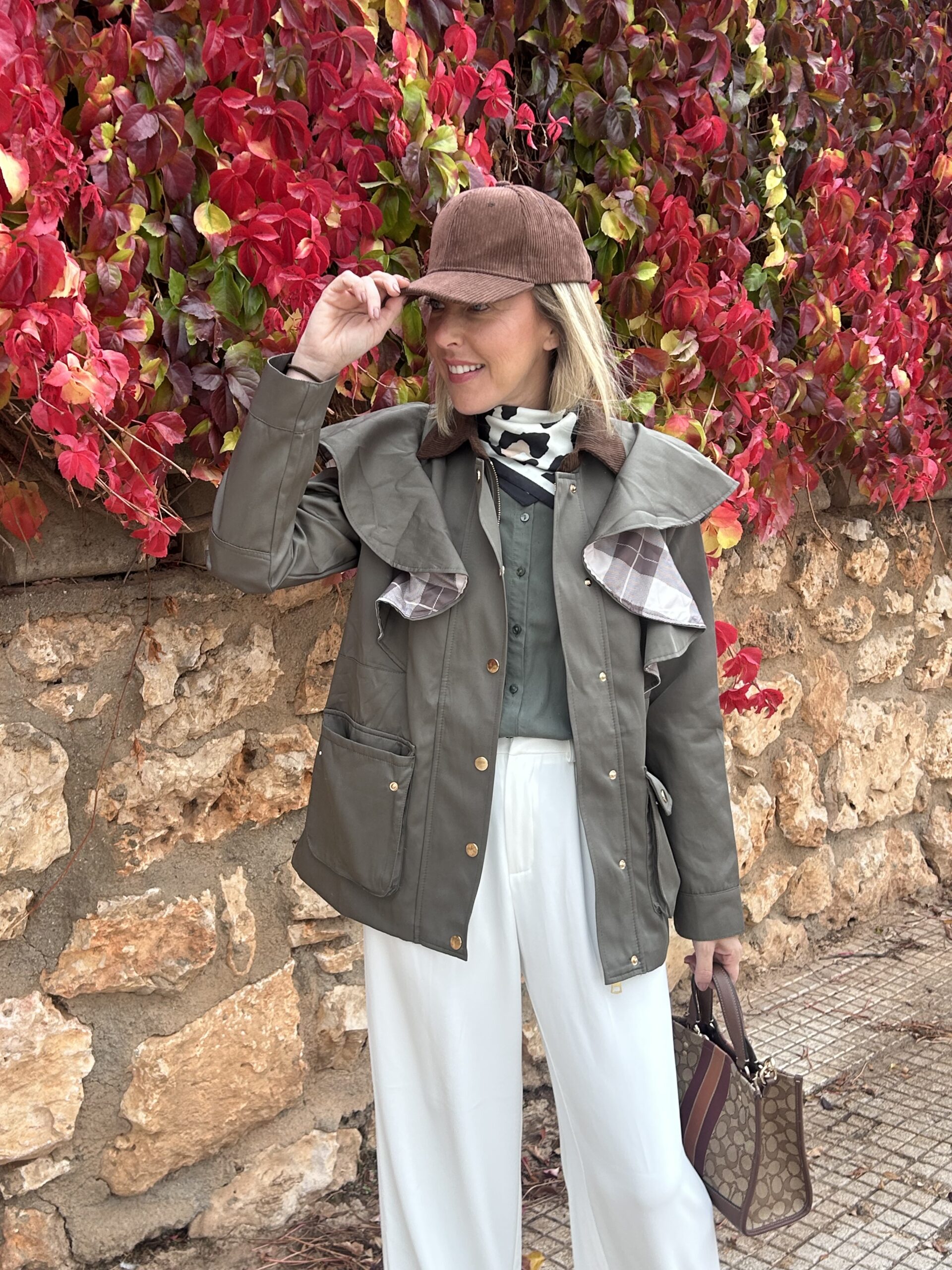 Parka tipo “Barbour”con volantes en el hombro. El reverso de los volantes con estampado de cuadros. Detalle de pana en el cuello. Cierre central con cremallera y botones corchete dorados. Llava cinturón con hebilla dorada.