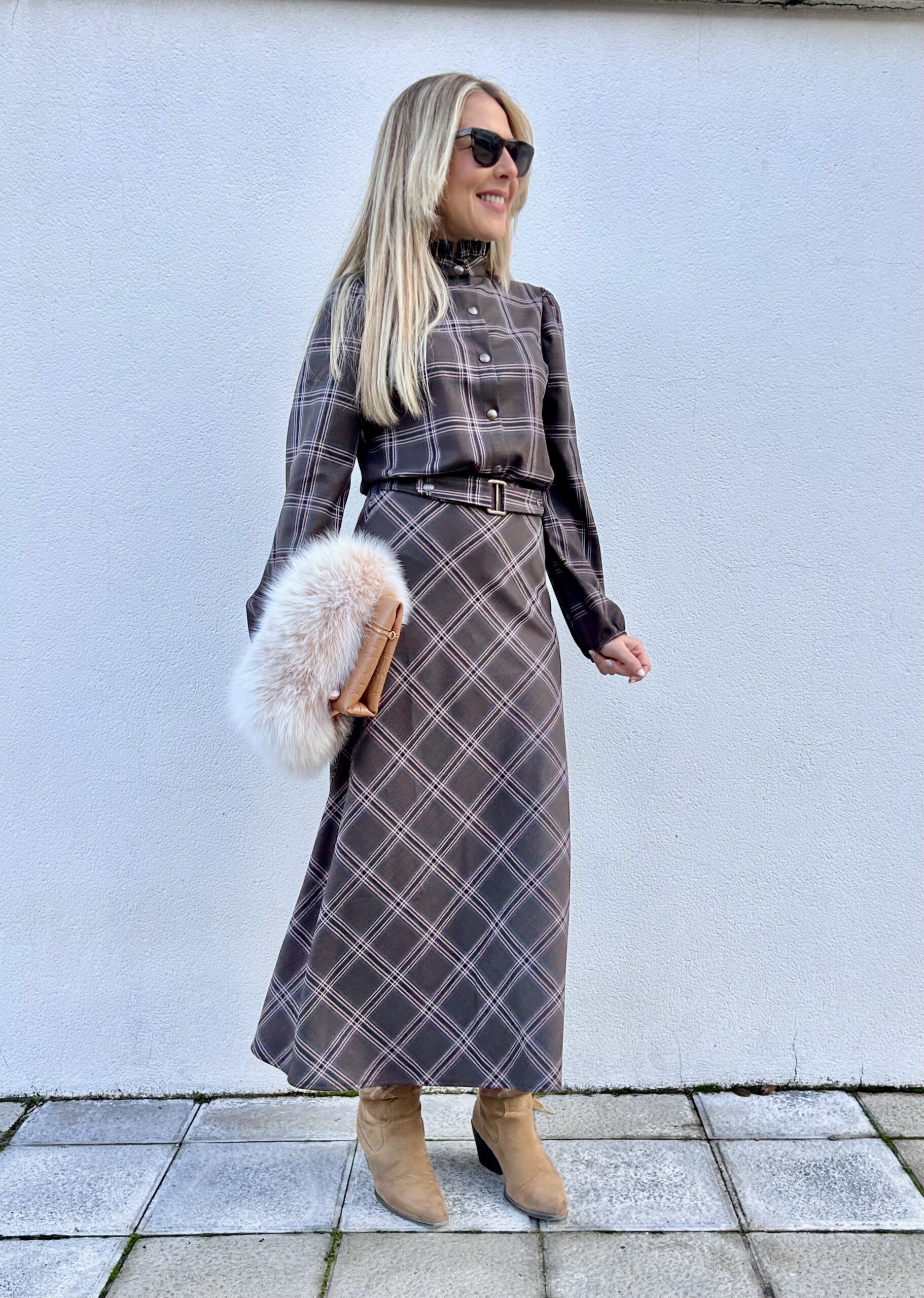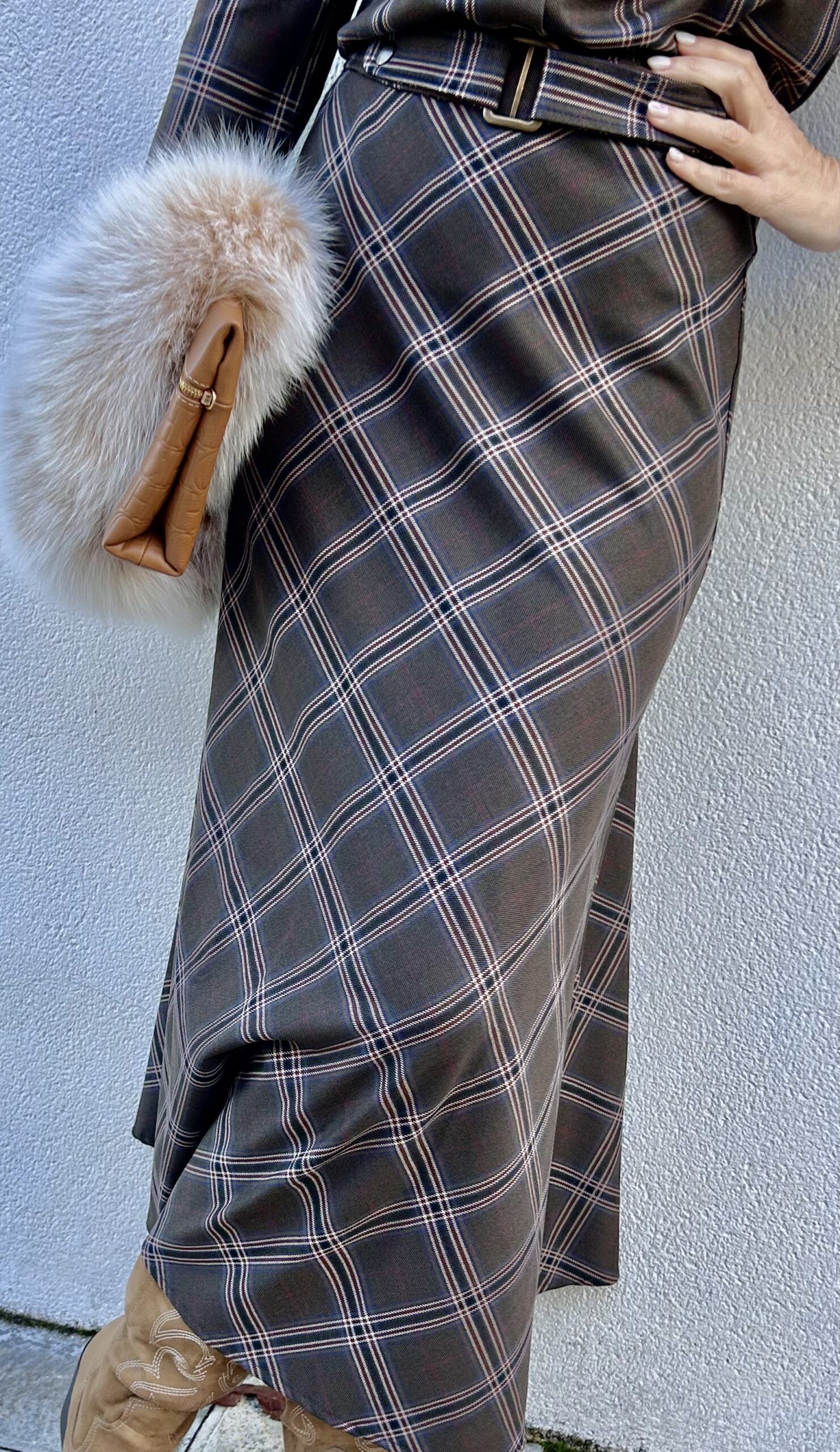 Falda con corte evasé con cinturón incorporado. Cierre trasero con cremallera.