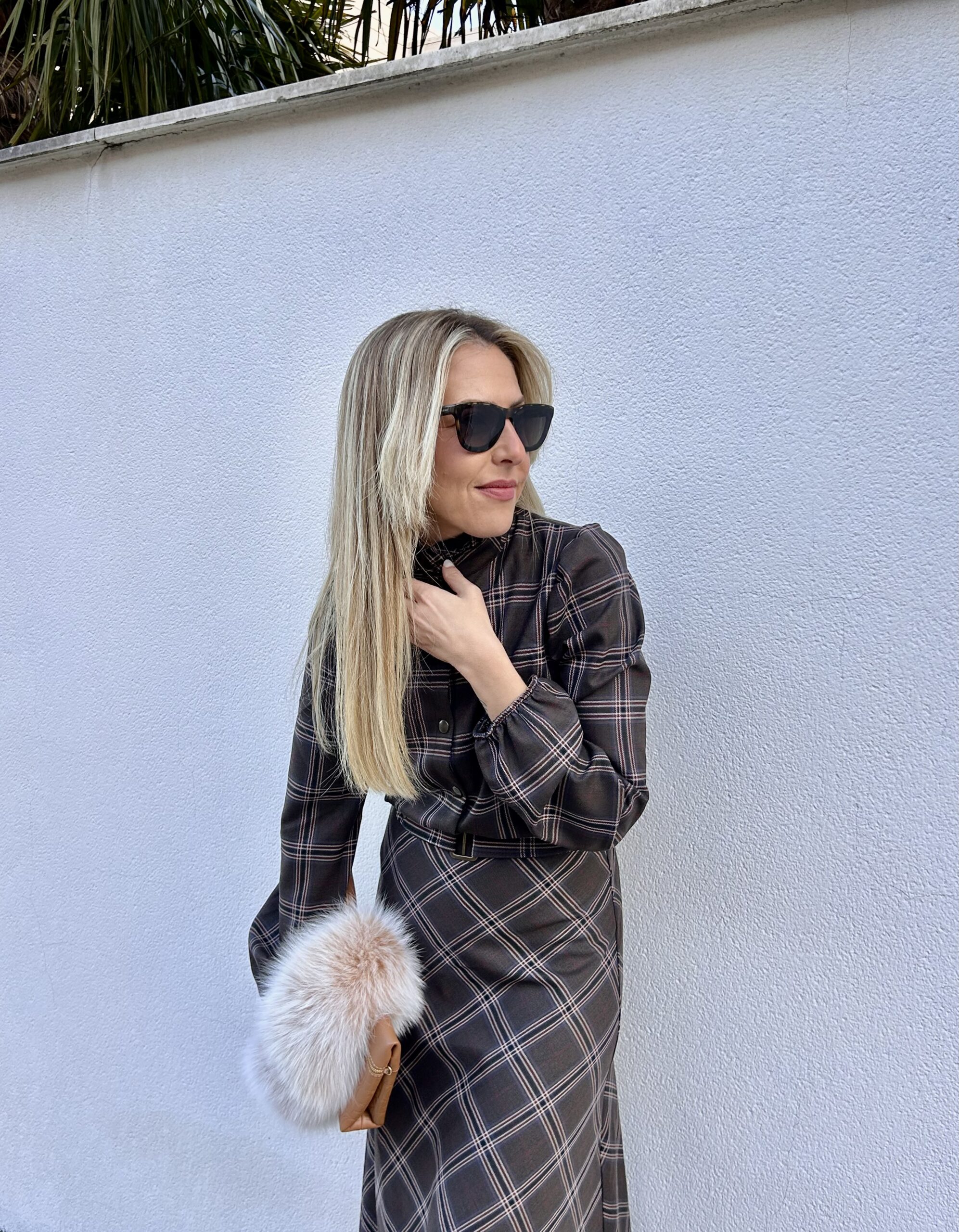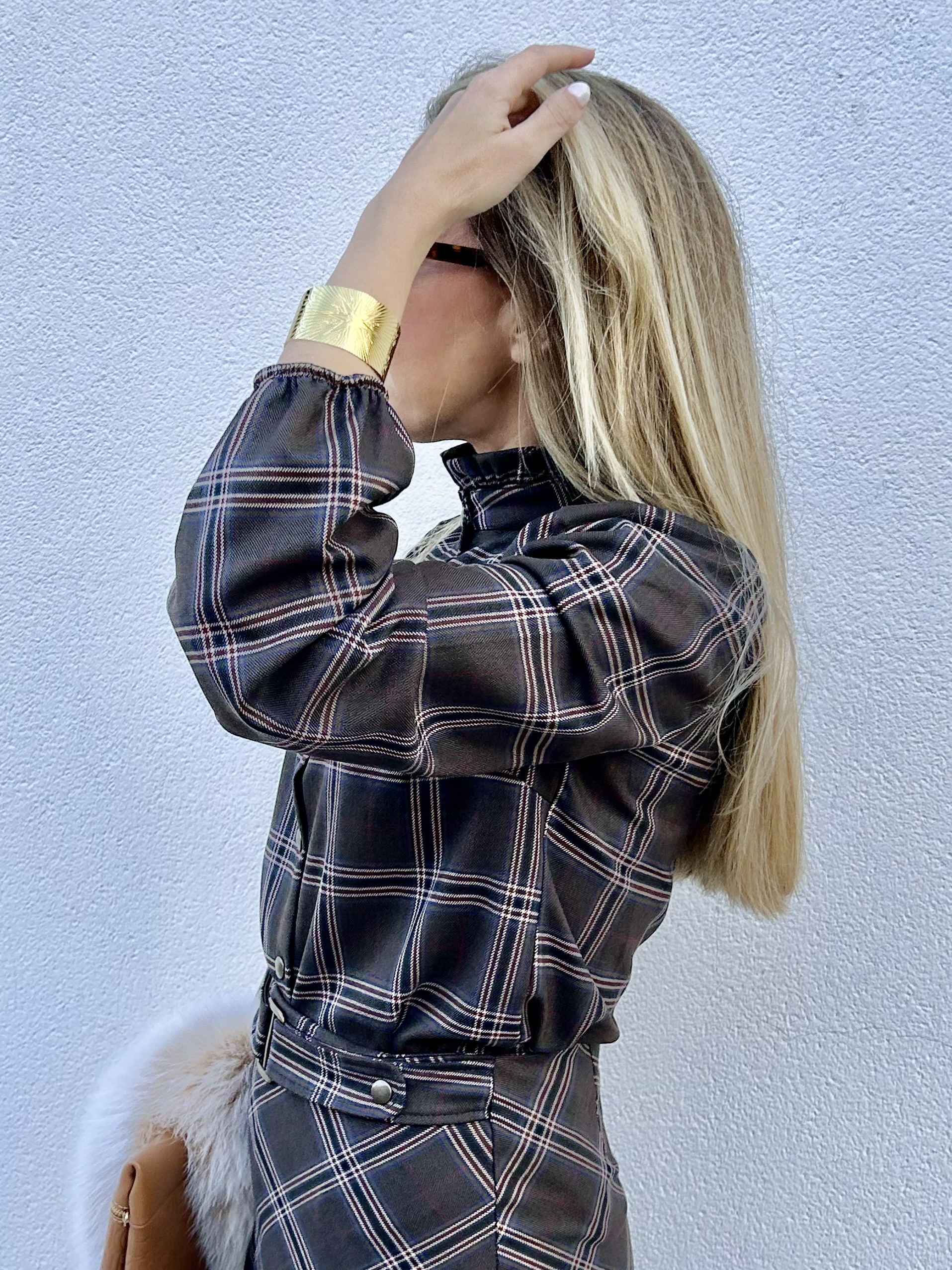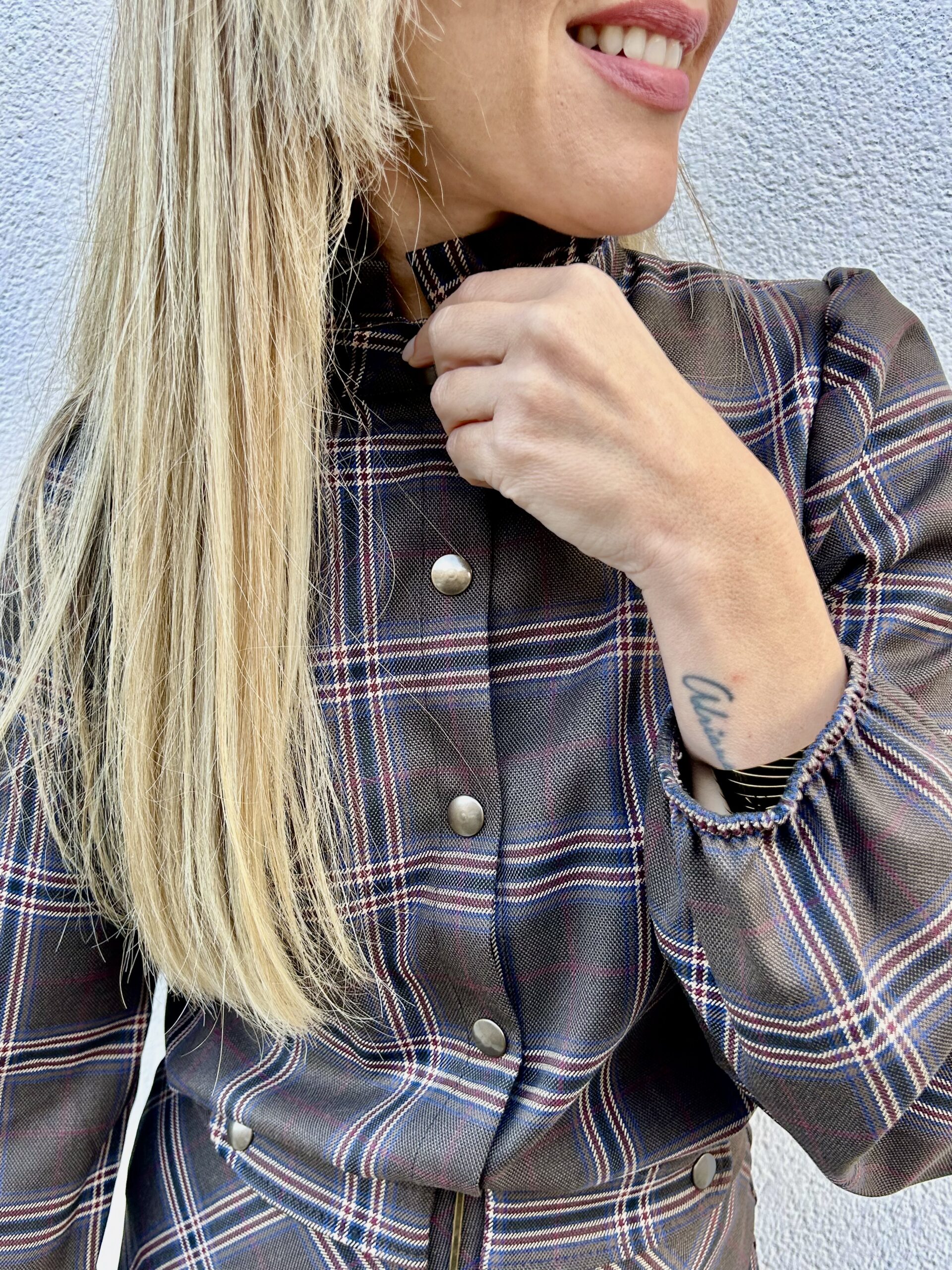 Blusa con cuello levantado y hombros ligeramente abullonados. Botonadura dorada tipo corchete.