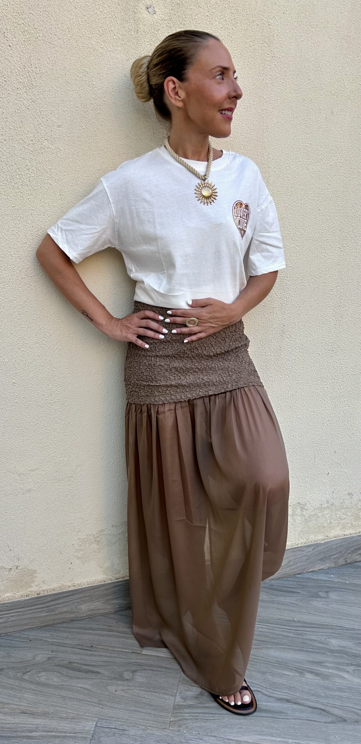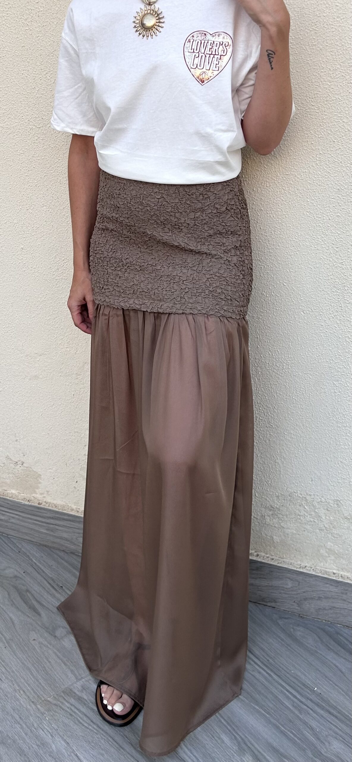Falda larga combinada de tejido rizado ligeramente elástico y gasa. Largo hasta los pies. Cierre con cremallera.