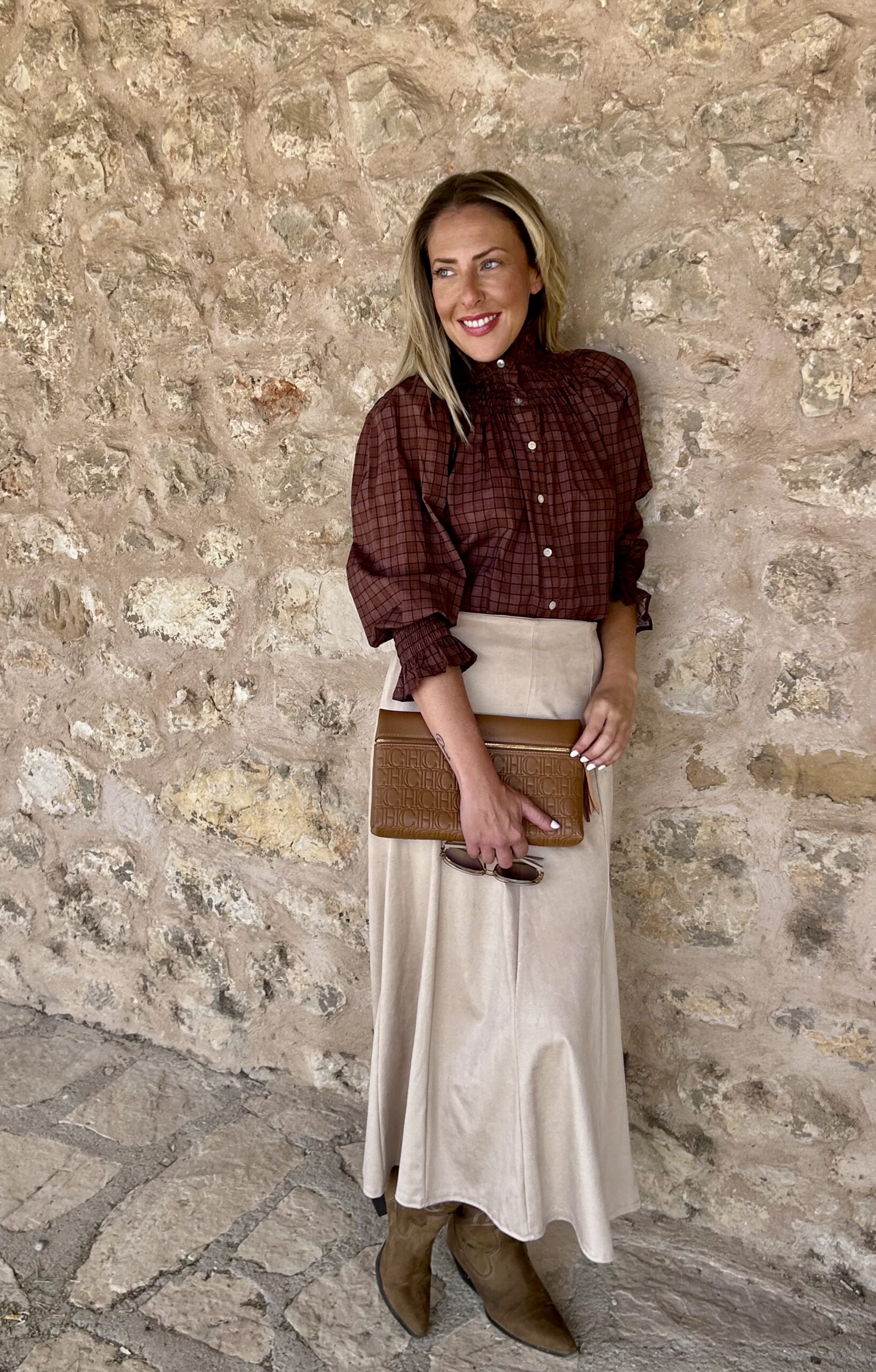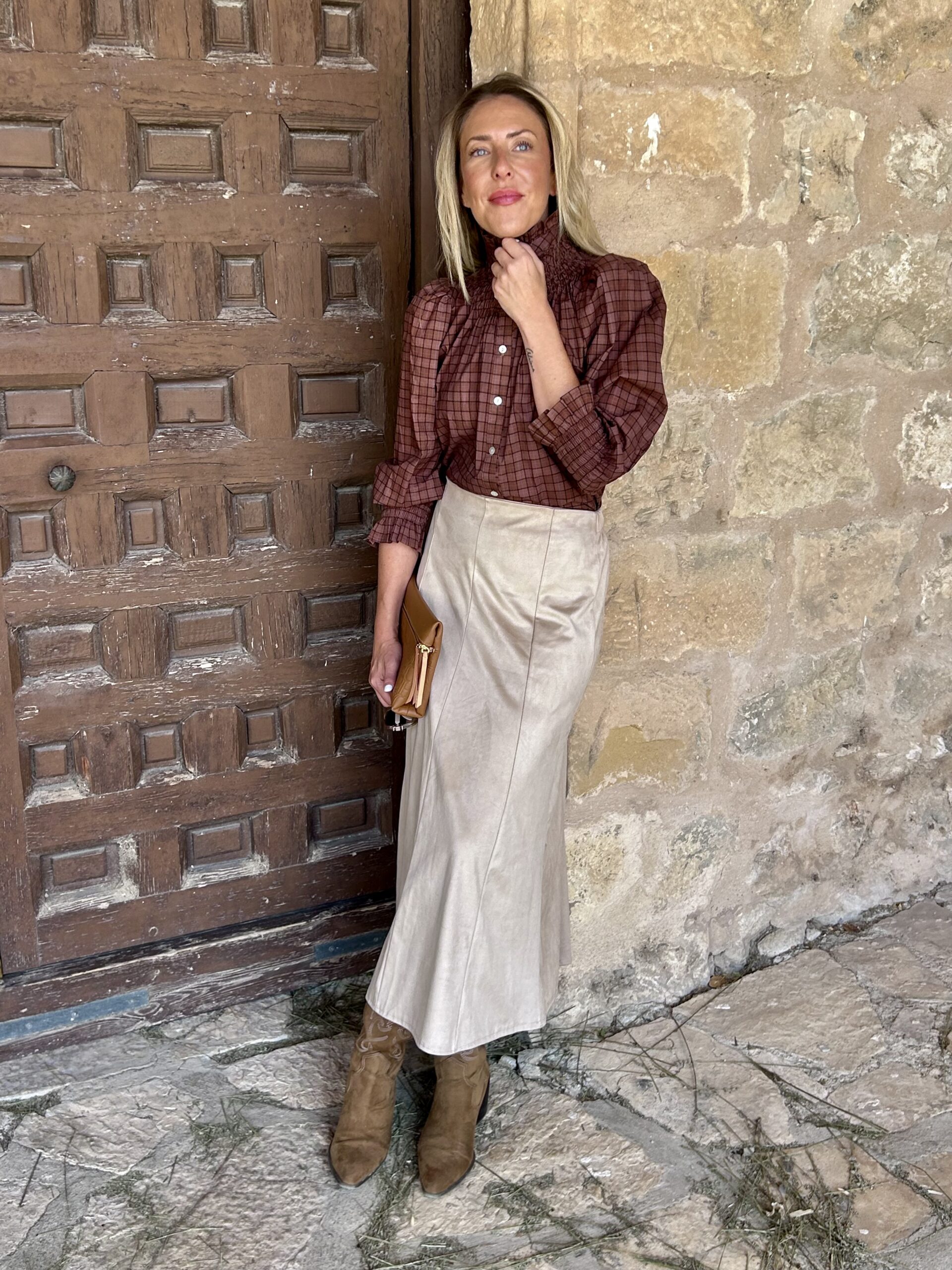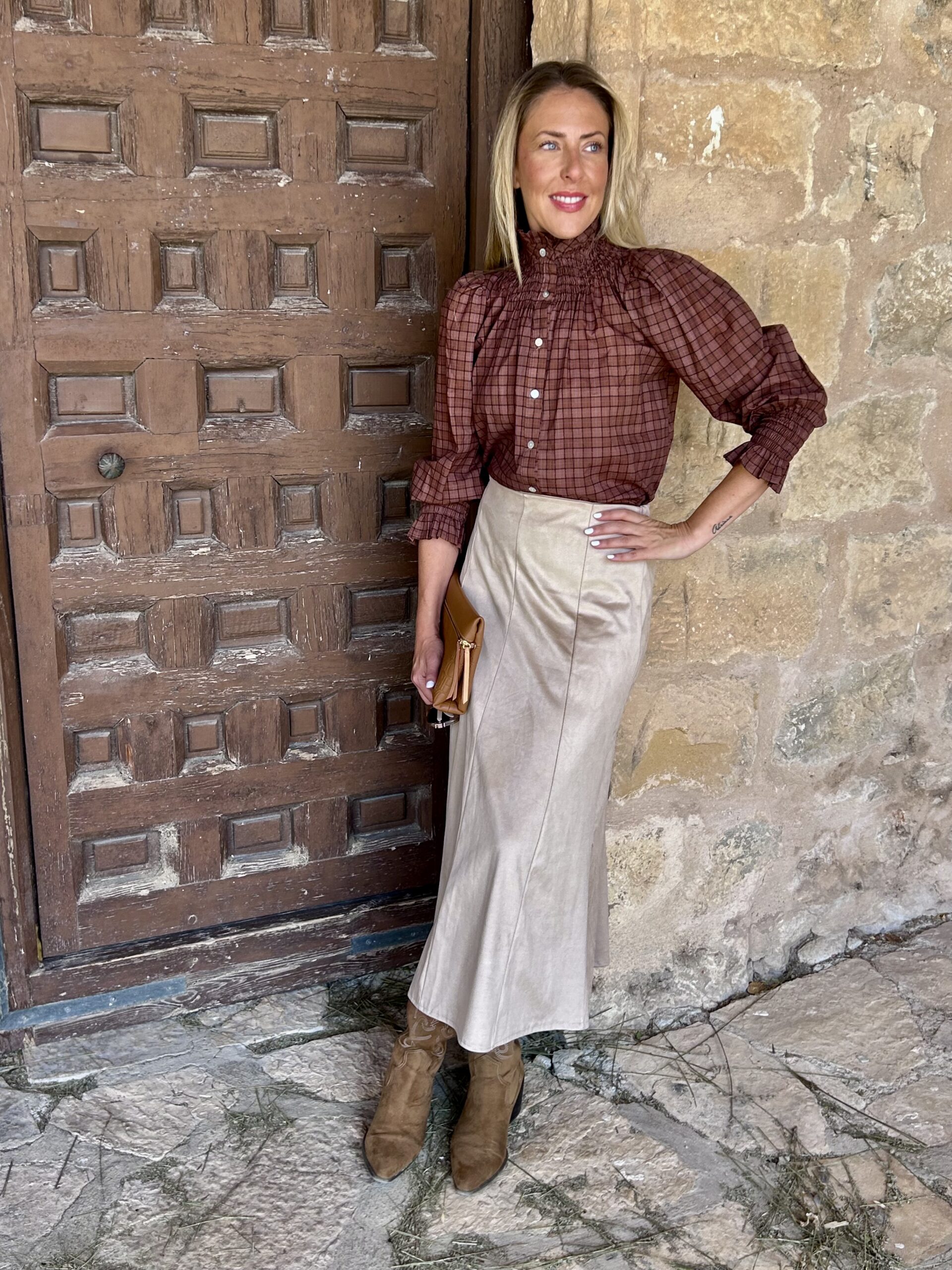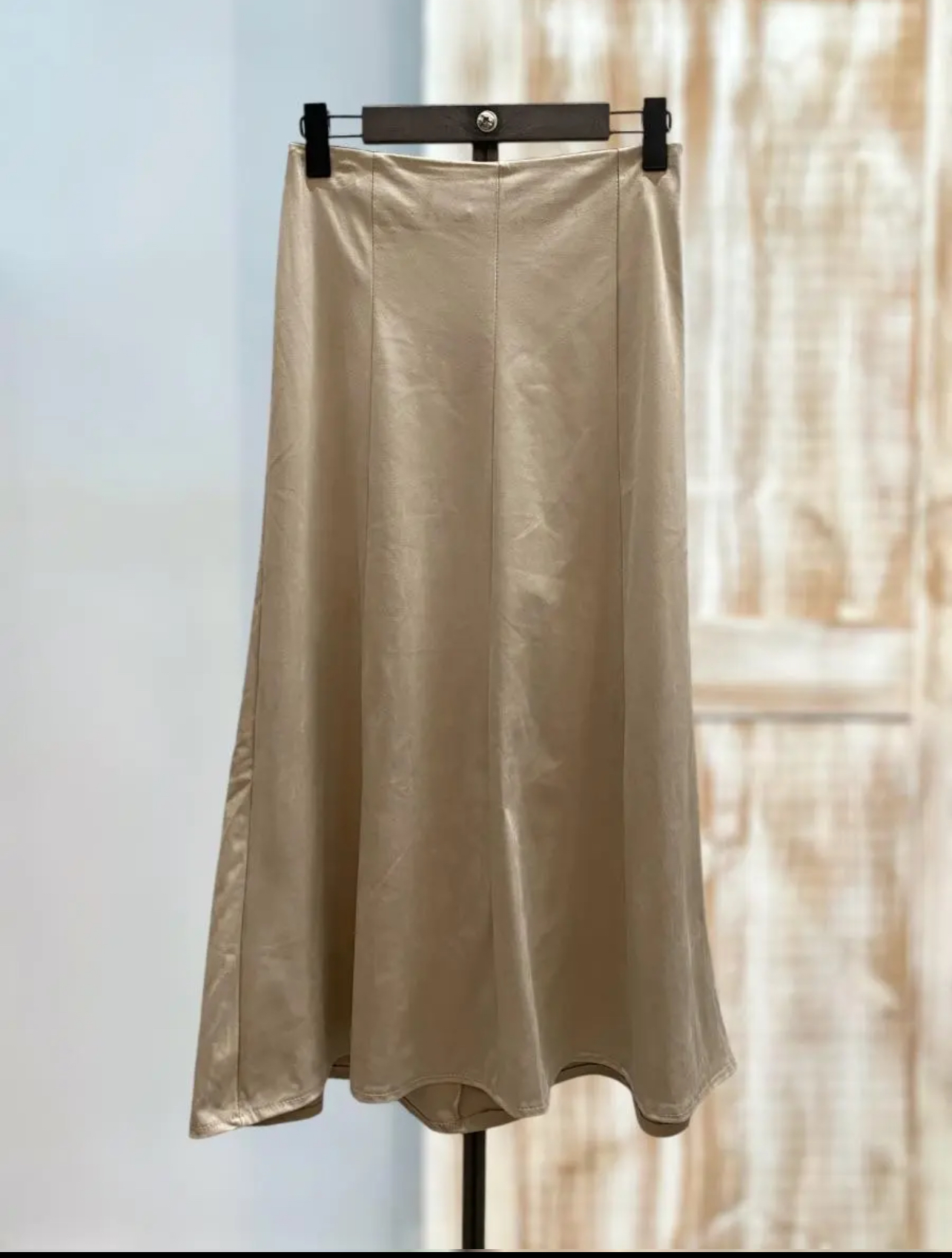 Falda de ante con corte en V. Cintura engomada. Muy cómoda.