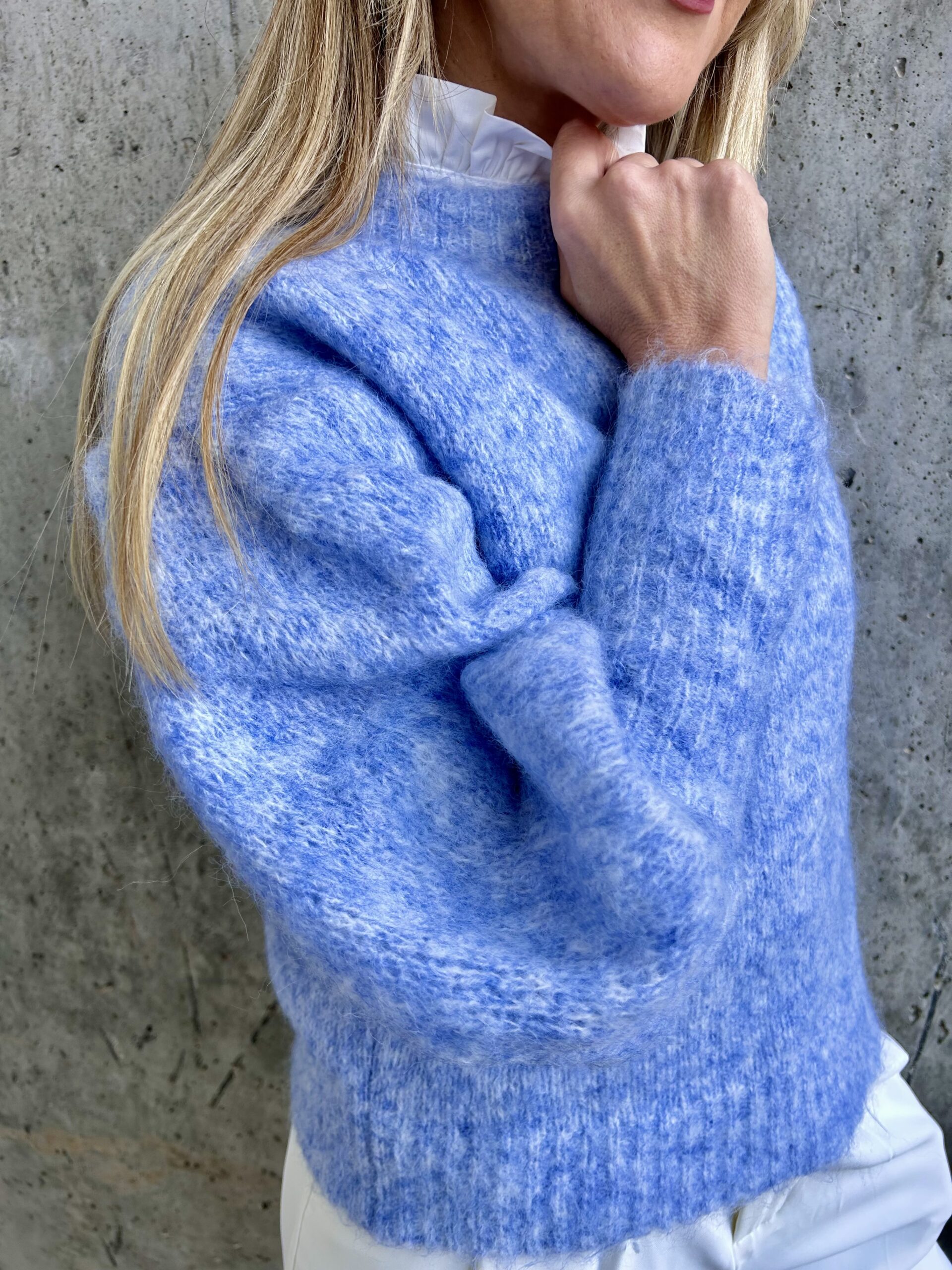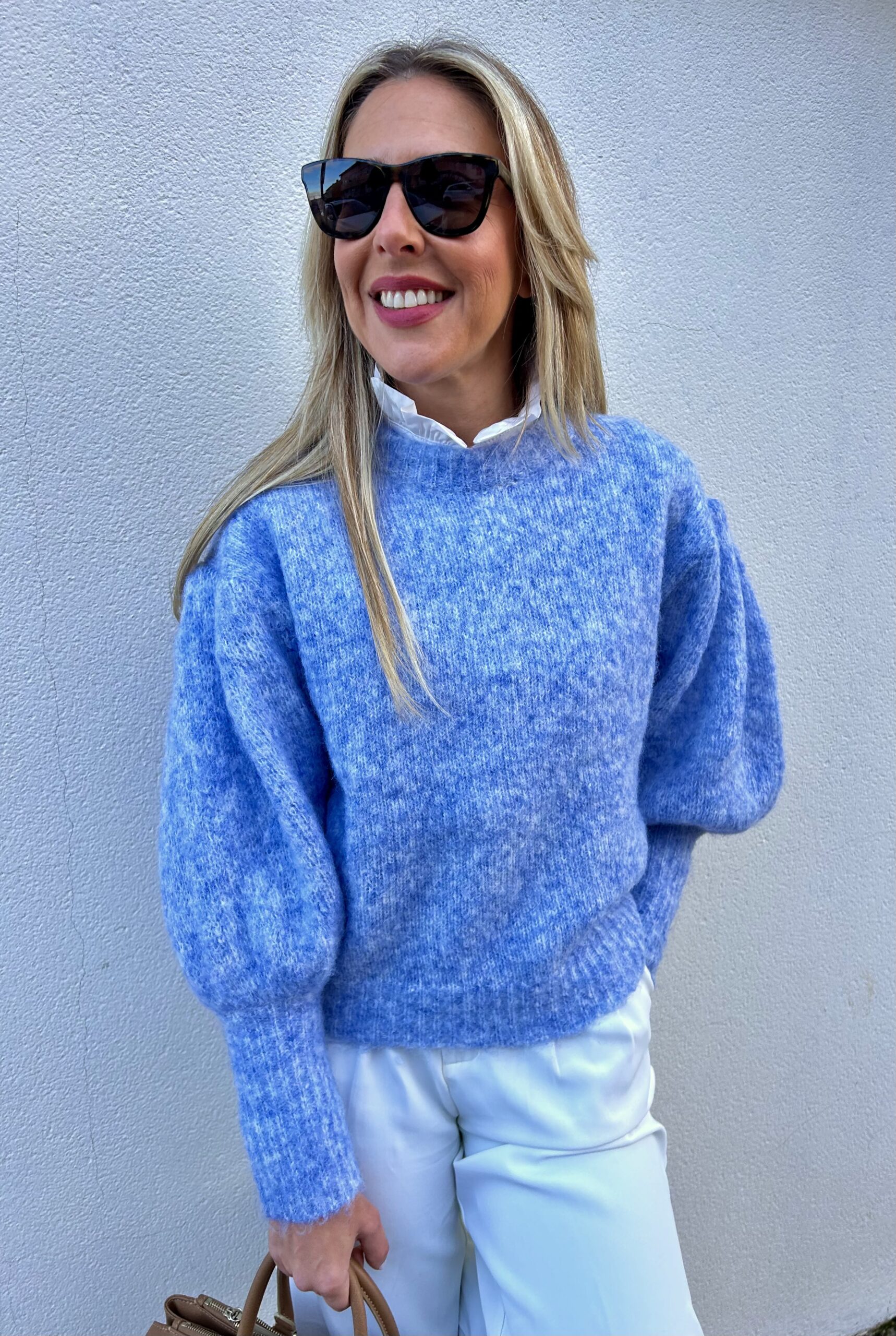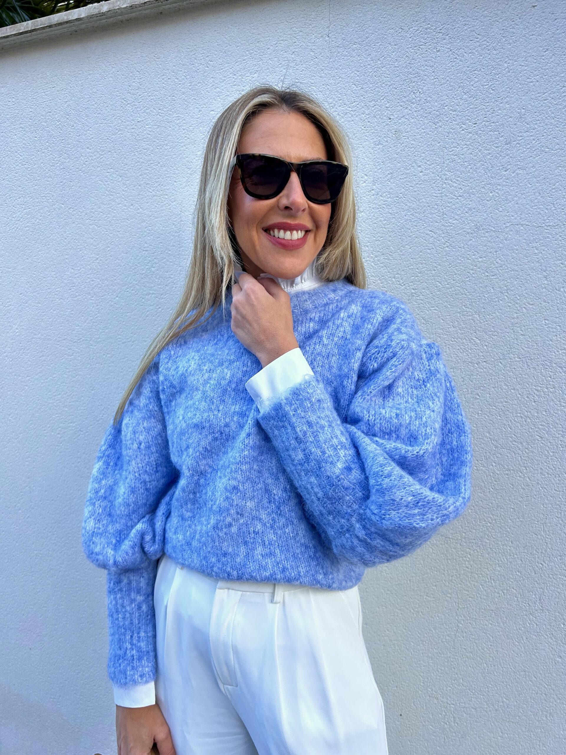 Jersey de cuello redondo y largo a cadera. Manga abullonada de muñeca a hombro.