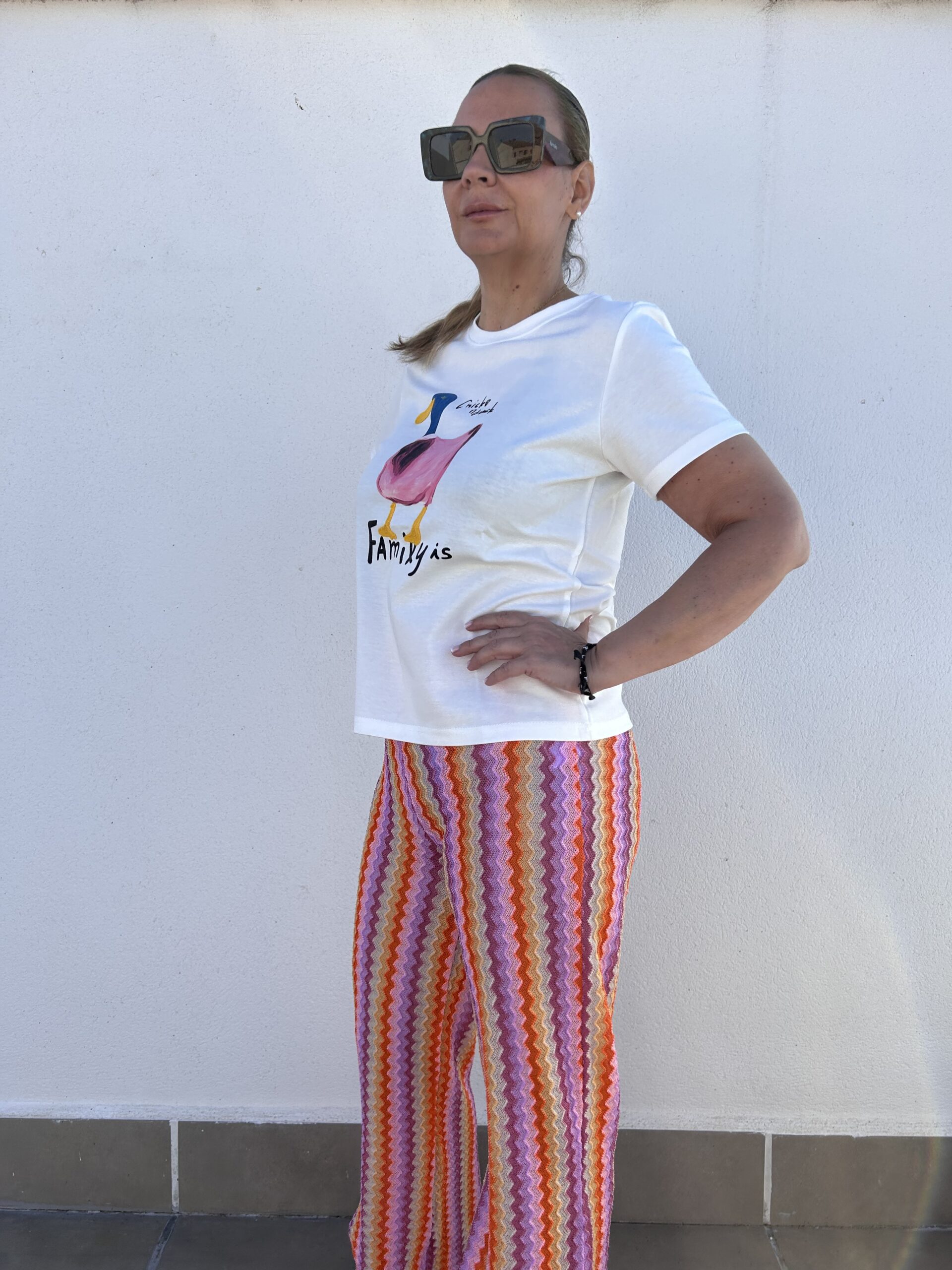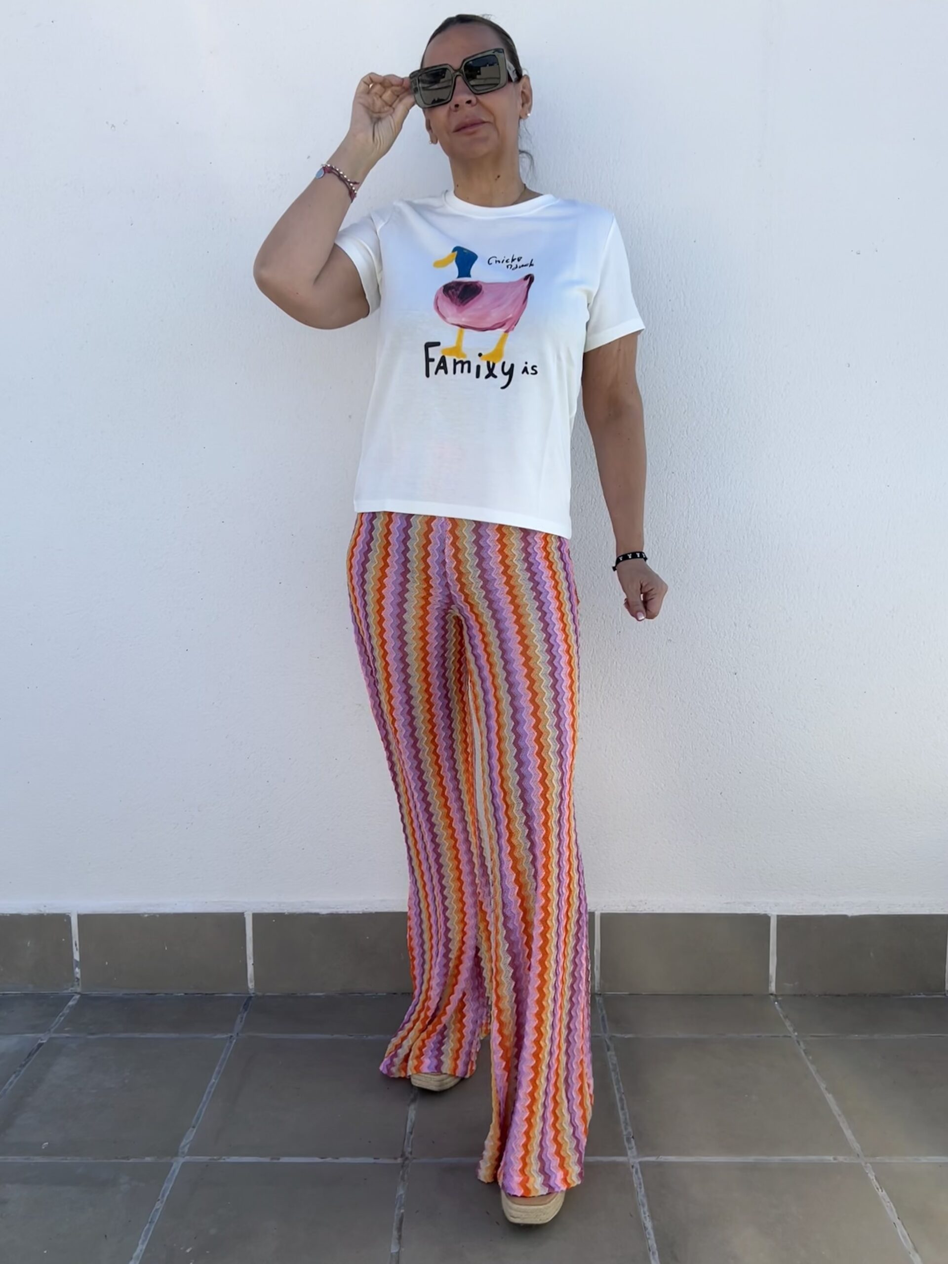Pantalón estilo crochet, tiro medio, pierna acampanada. Detalles geométricos y vivos colores.