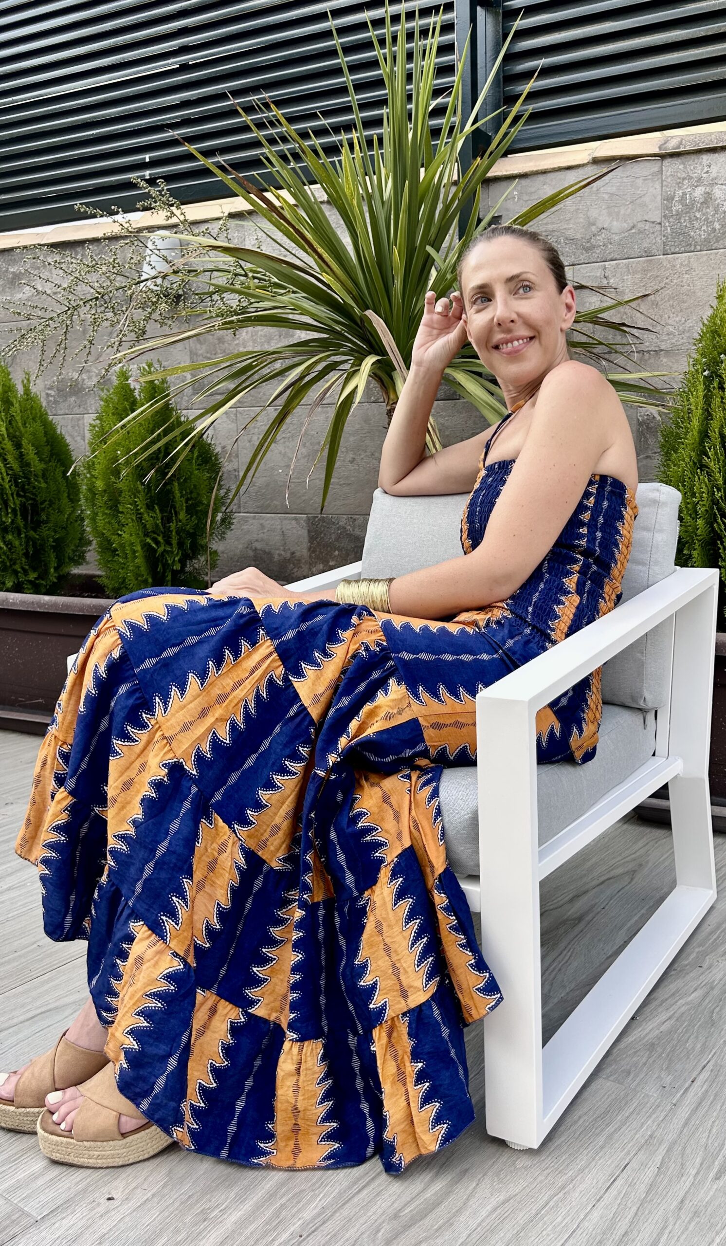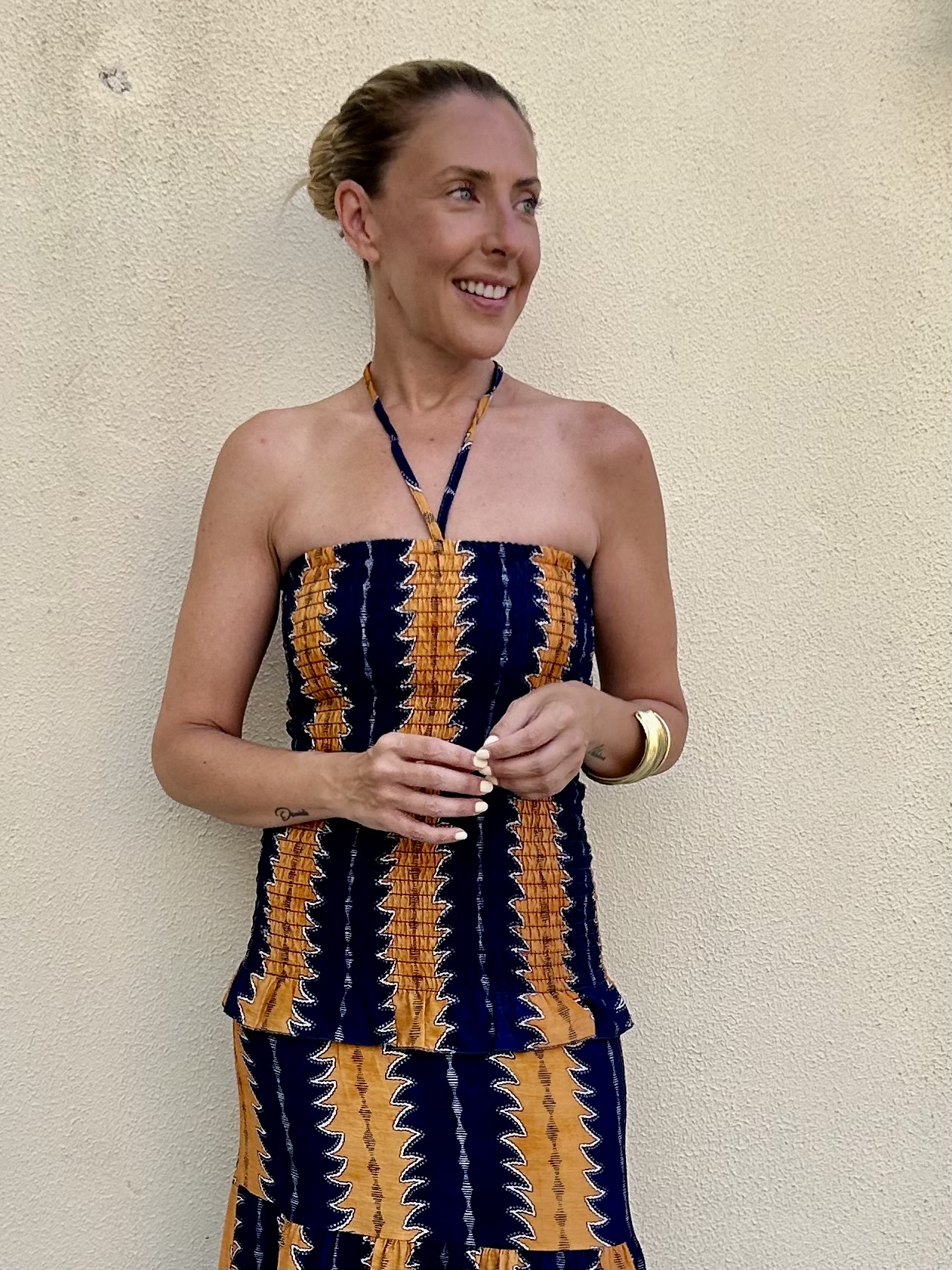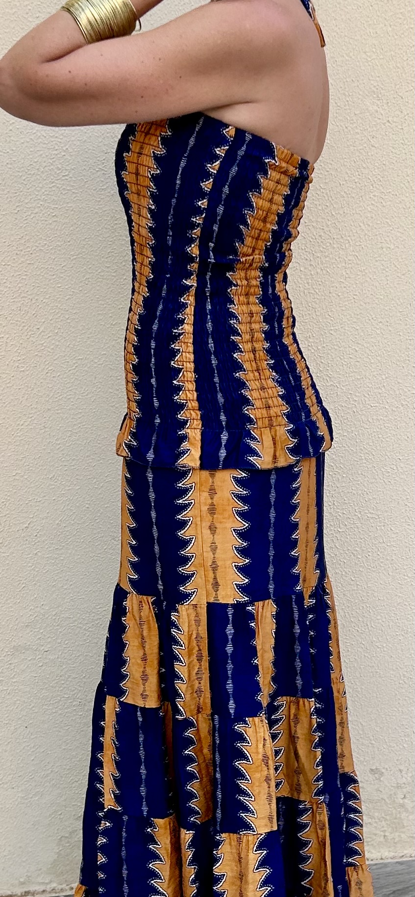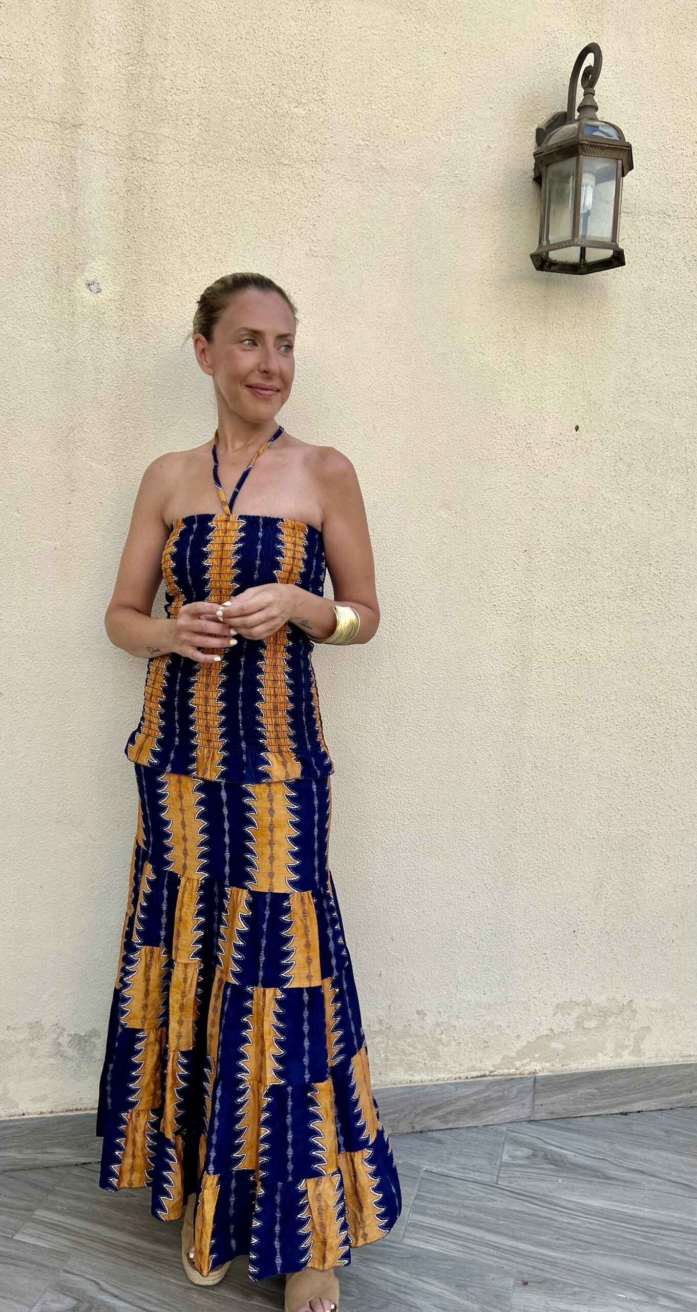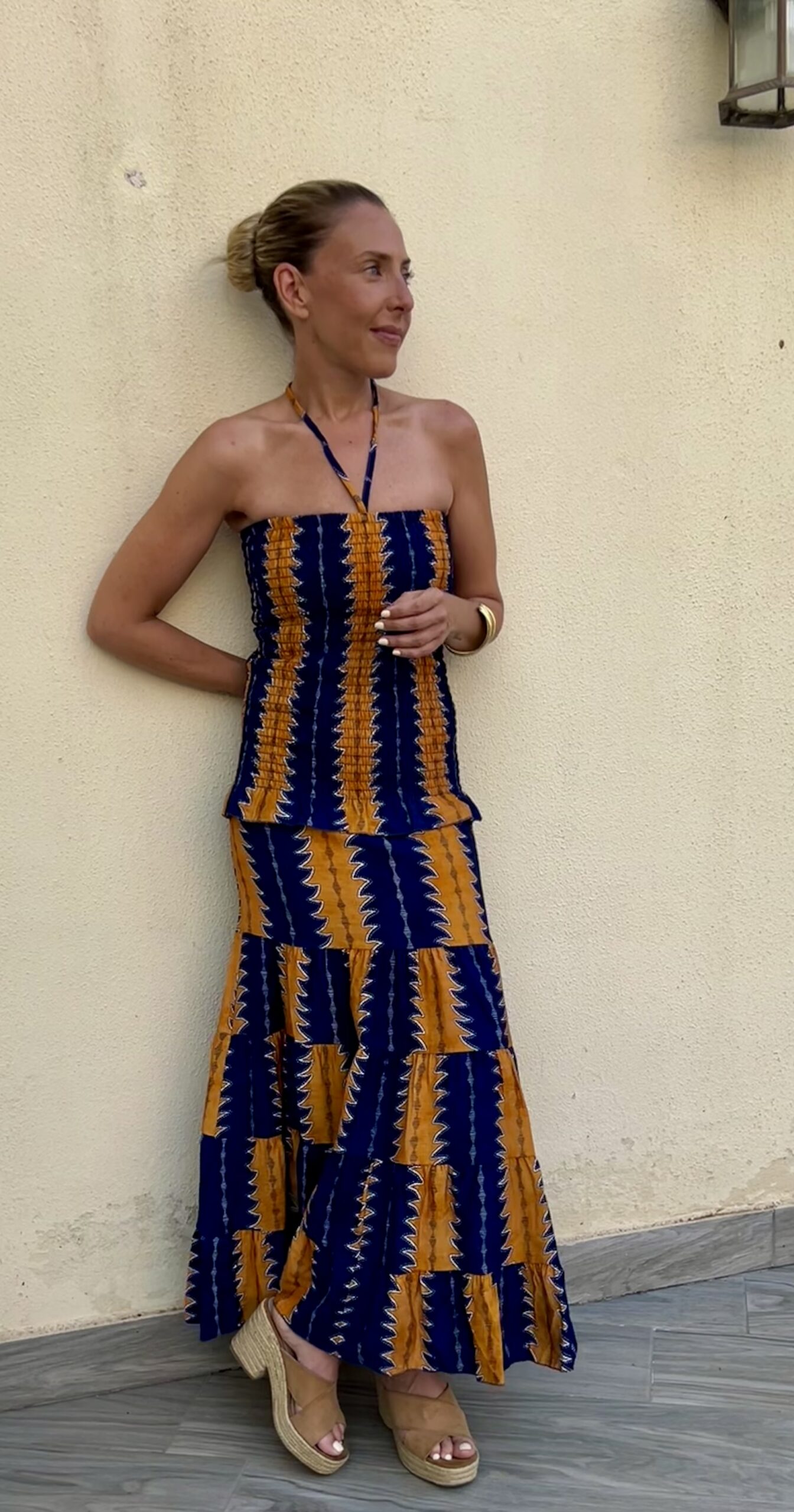 Vestido palabra de honor con tiras al cuello. Parte de arriba de nido de abeja hasta la cadera terminada en volante.