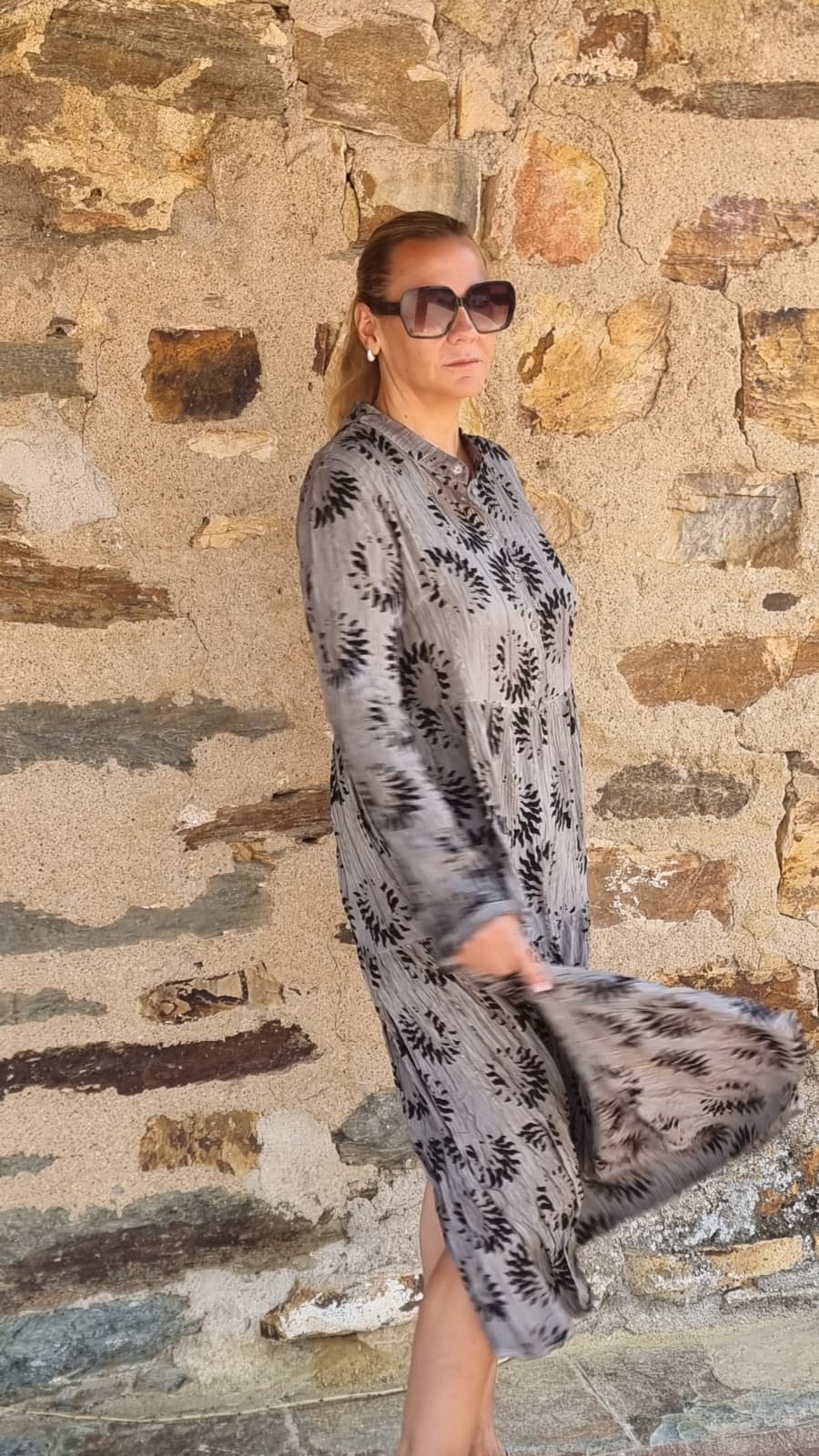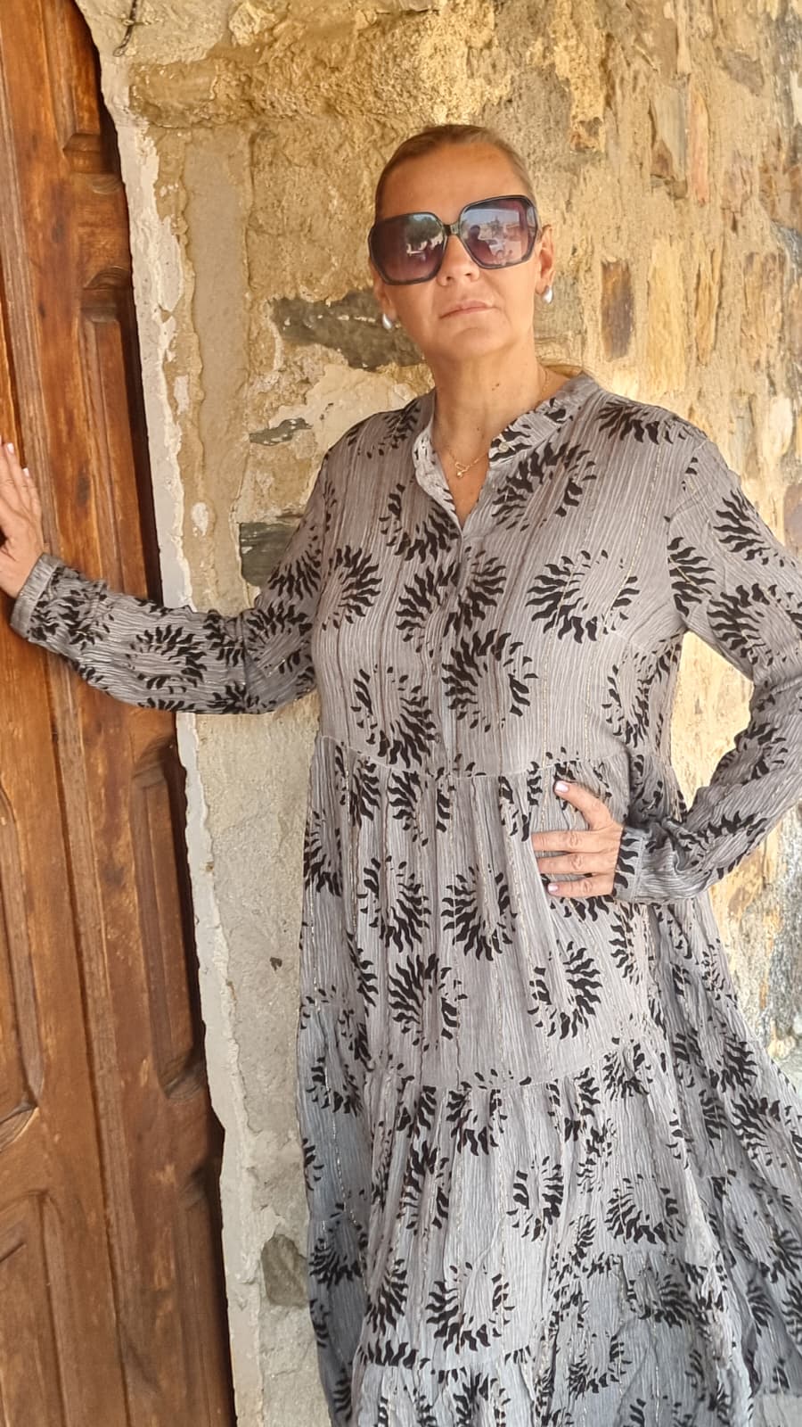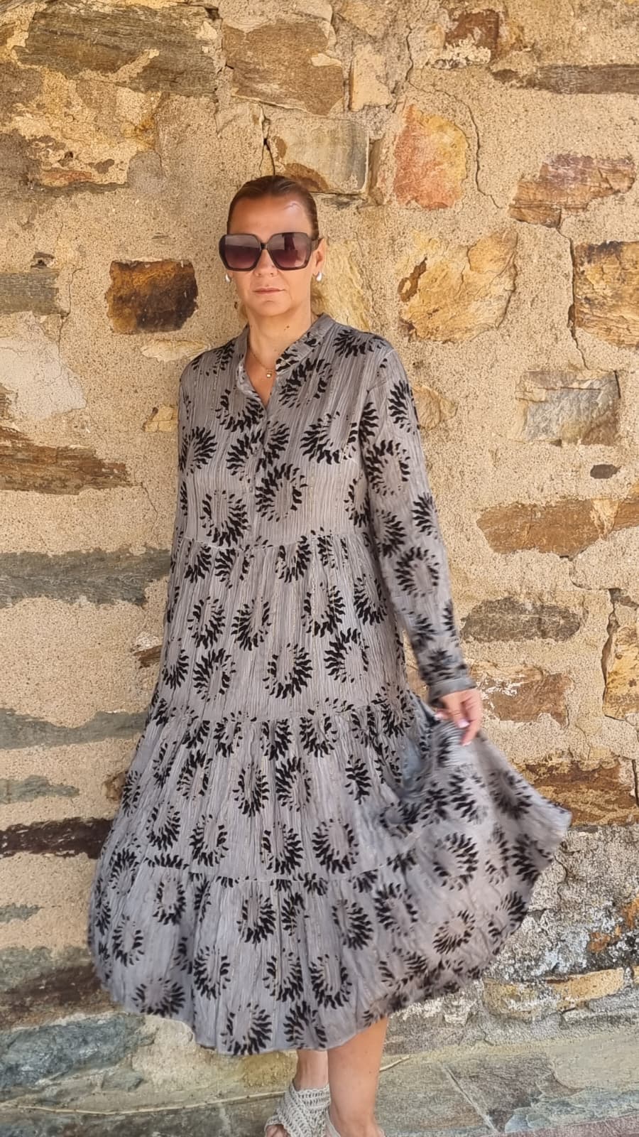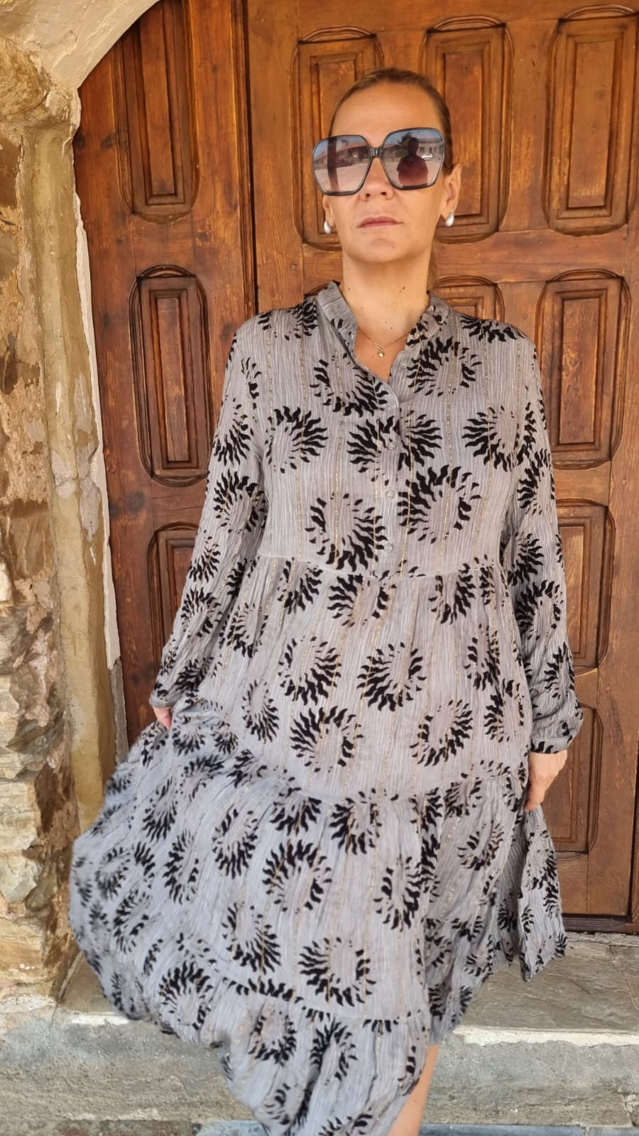 Vestido largo de manga larga. Abotonado hasta el pecho y en mangas. Ligero vuelo en falda, a la altura de la cadera. Estampado geométrico con sutil bordado de hilo dorado que le aporta un toque de luz.  ¡Te aseguramos que en las fotos no se puede hacer justicia a lo bonito que es el estampado!