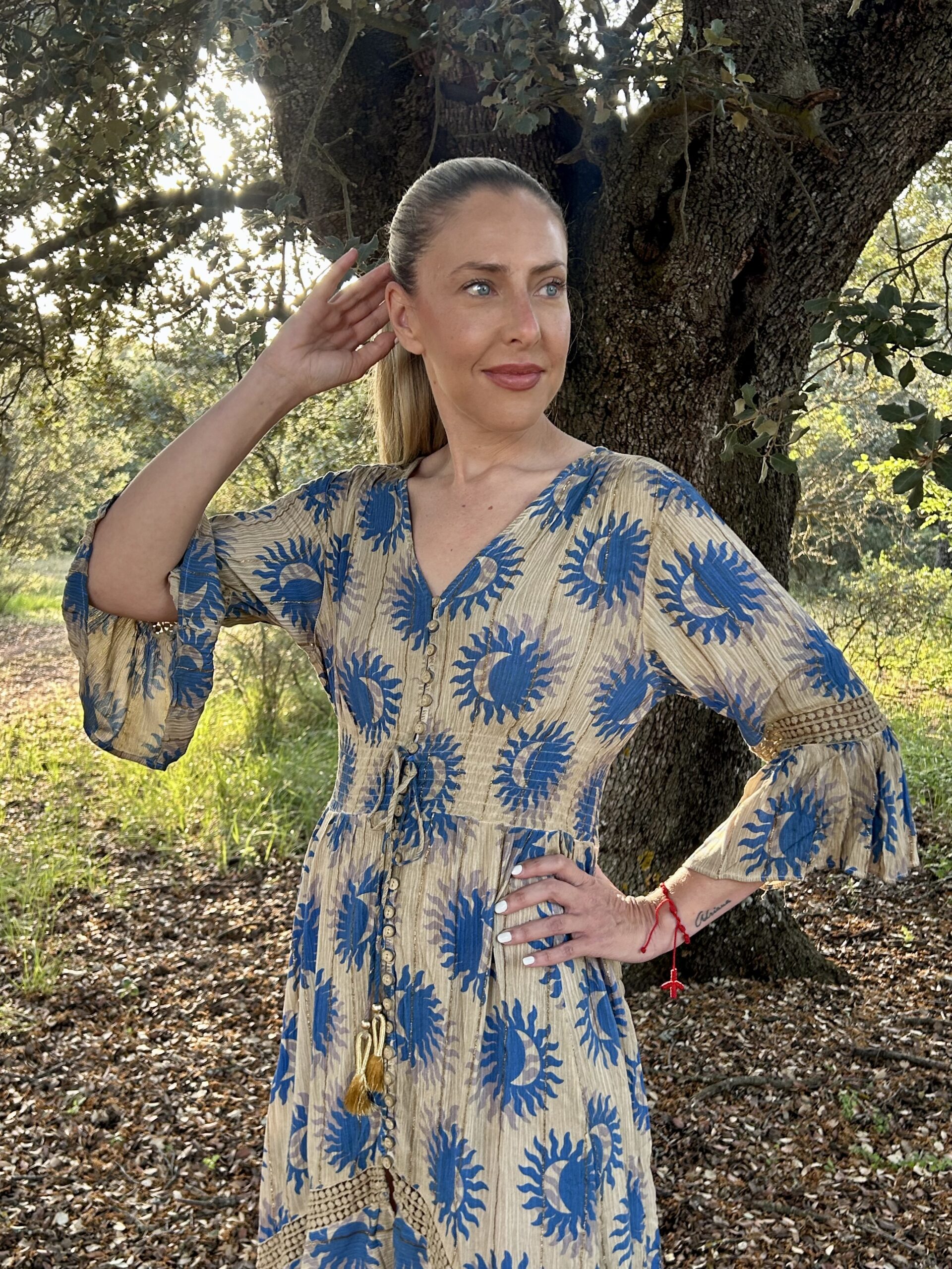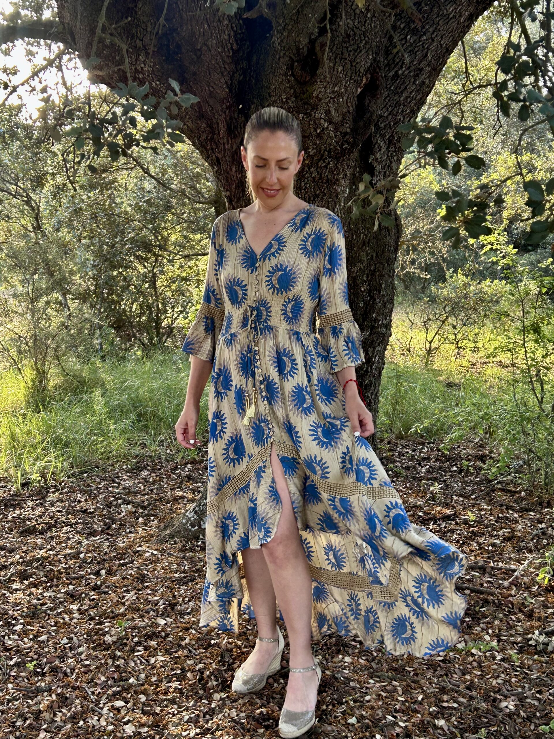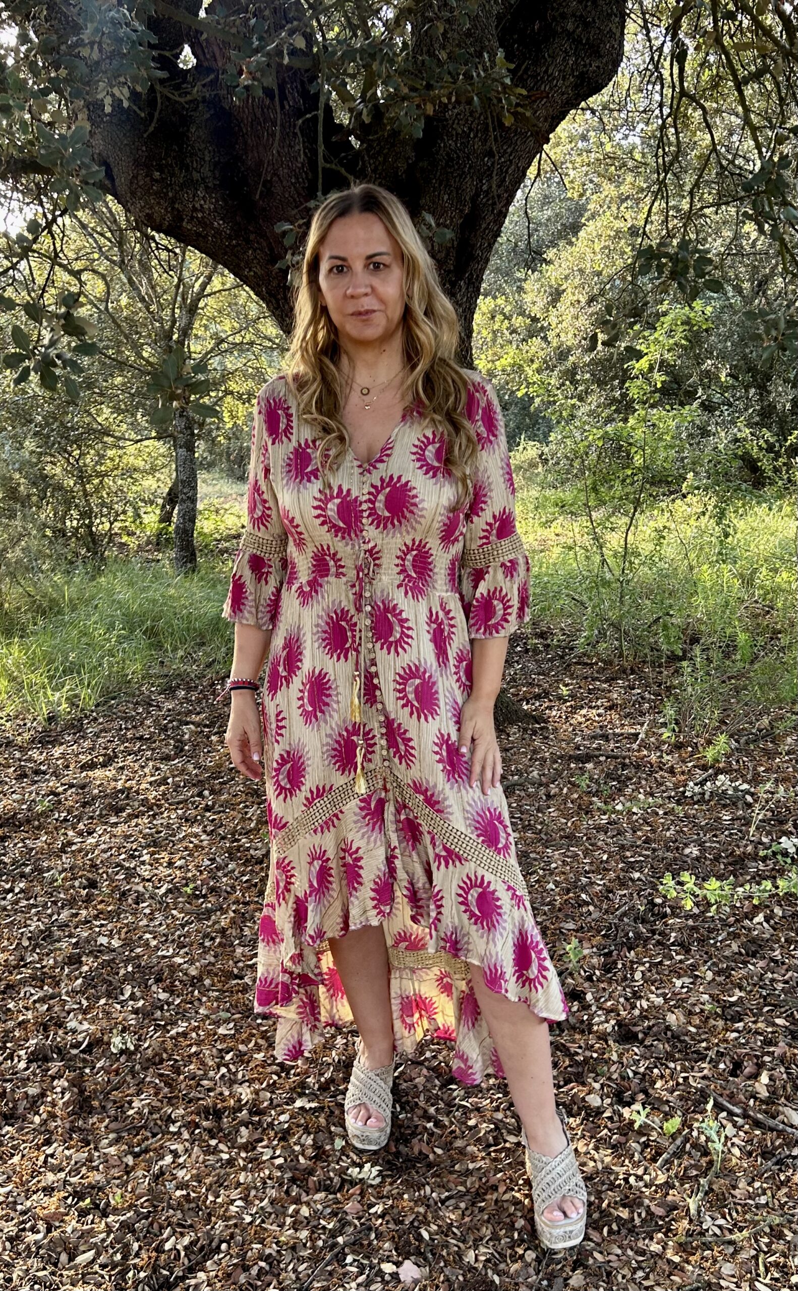 Vestido estampado de cuerpo abotonado y falda asimétrica, mas corta por delante que por detrás. Discretos volantes en manga y bajo. Disponible en tonos azul y rosa.