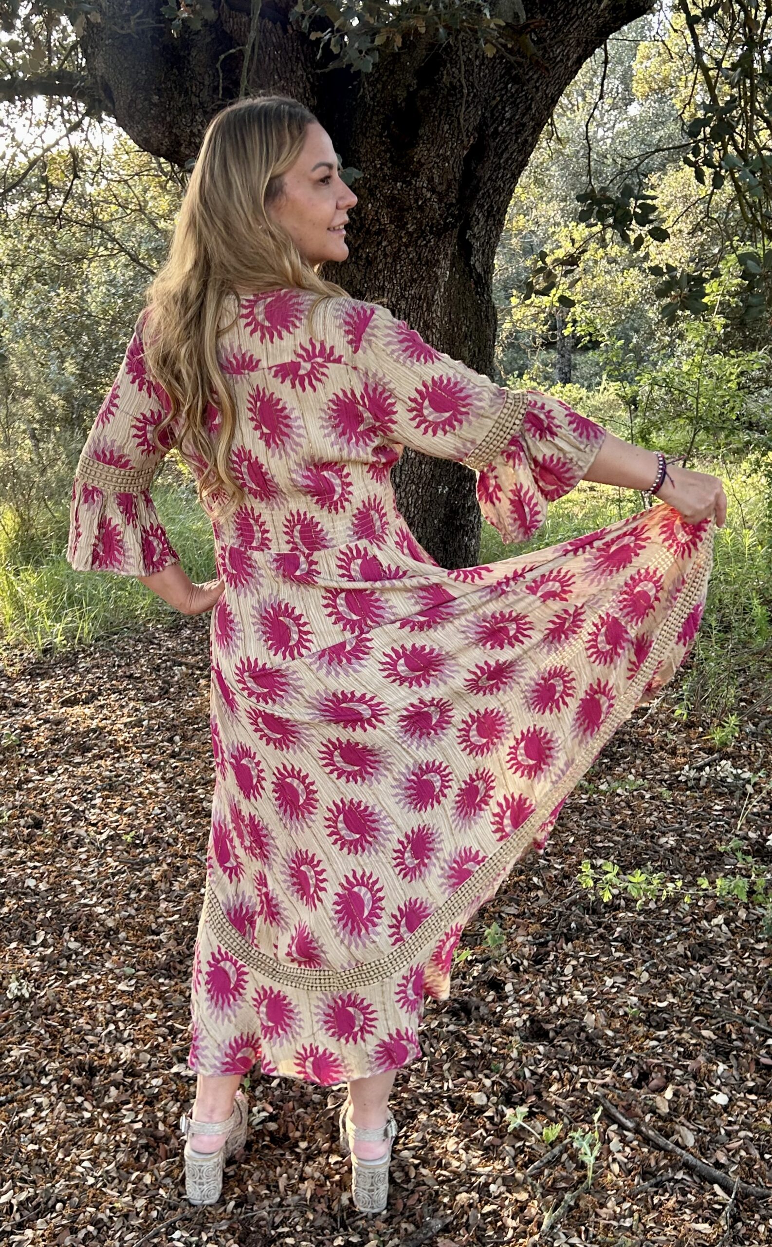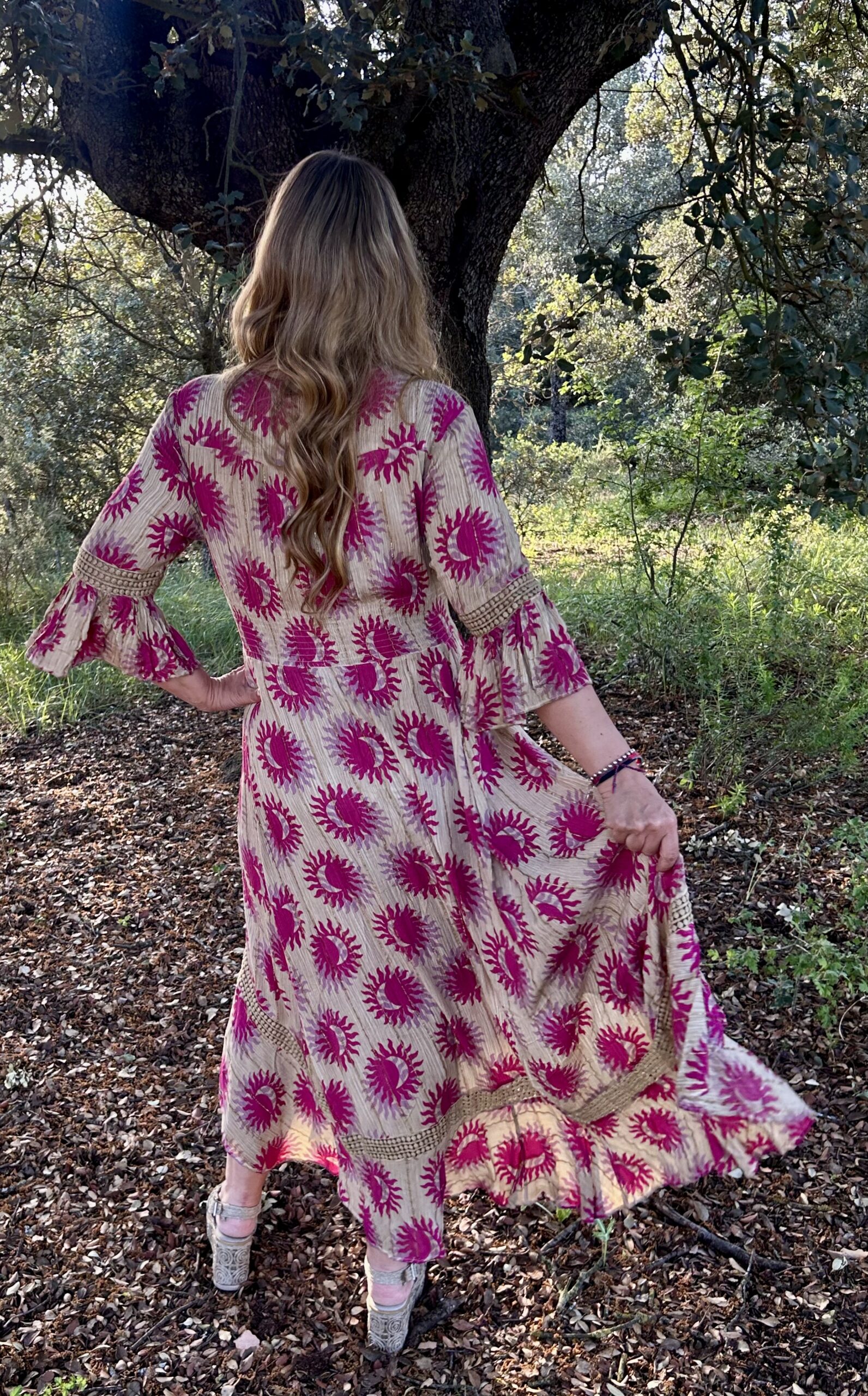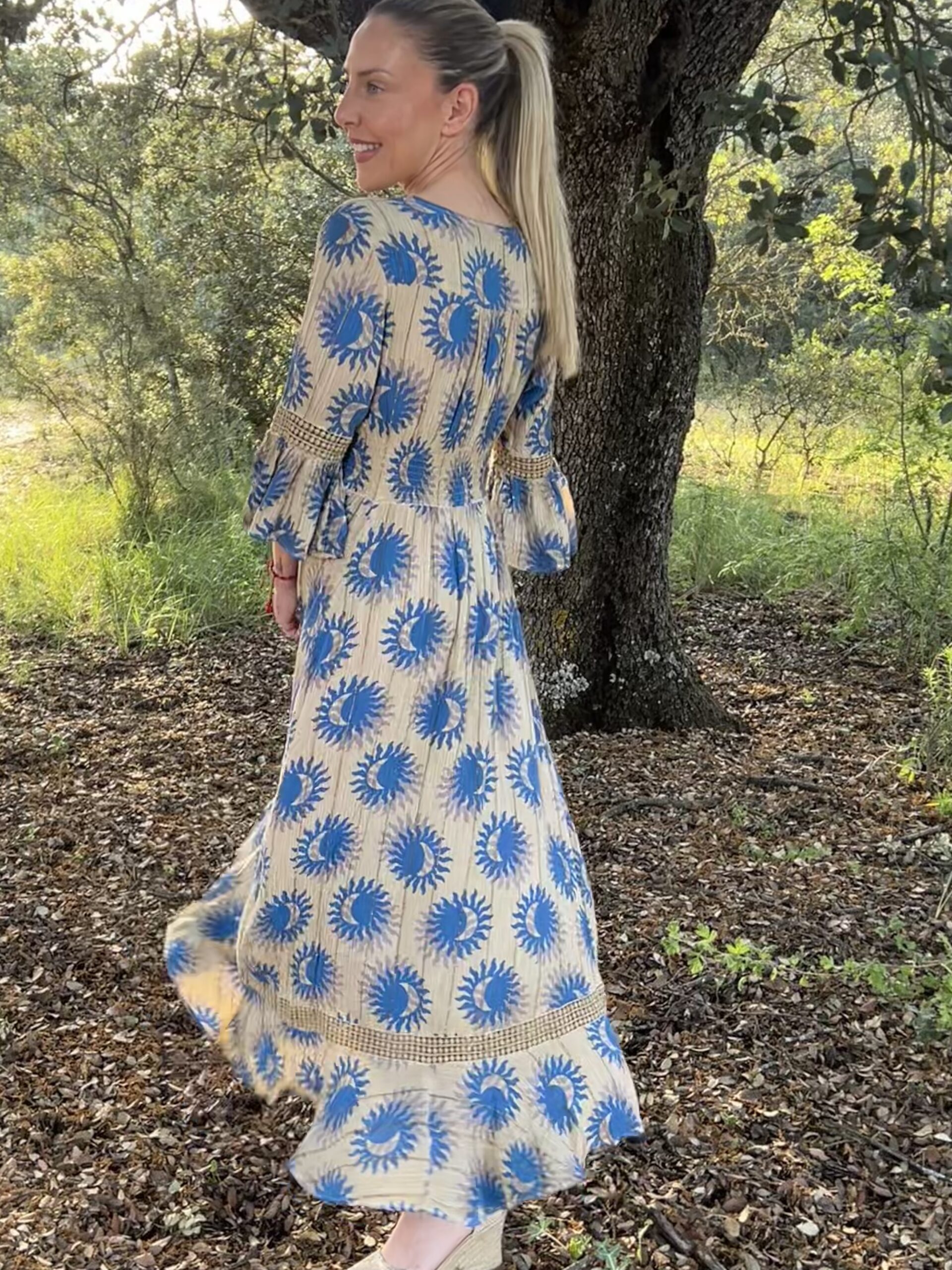Vestido estampado de cuerpo abotonado y falda asimétrica, mas corta por delante que por detrás. Discretos volantes en manga y bajo. Disponible en tonos azul y rosa.