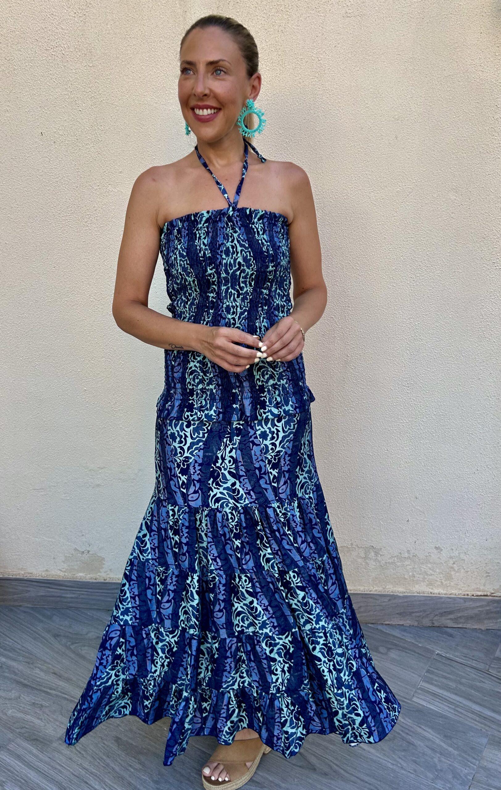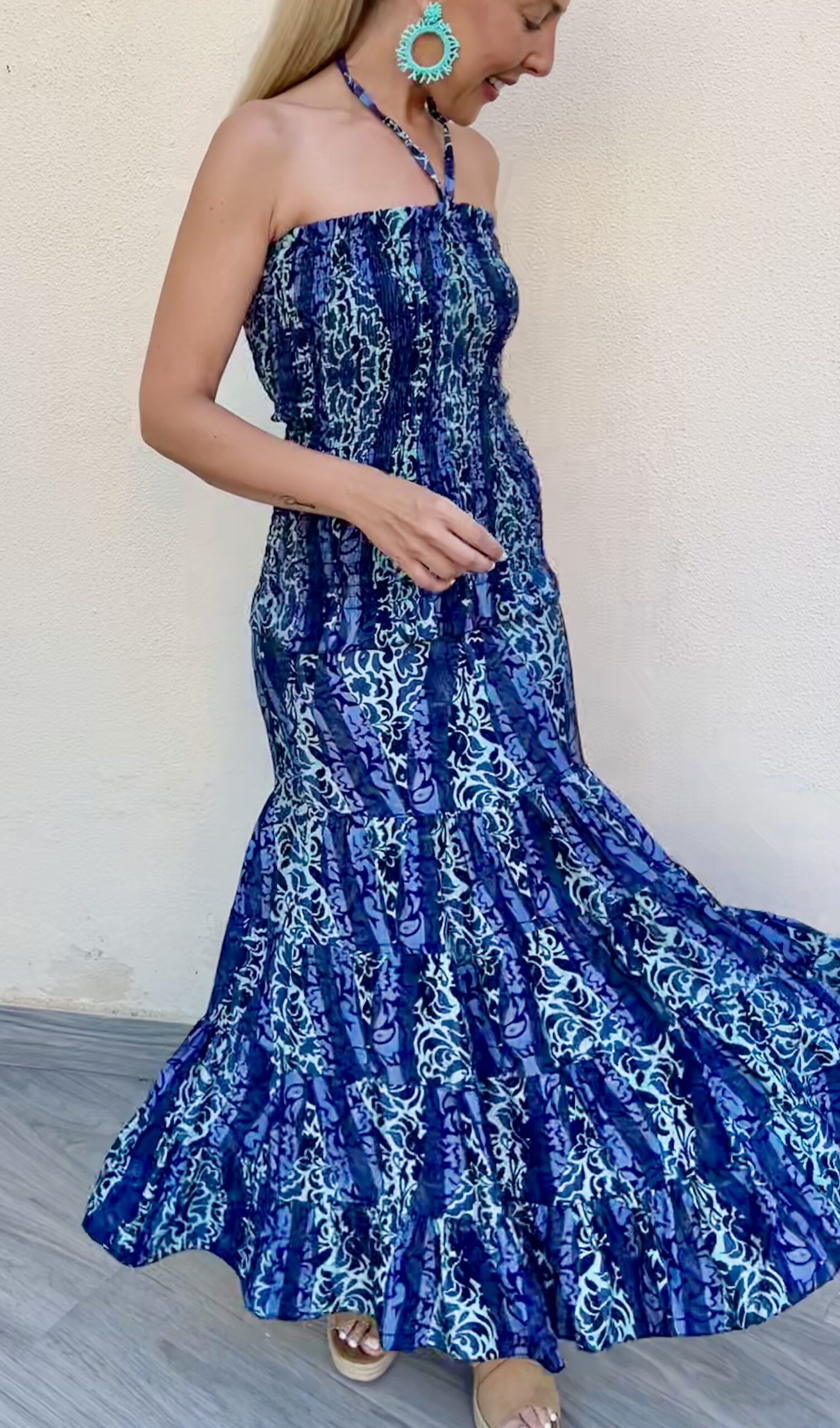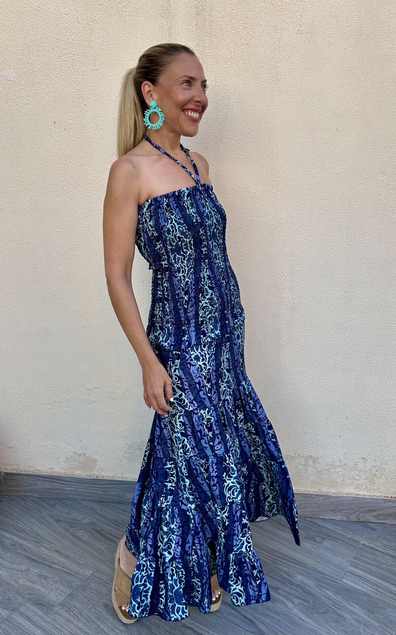 Vestido palabra de honor con posibilidad de sujetar al cuello. Nido de abeja hasta la cintura. Largo midi.