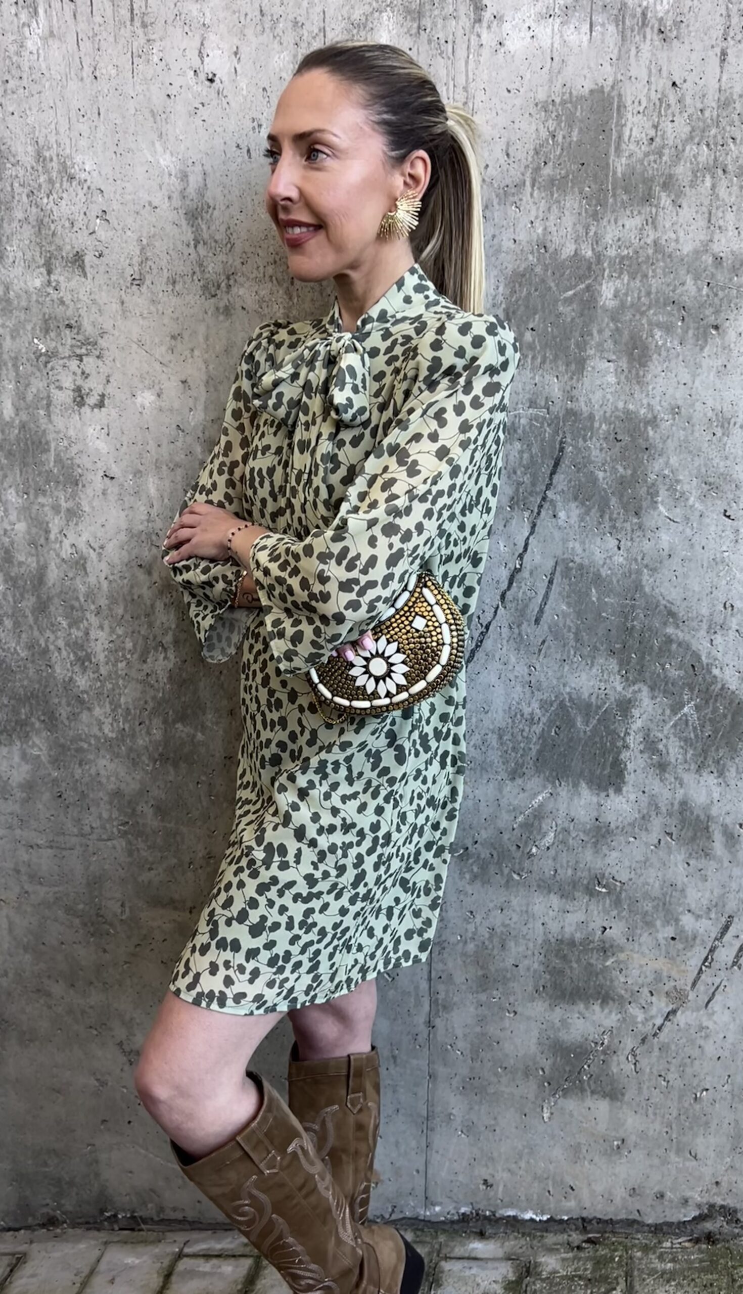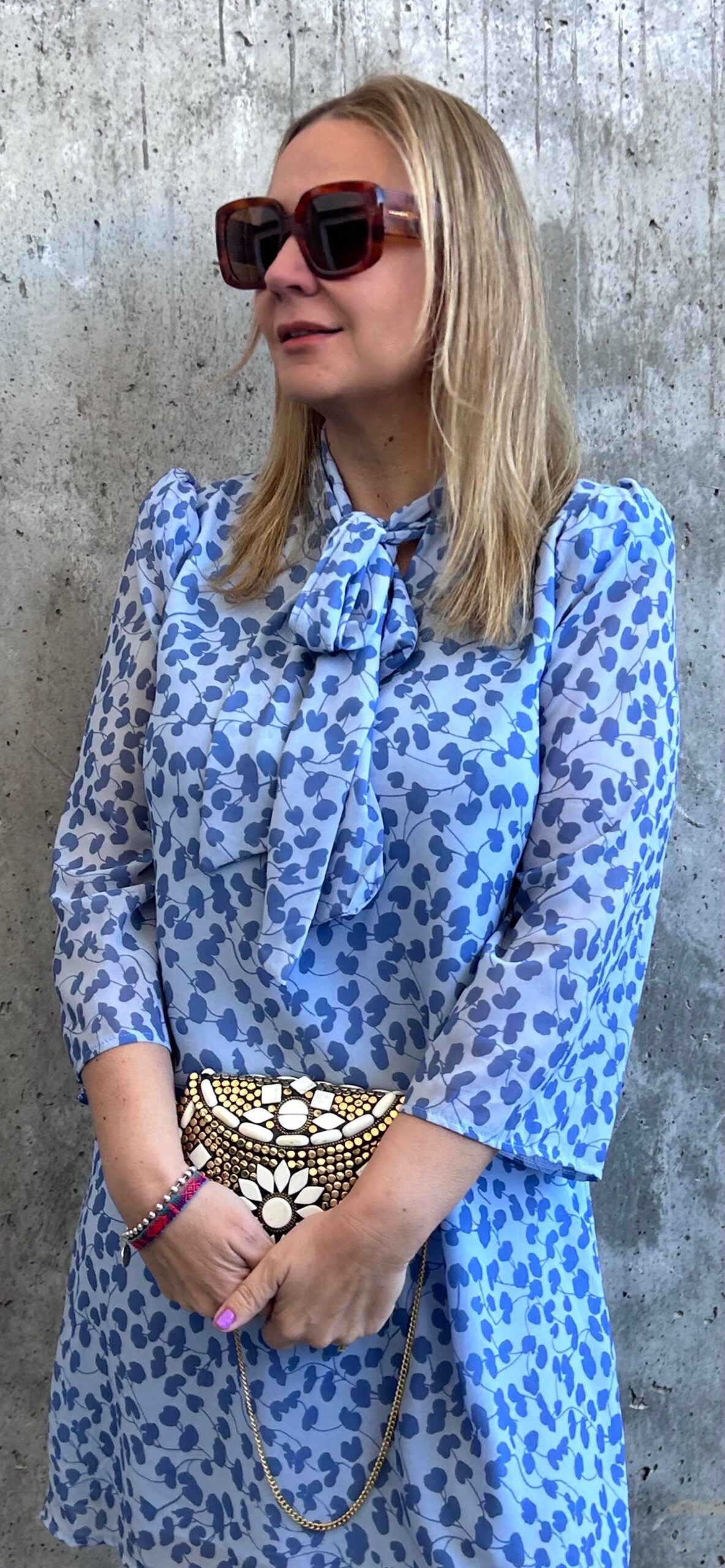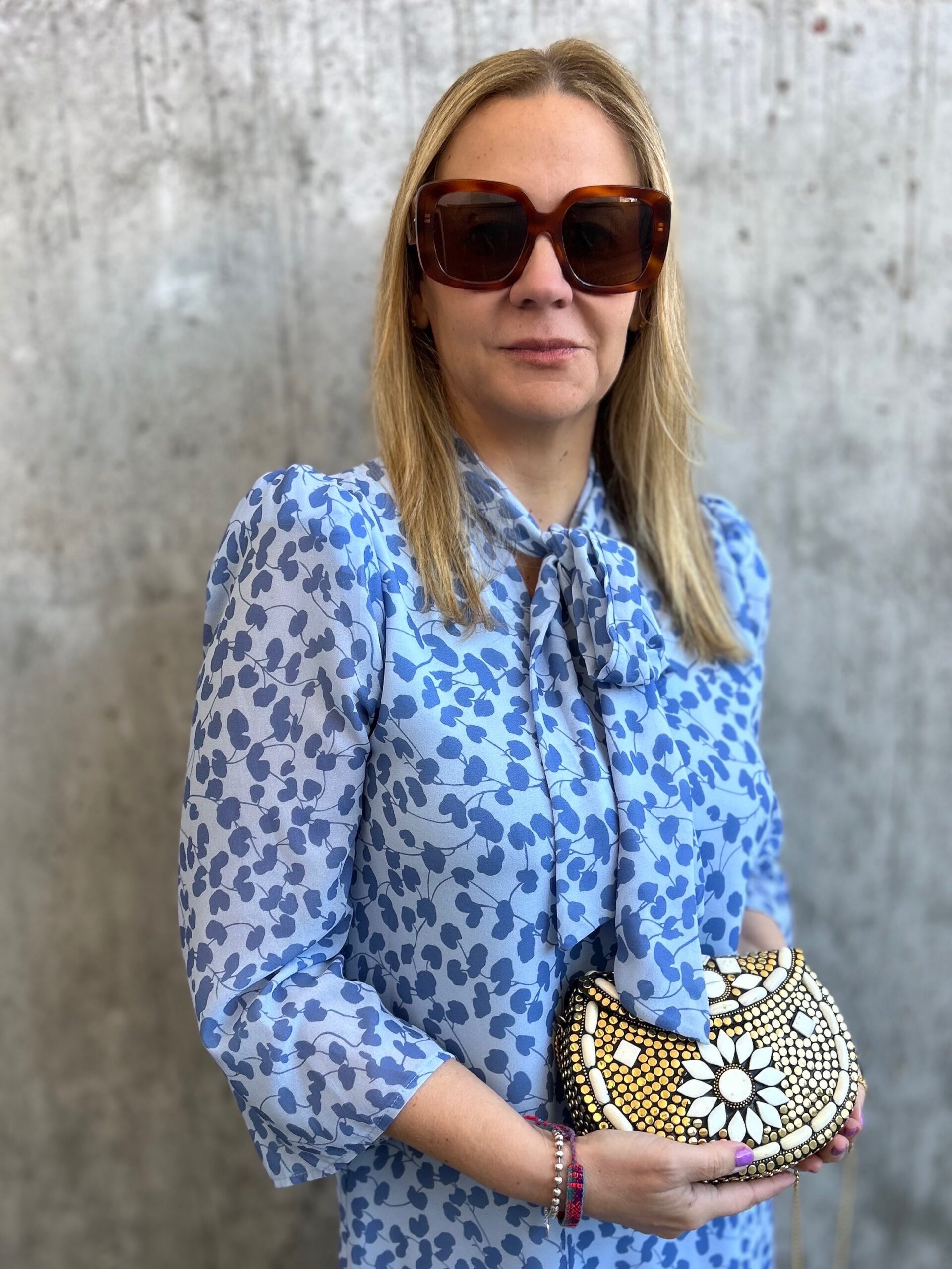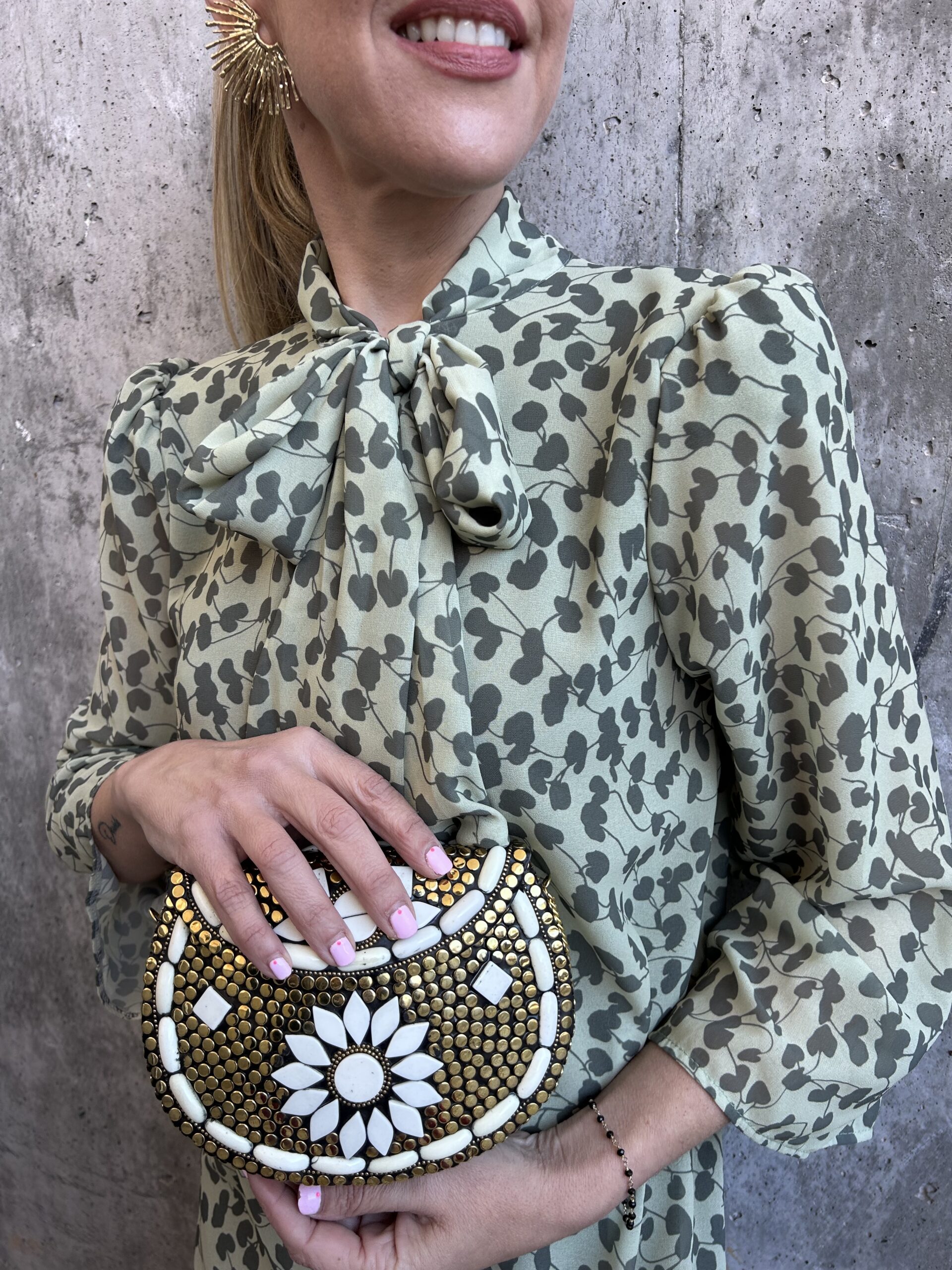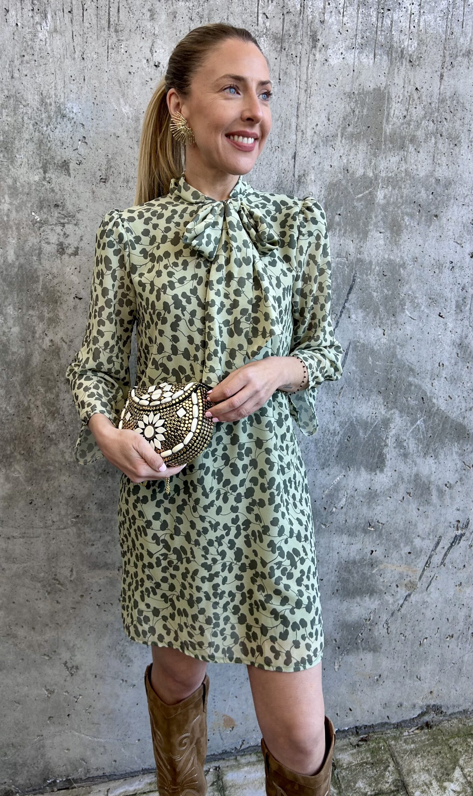 Vestido corto de gasa, con manga semitransparente y lazada al cuello. Disponible en colores azul y verde, con estampado floral.