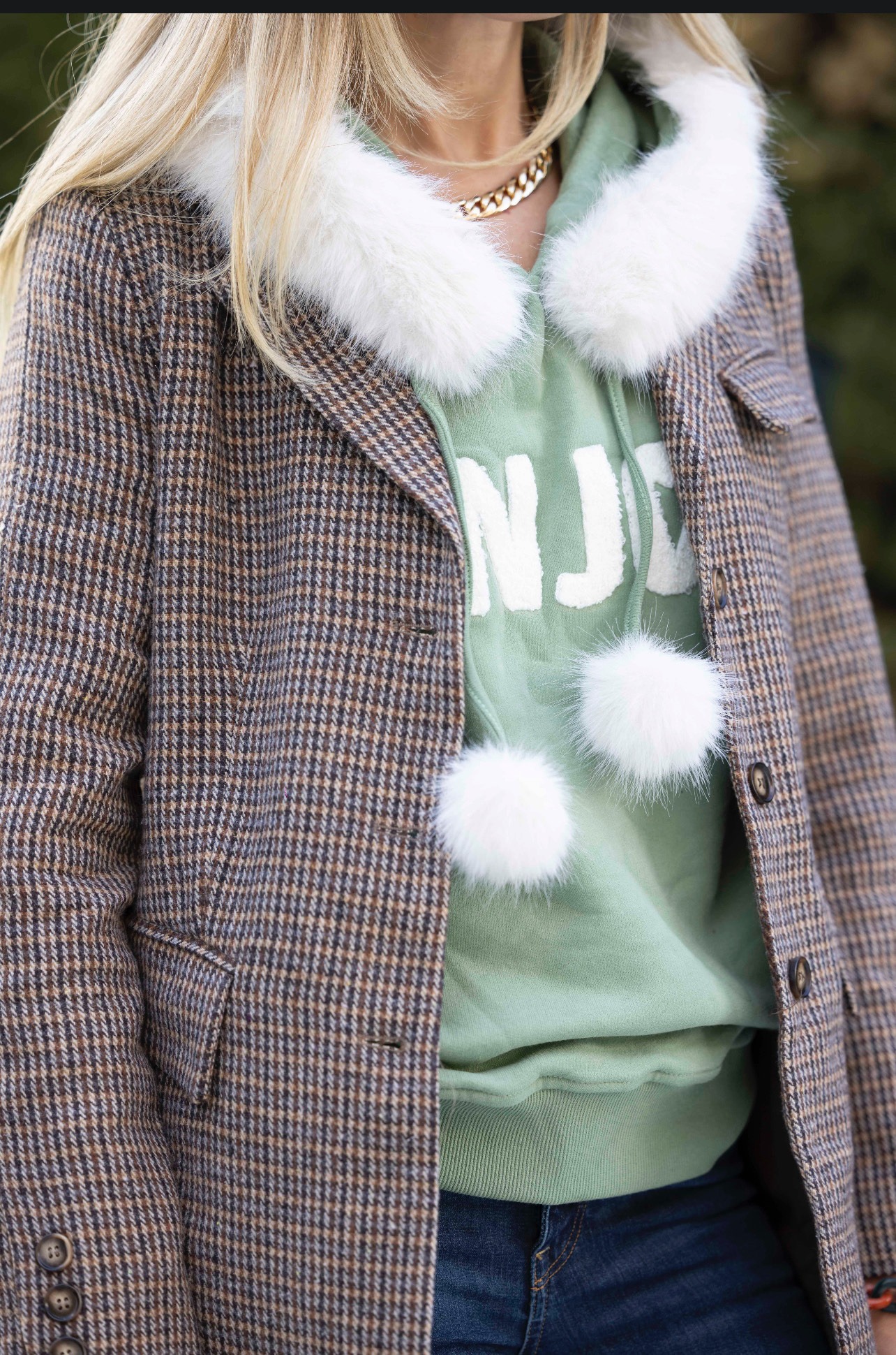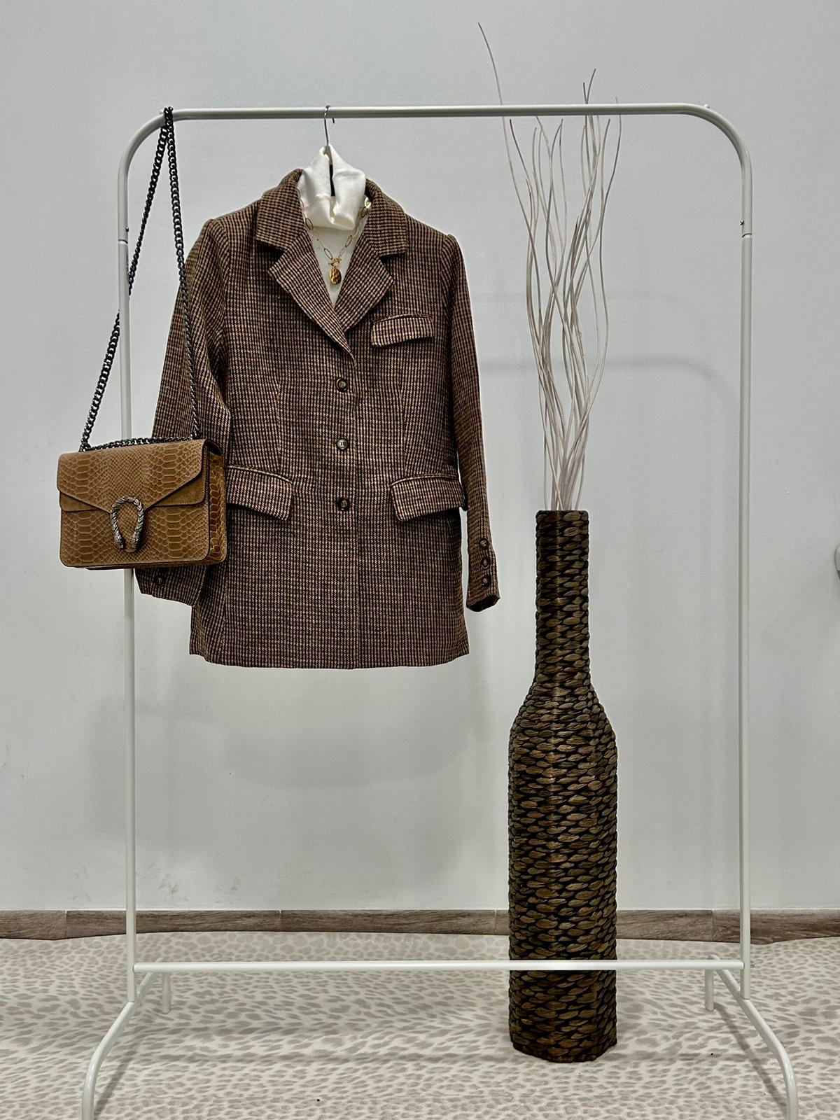 Americana de cuadros estilo inglés. Abotonada. Tiene bolsillos. Forro interior.