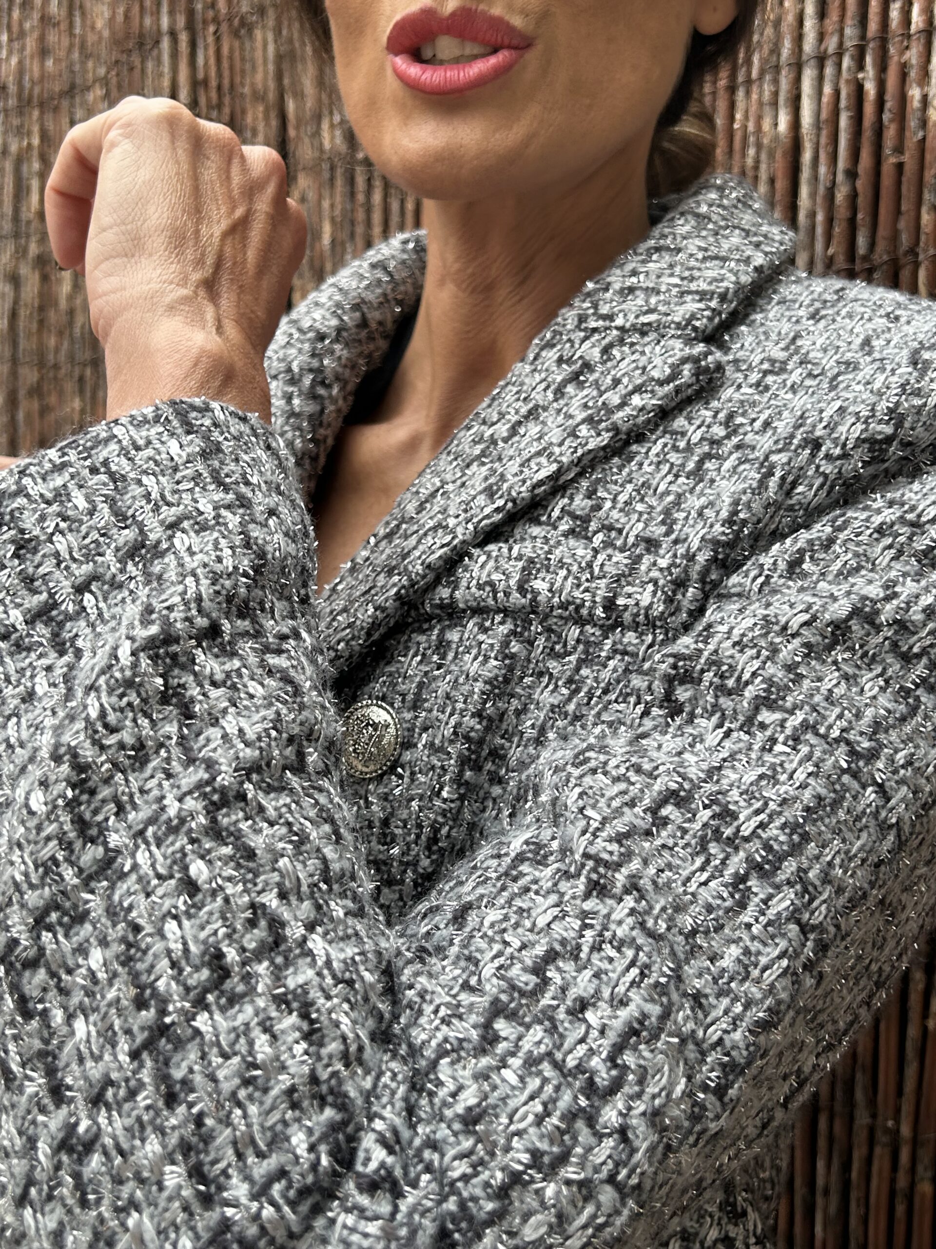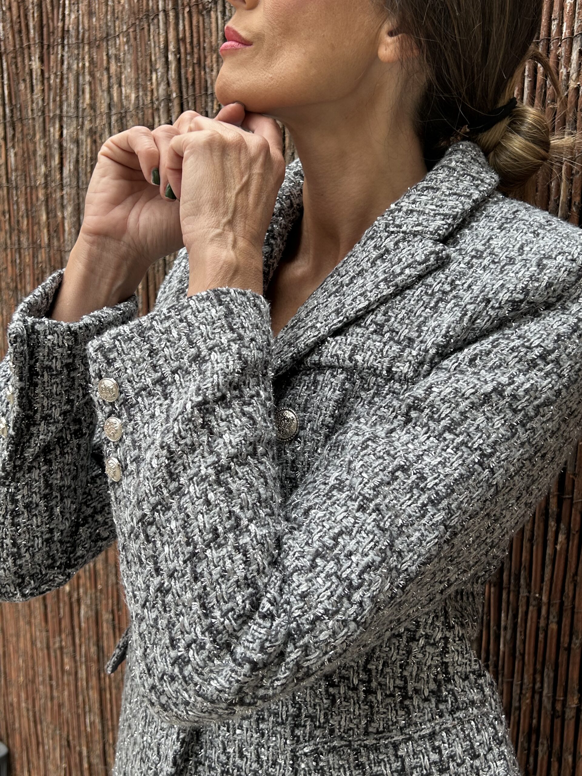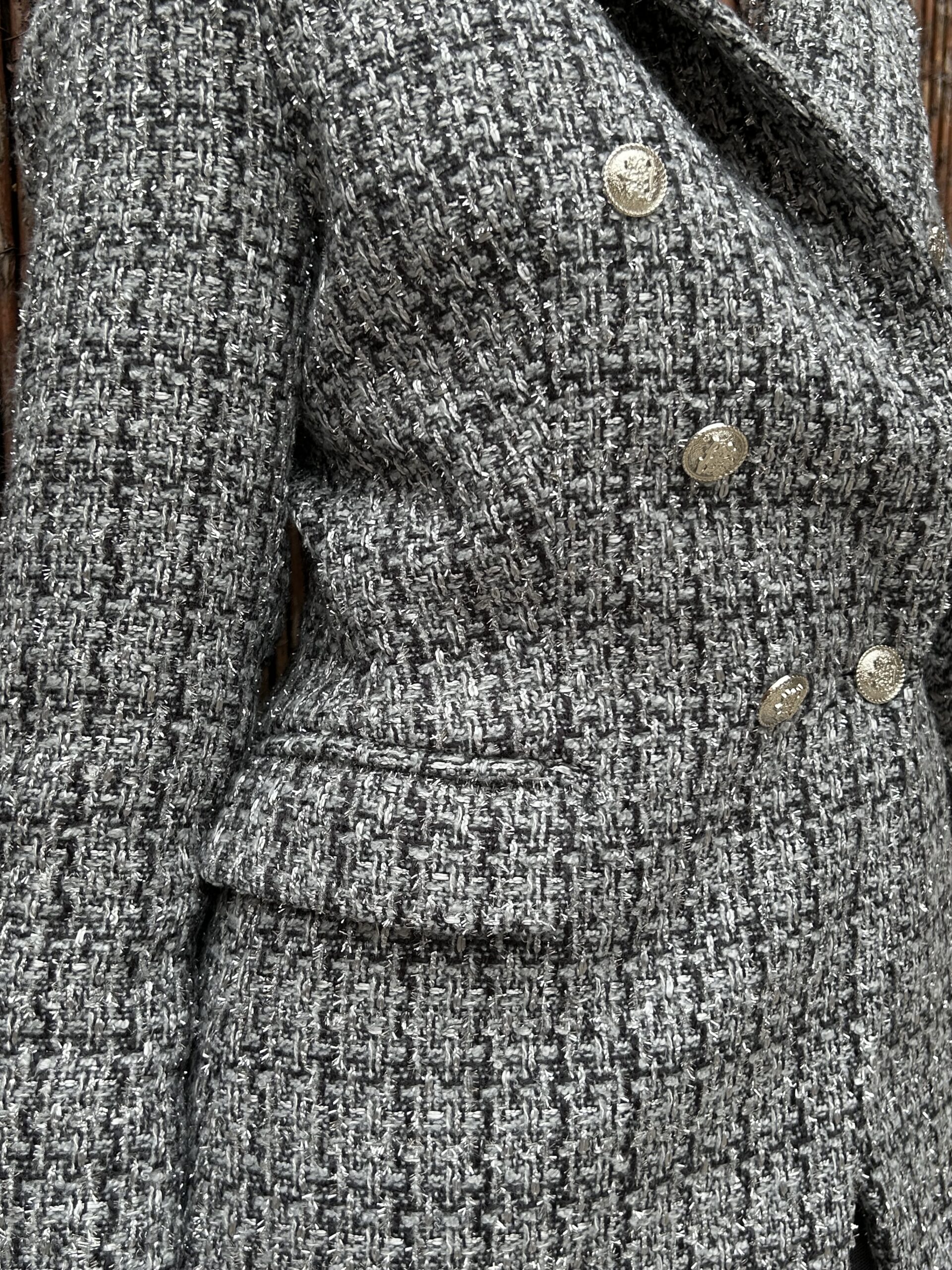 Blazer cruzada estructura, de manga larga y hombreras con cuello y bolsillos de solapa. Tejido tweed en tonos grises con hilos plateados. Botones plateados en frontal y mangas. Cierre hacia ambos lados. Ligeramente entallada. Con forro interior.