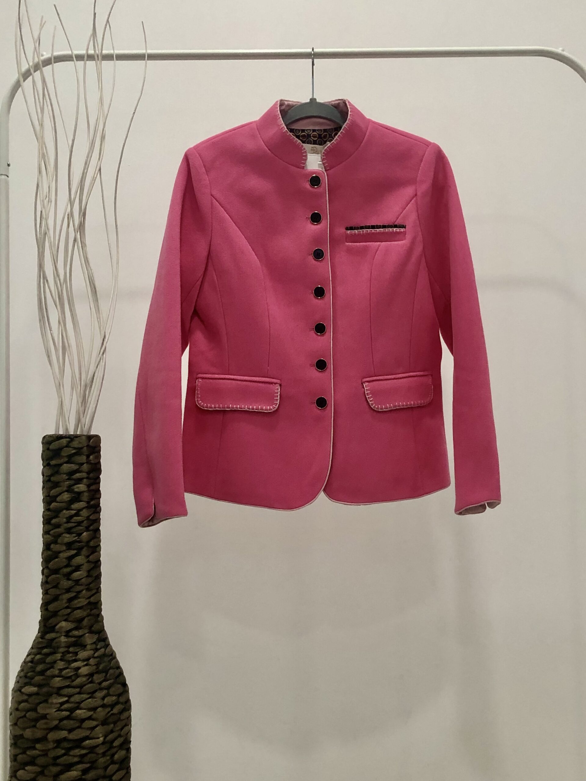 Blazer rosa, ligeramente entallada. Cuello Mao. Abotonada con Forro interior. Detalle de puntadas en cuello y bolsillos.