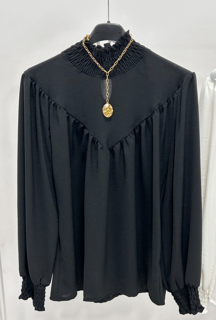 Blusa cerrada con volante elástico en puños y cuello.