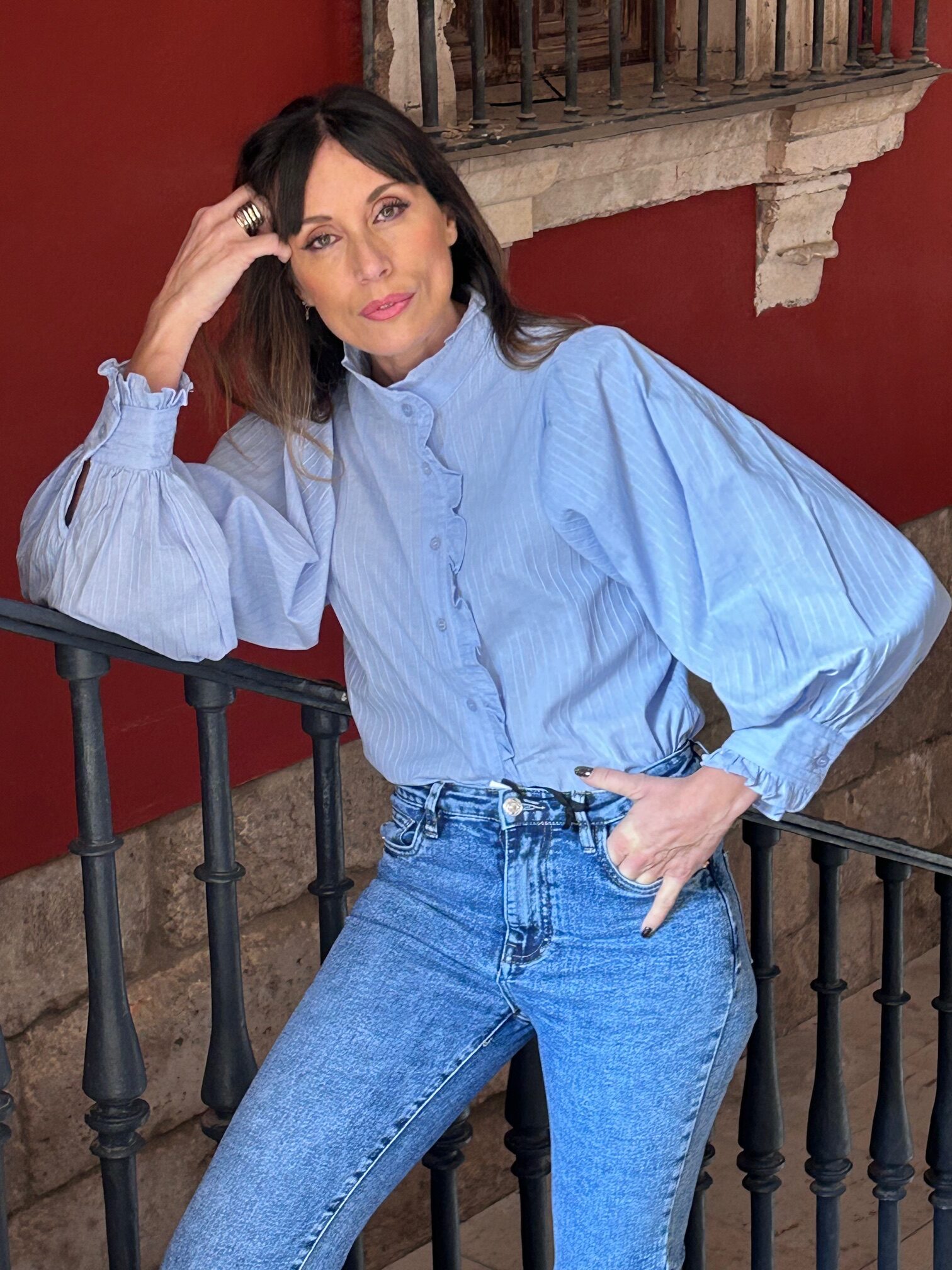 Camisa azul con cuello redondo y manga abullonada. Adorno de volante en cuello, mangas y delantero.