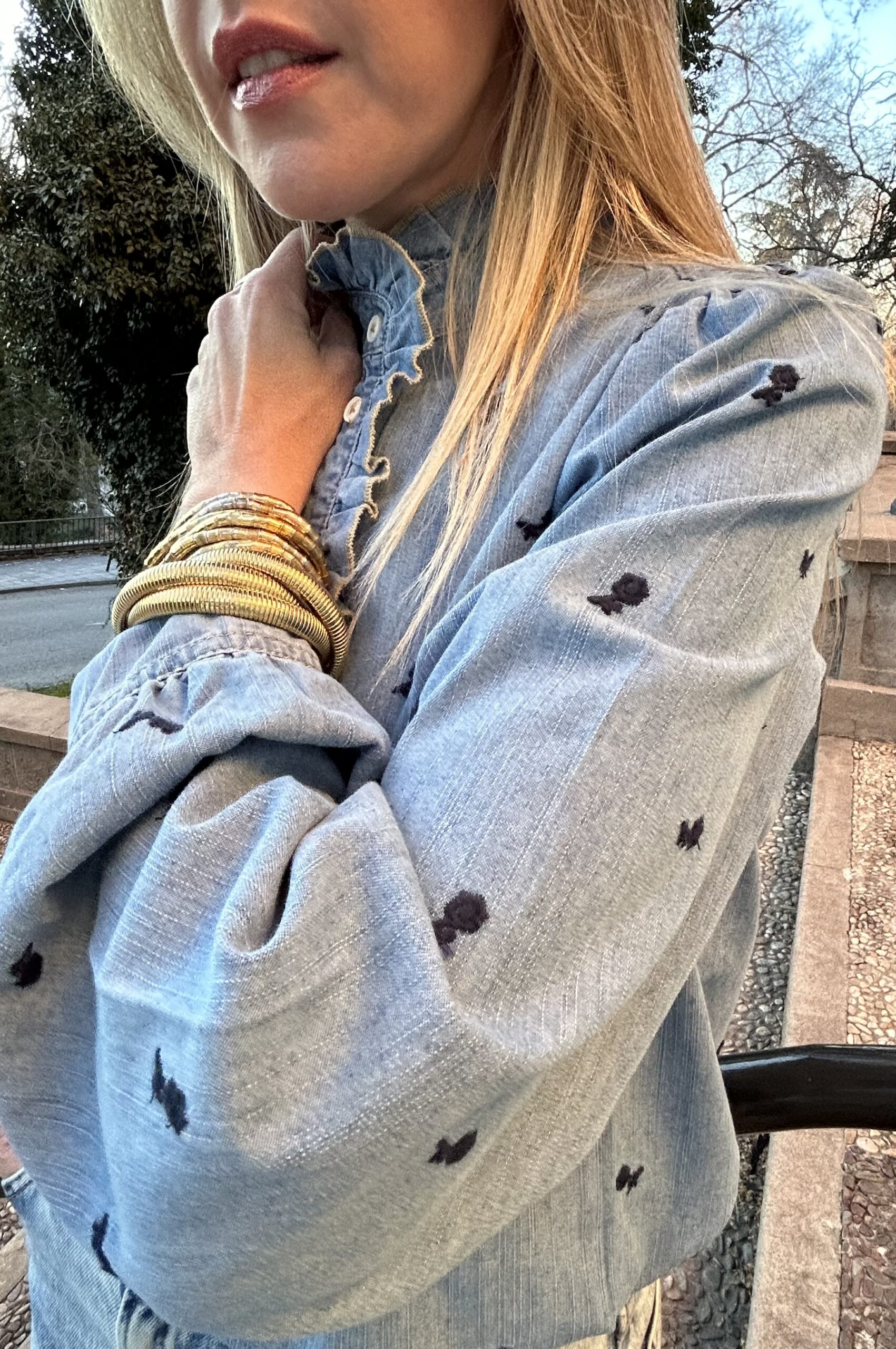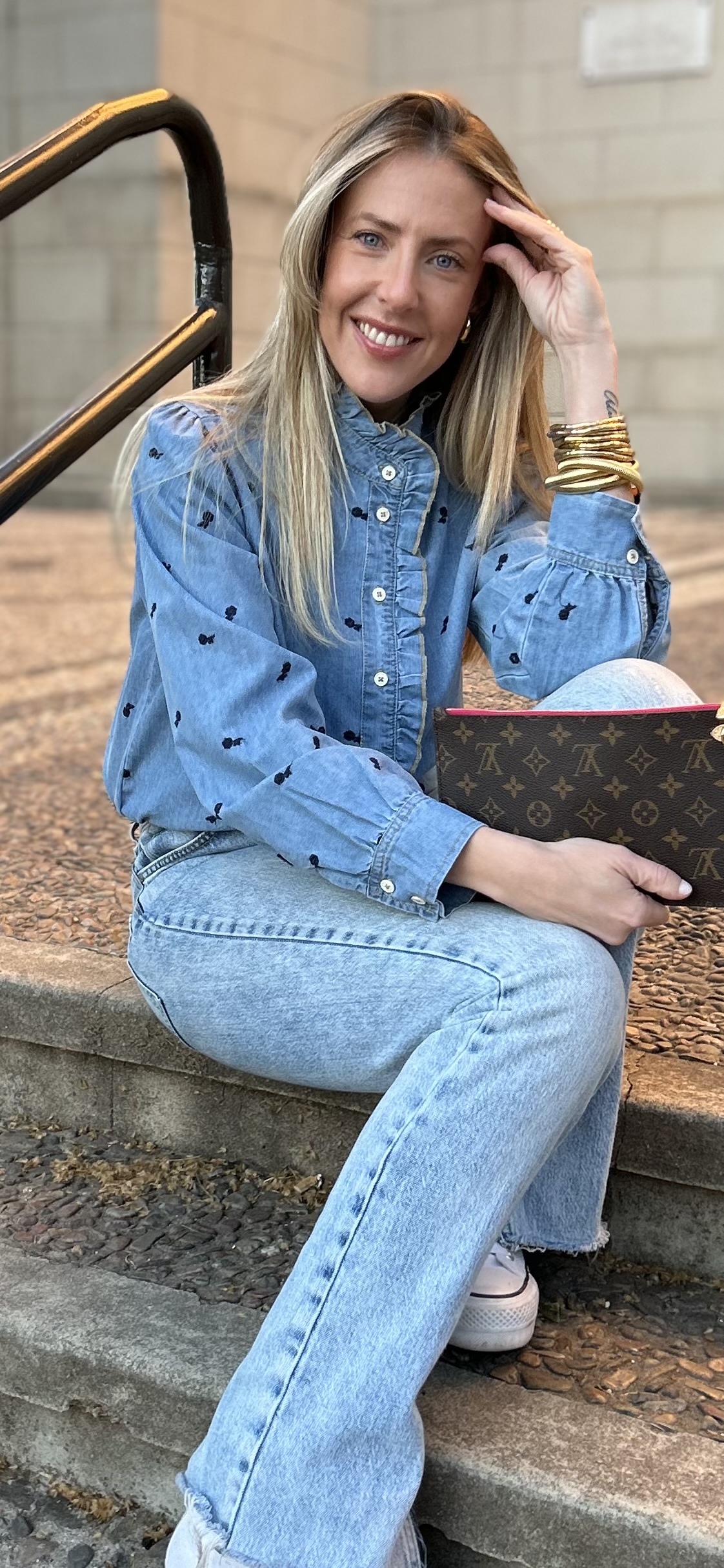 Detalle de volante en botonadura y cuello con ribete en color tostado.