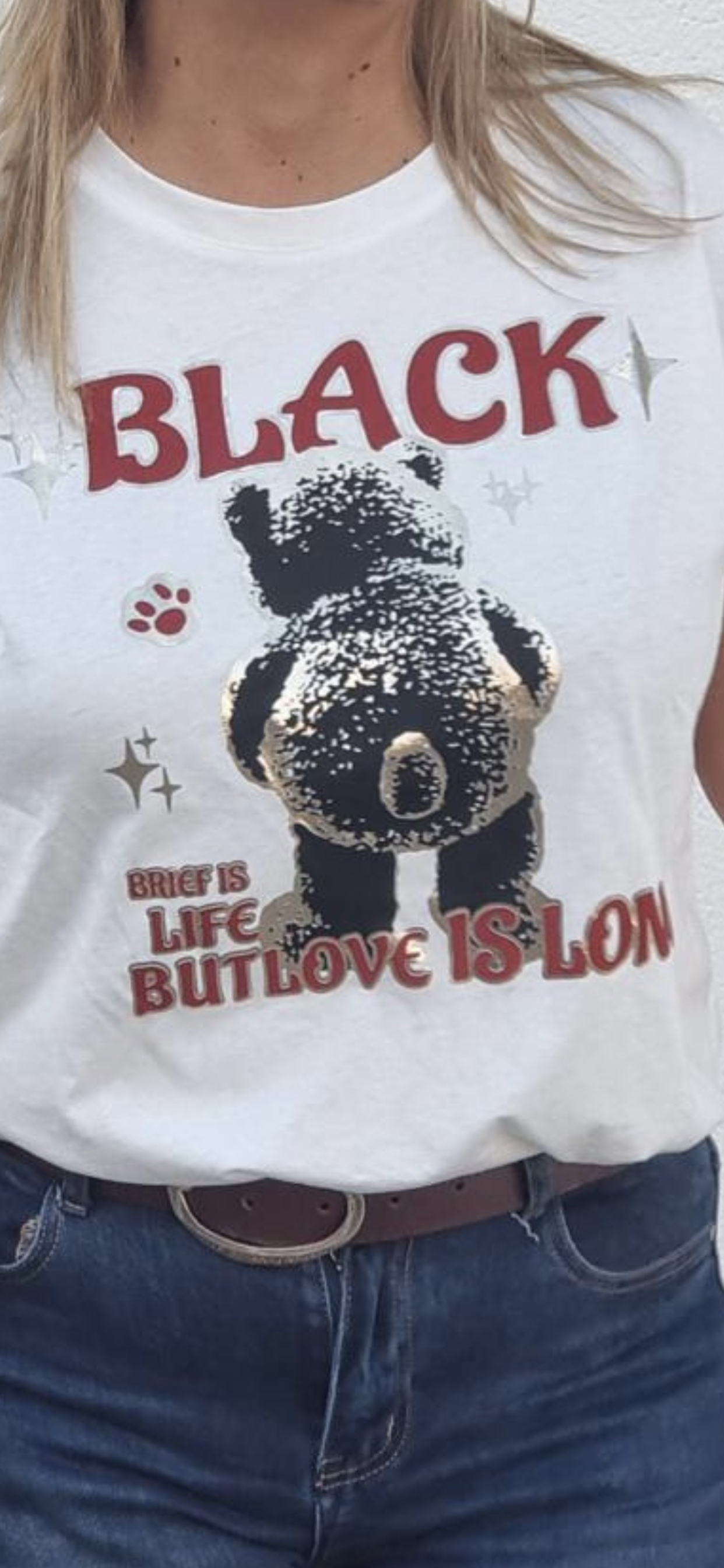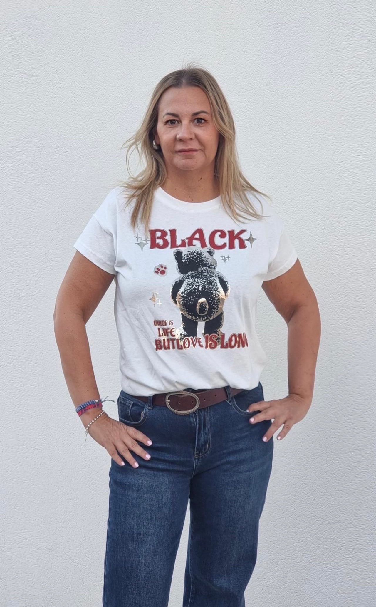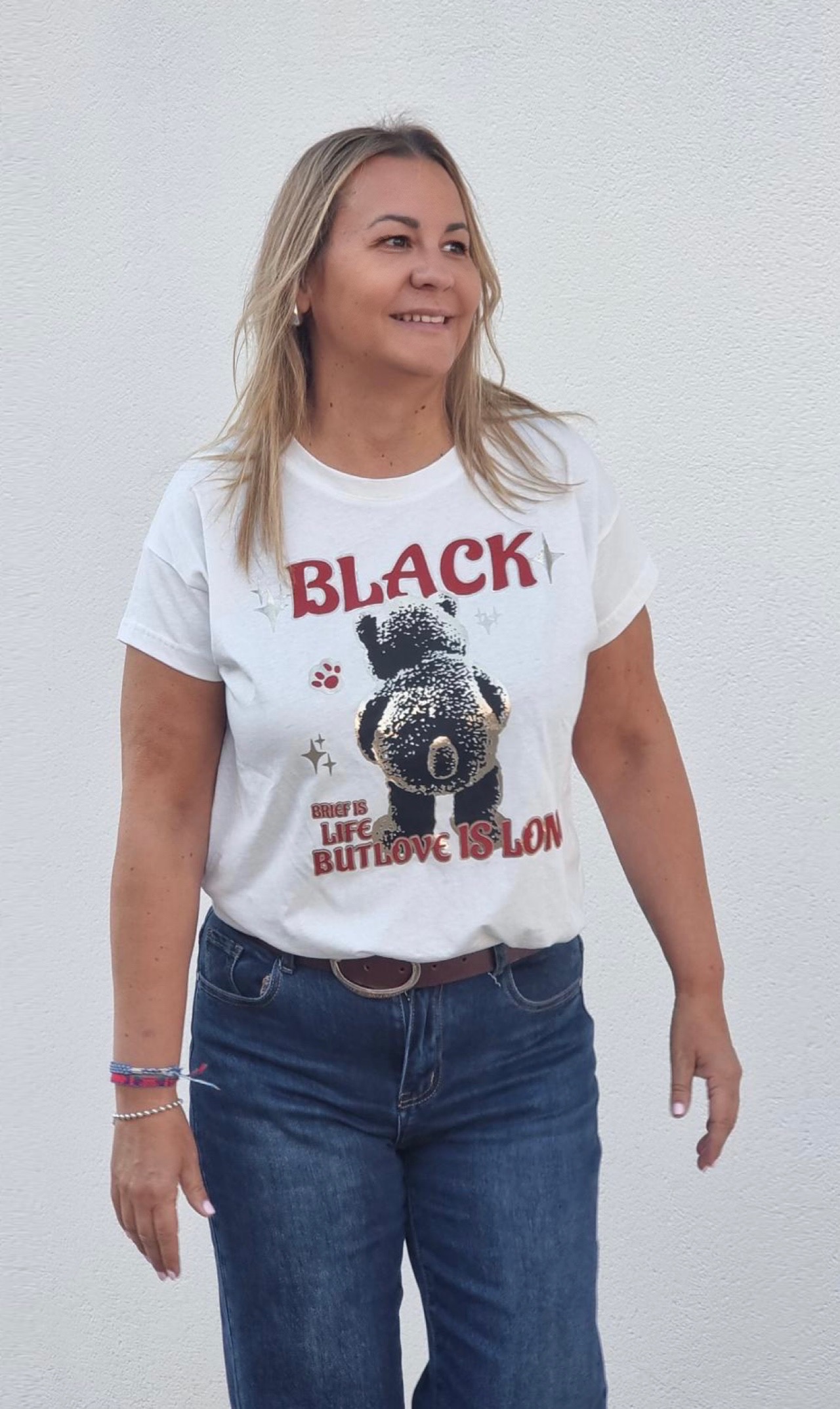 Camiseta de manga corta con estampado original que combina los tonos burdeos, negro, plata y bronce obteniendo así un resultado de los más actual y favorecedor. Te ayudará a realizar miles de combinaciones con todas tus prendas.