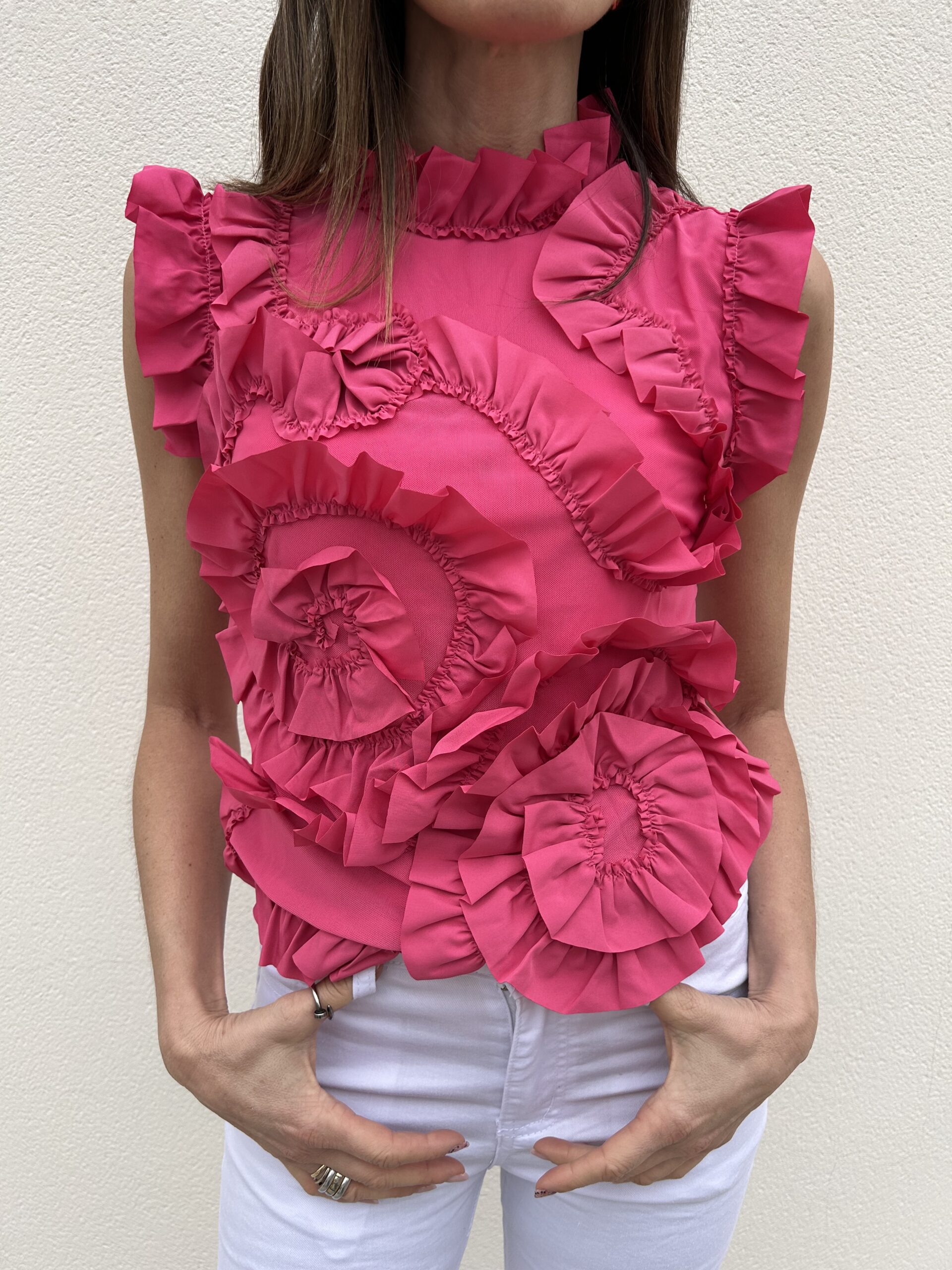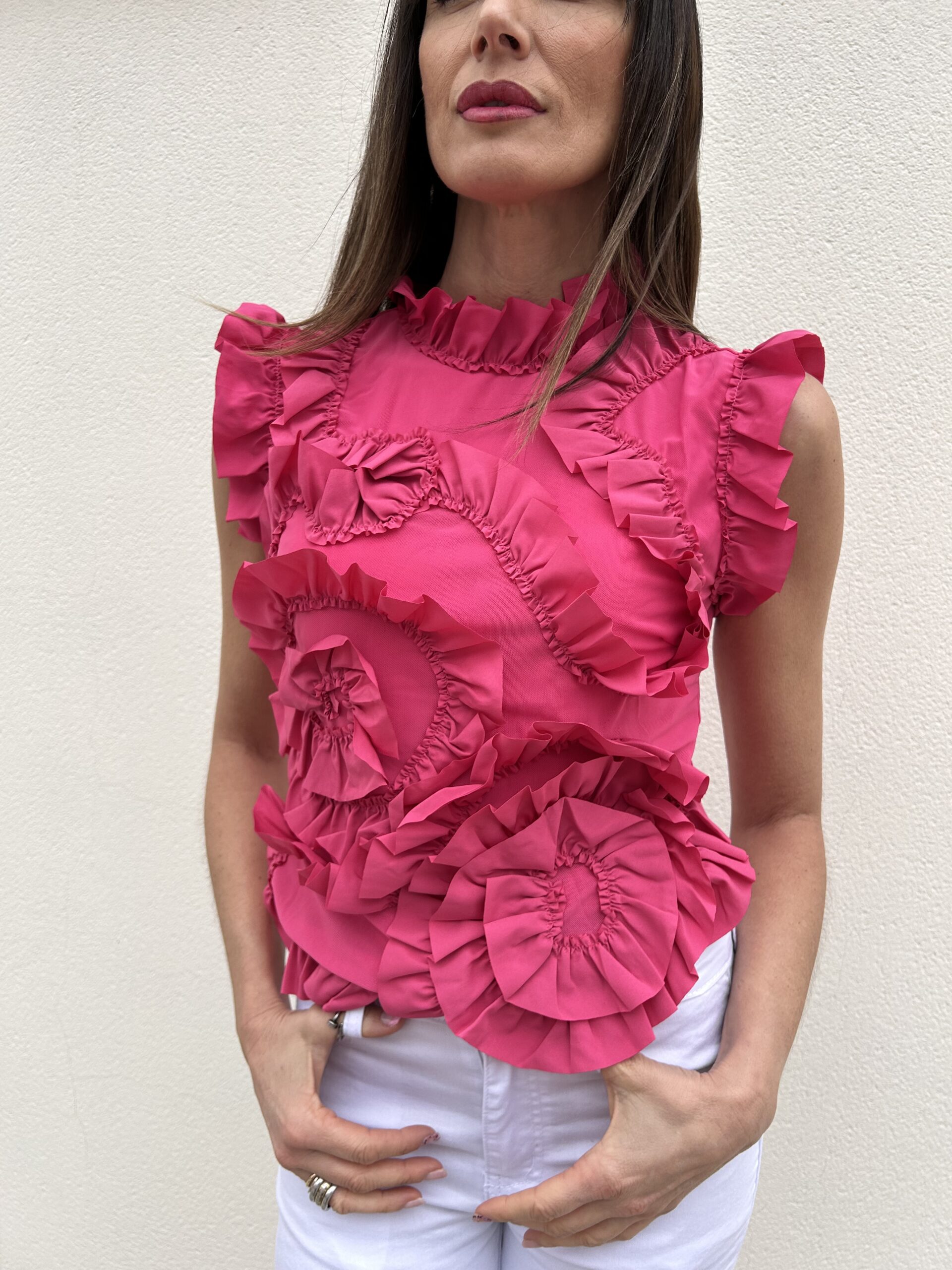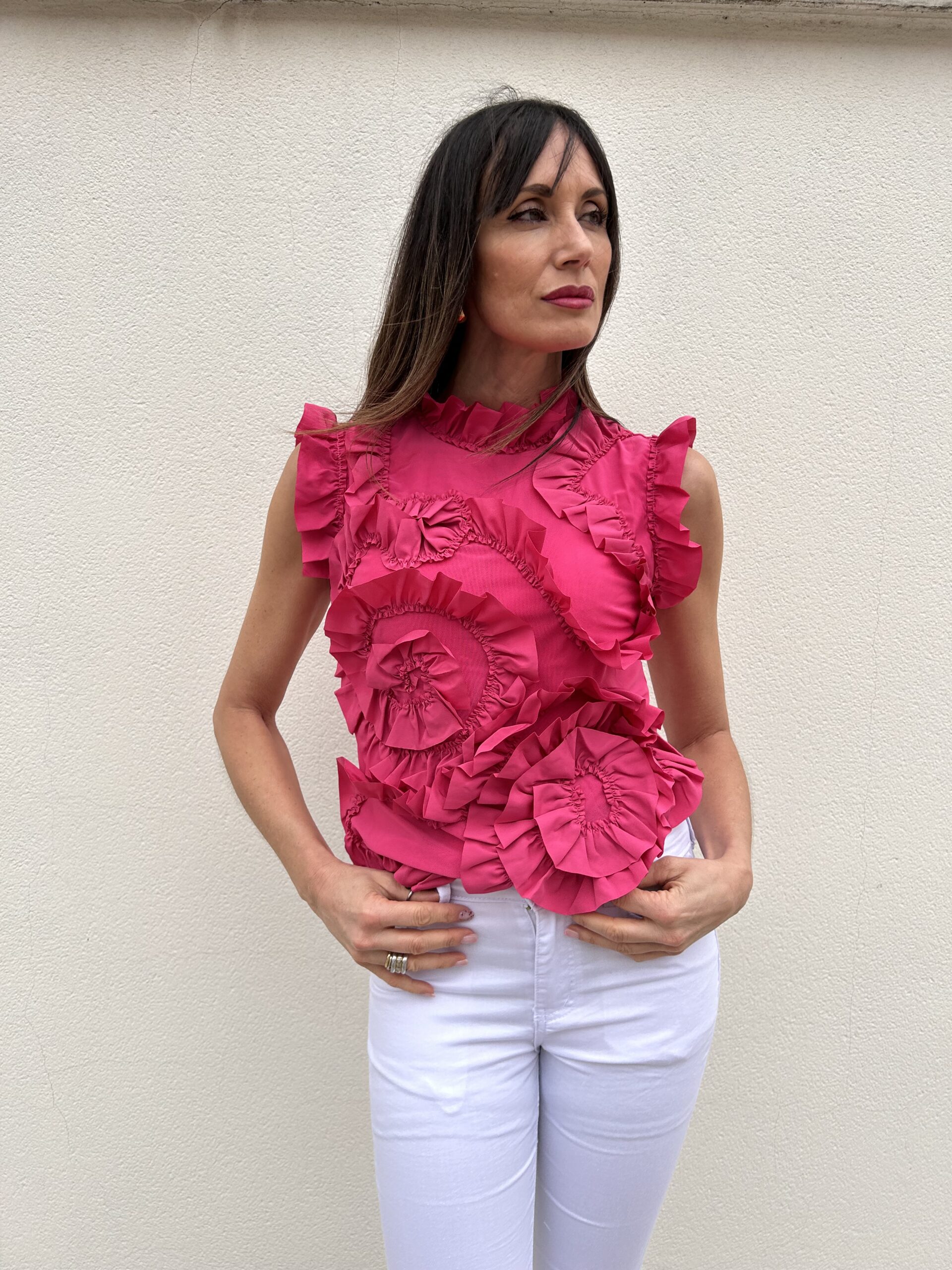 Espalda ligeramente transparente. y detalle de volantes en cuello y mangas.