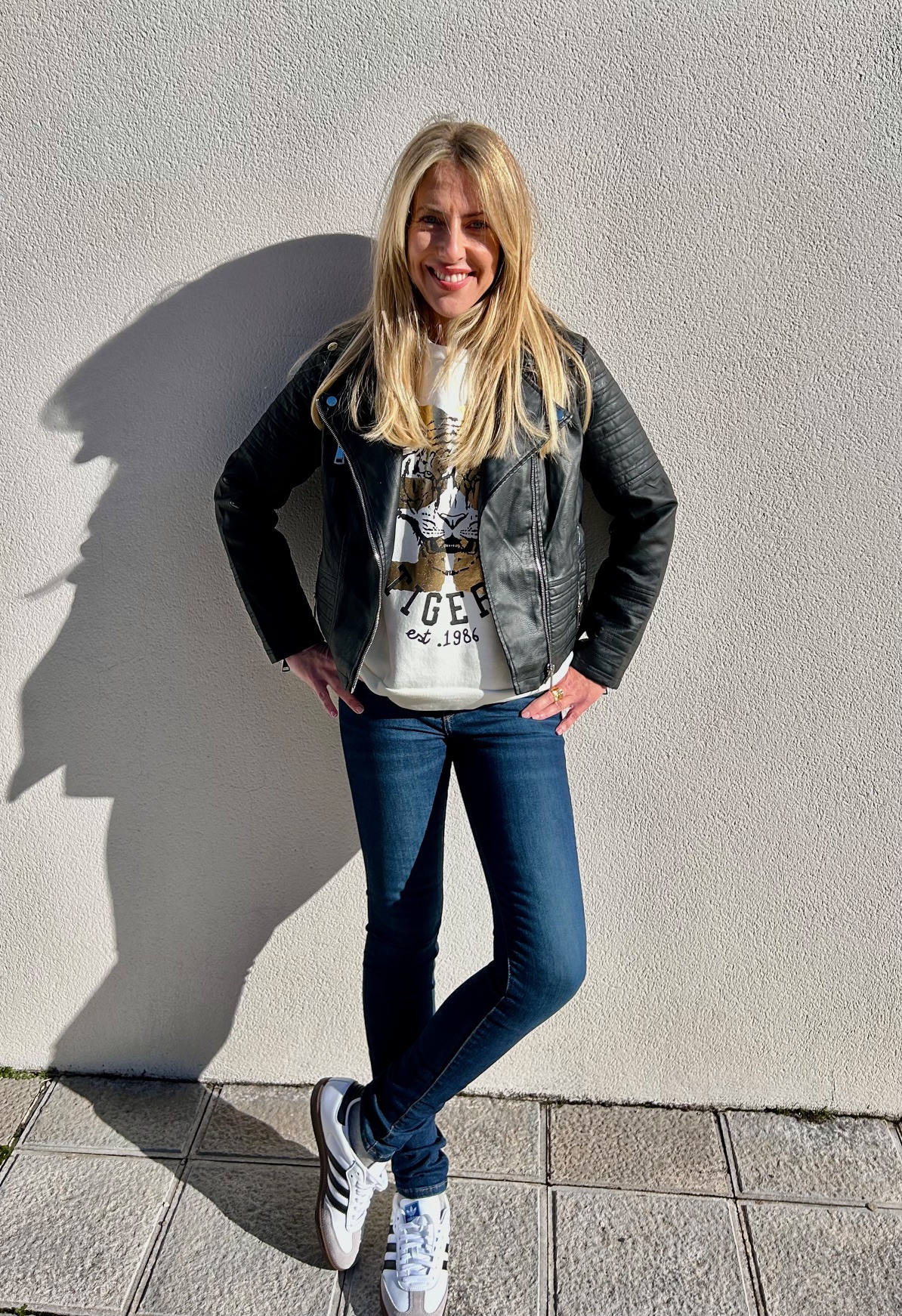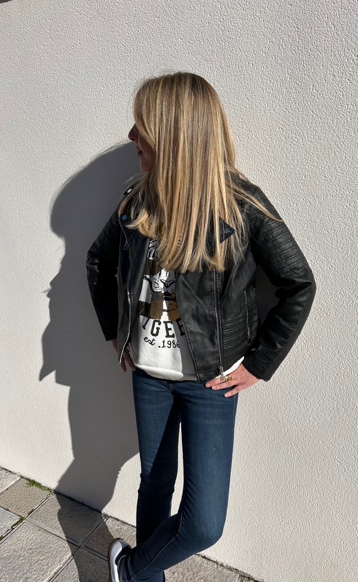 Cazadora estilo biker de polipiel, con cremalleras y botones automáticos plateados.