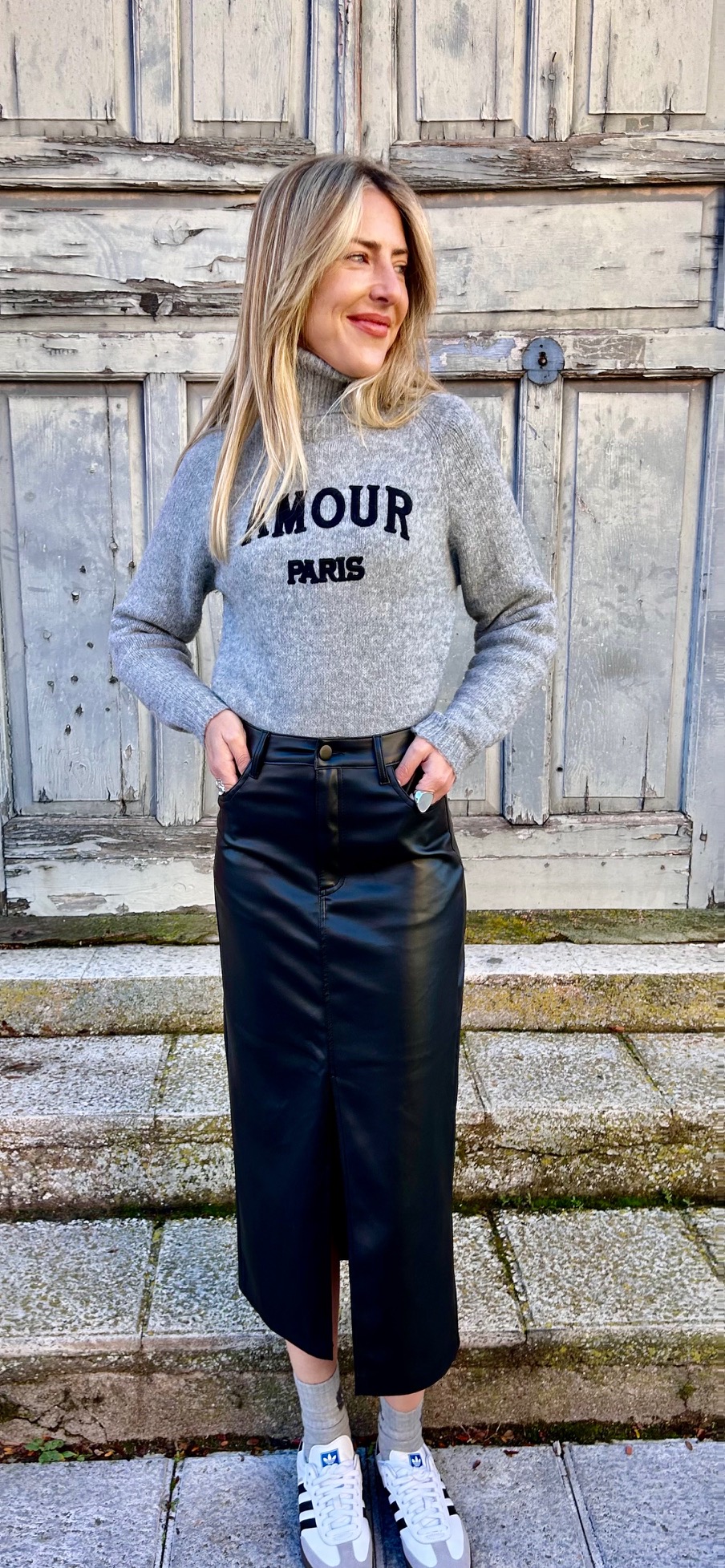 Falda polipiel color negro, largo midi, con abertura delantera. Bolsillos laterales y traseros. Talla ligeramente grande, conviene pedir una talla menos de la habitual ya que es elástica.