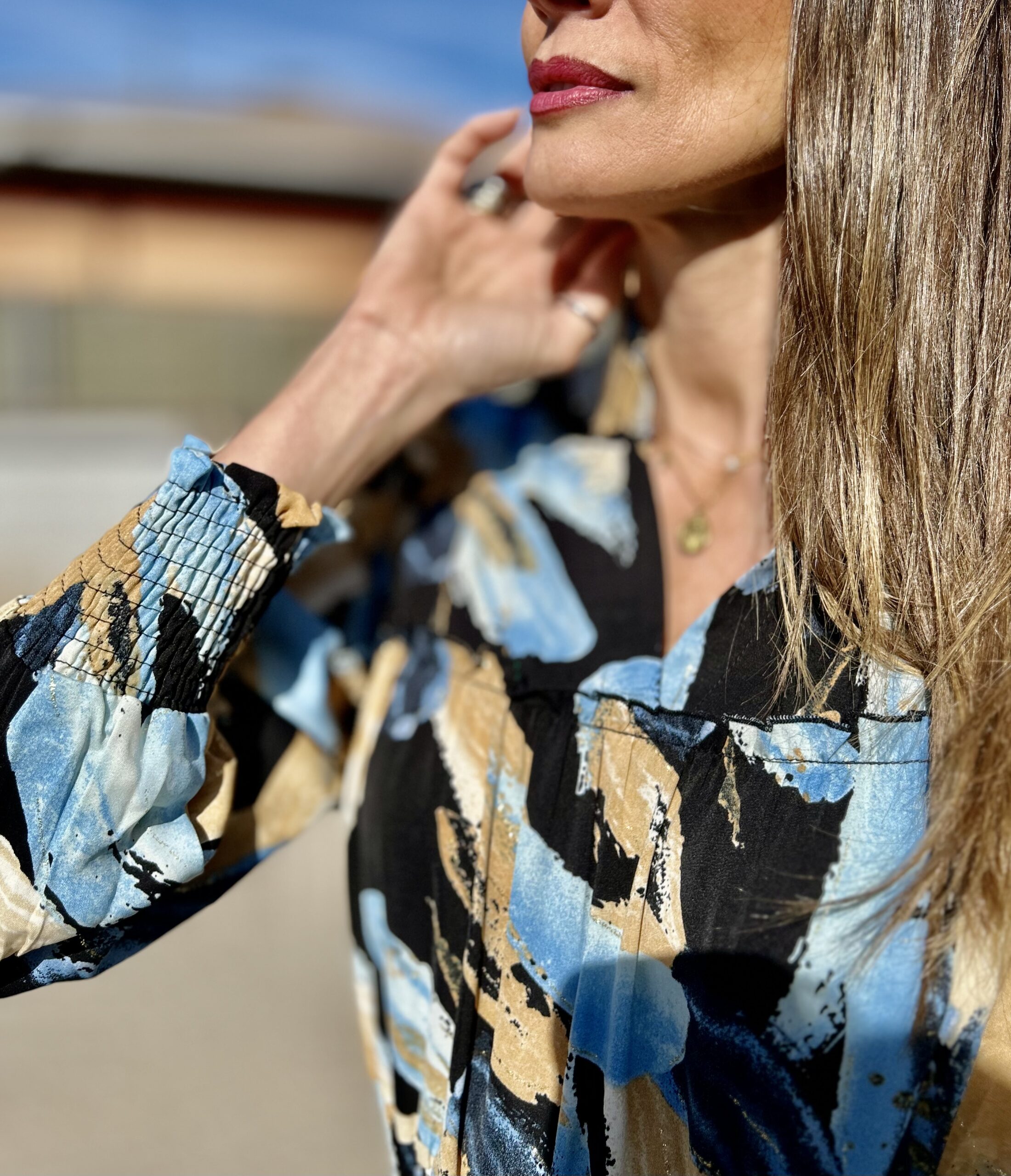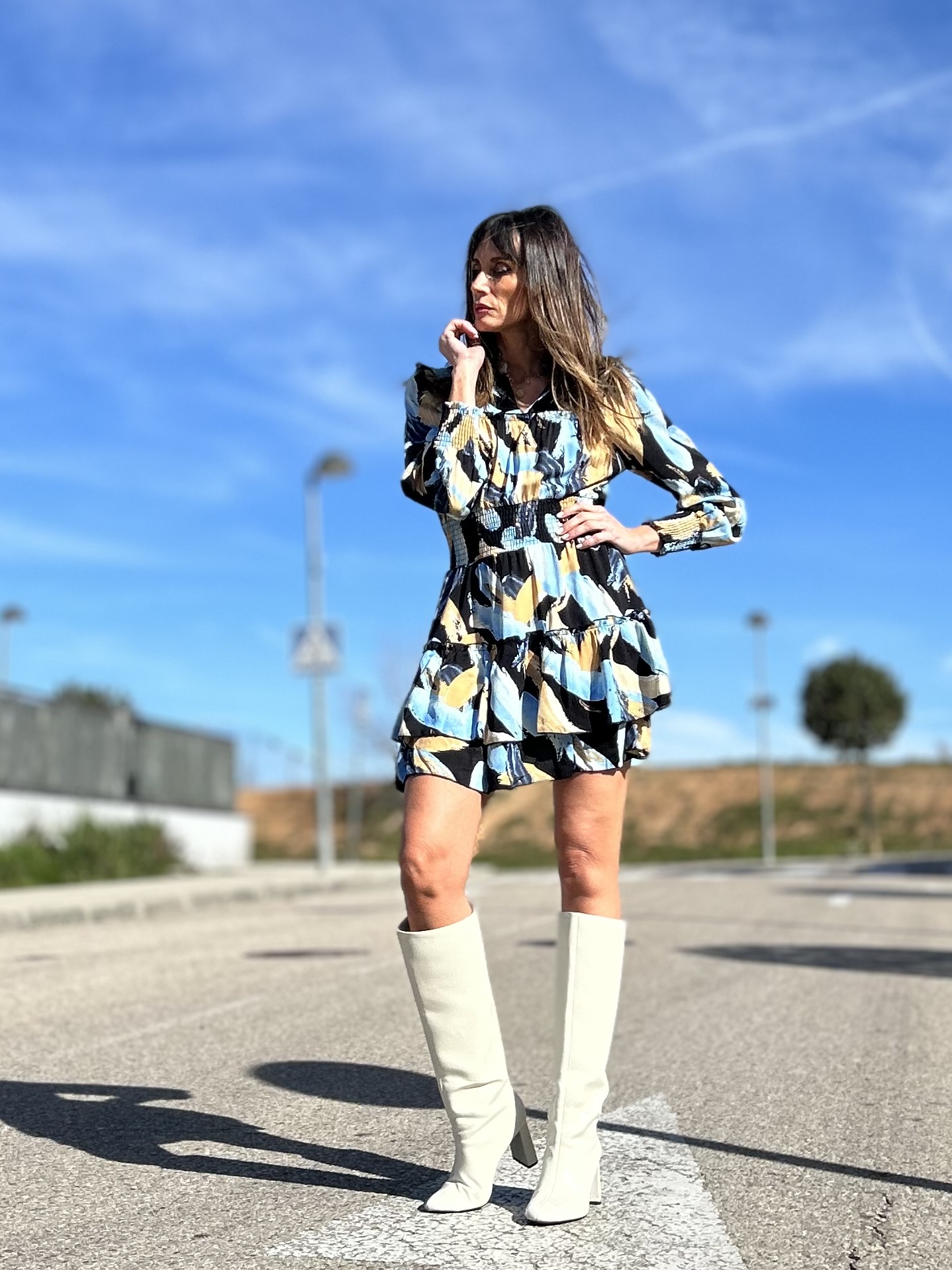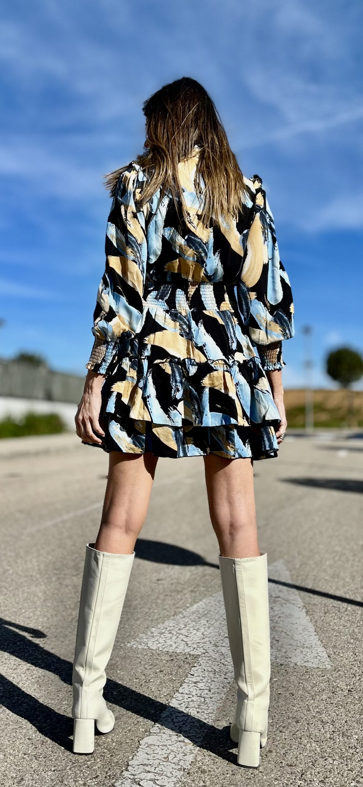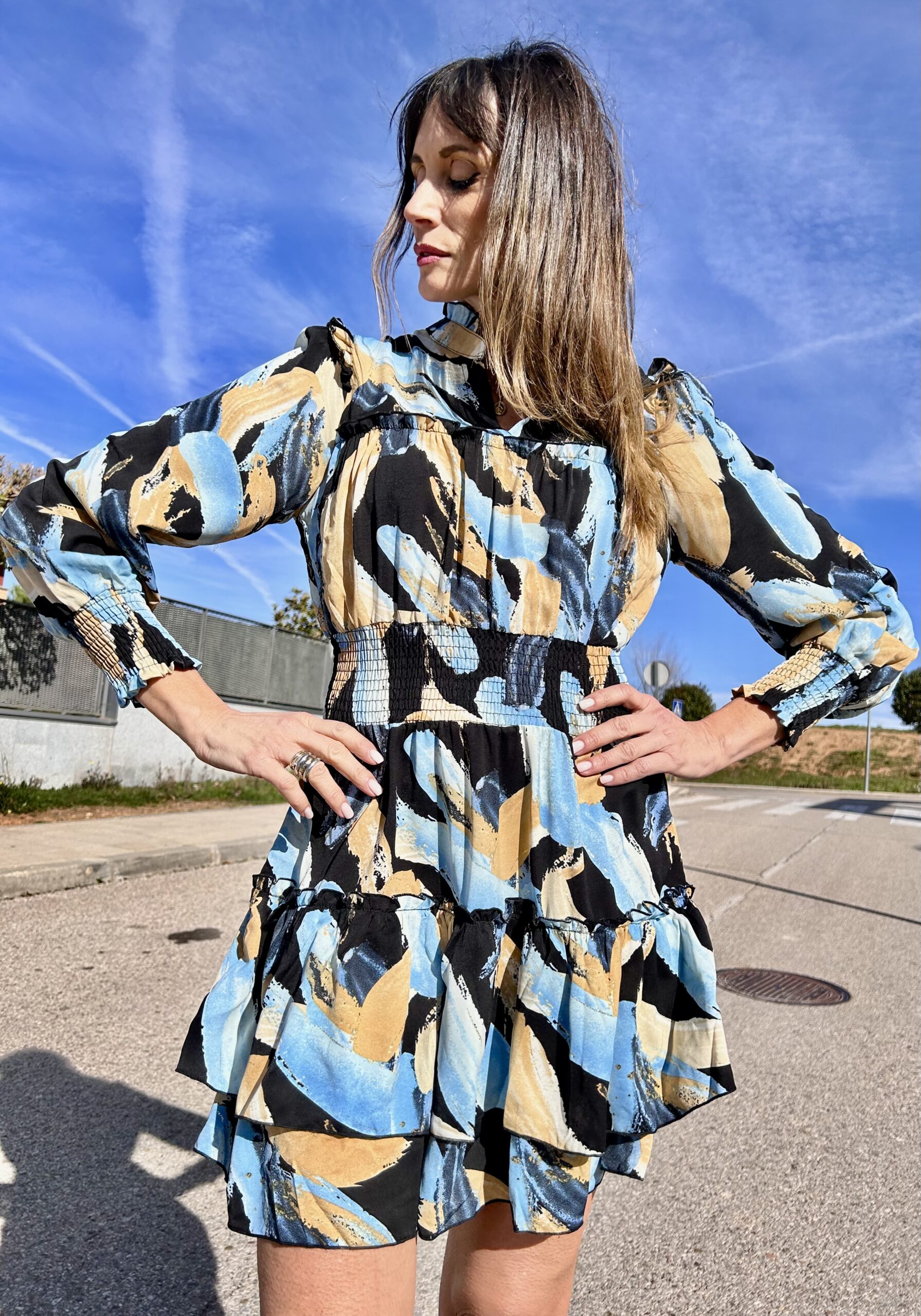 Vestido corto estampado de manga larga. Cintura y puños ajustables. Falda en capas.